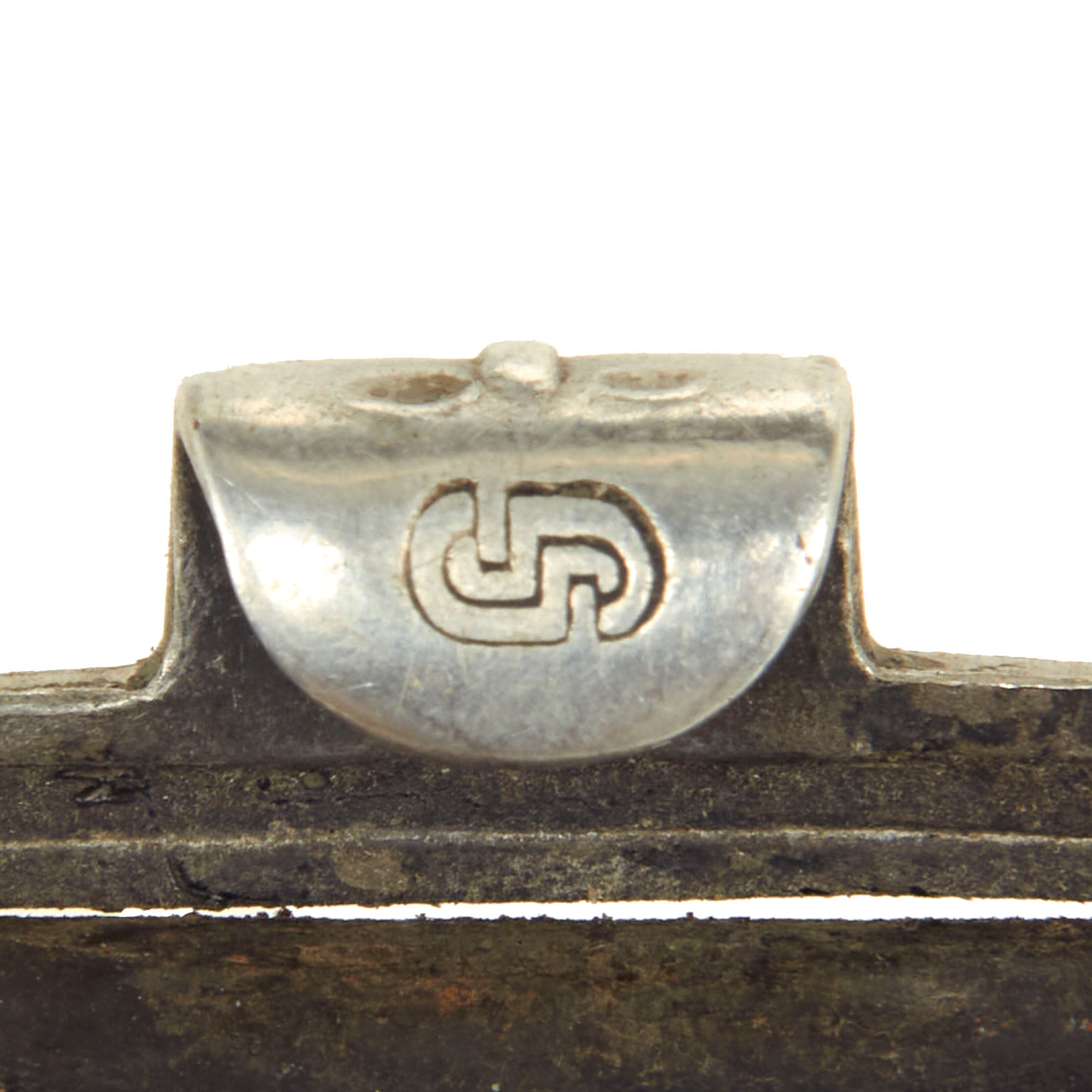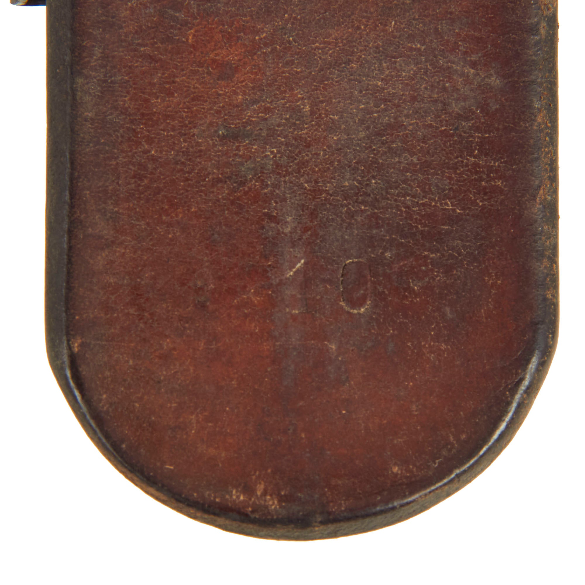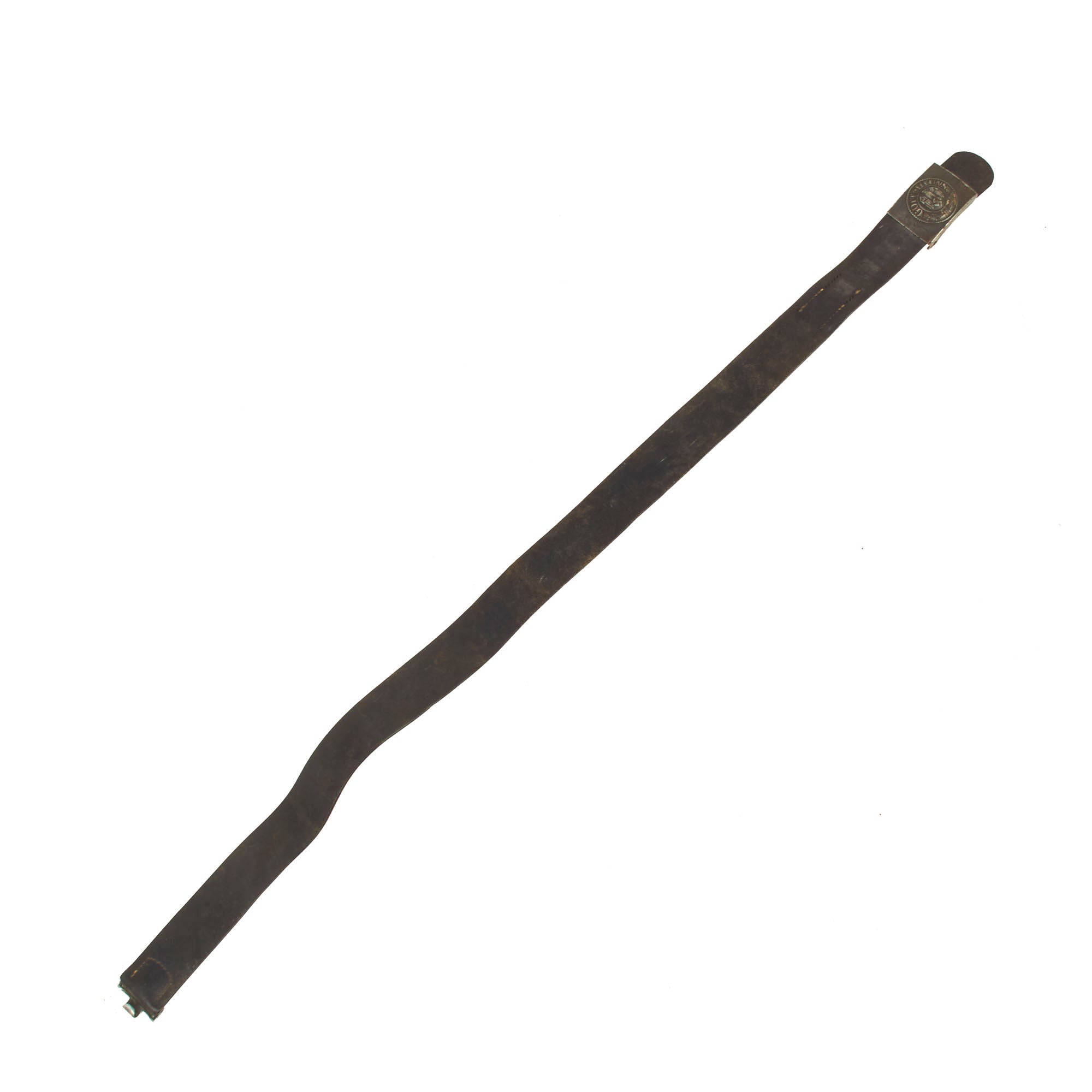 The leather belt is in very good used condition, and measures about 40 inches in overall length. It is stamped faintly on the buckle end with 100, for 100cm (39.3inches) and is an early example, with an aluminum maker marked end clip. The leather still retains the black finish on the exterior, with the interior brown. There are no maker markings that we can see, but they may have been worn away from use. The stitching on the leather tab was partly removed, and two more sets of holes added, as it looks to have been too big for the last wearer.