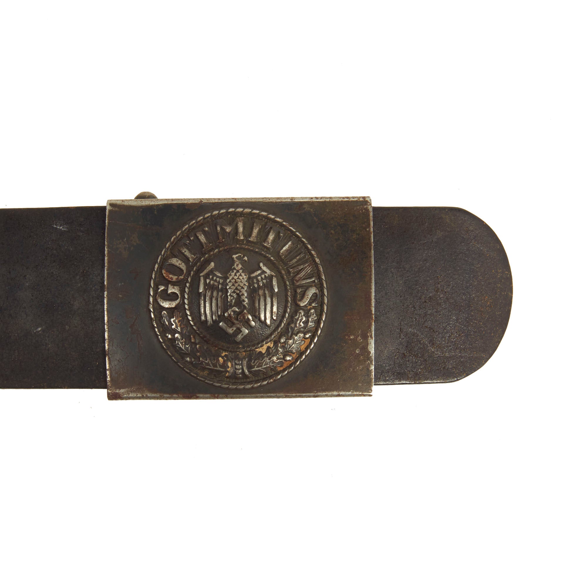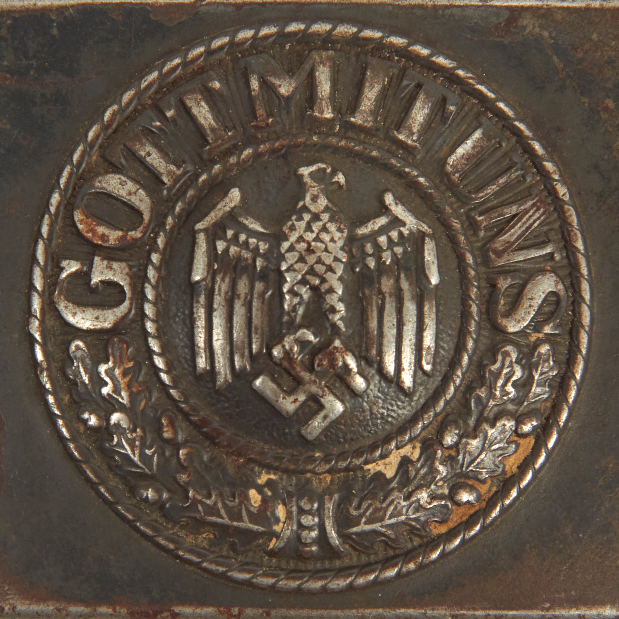 The Buckle design features a smooth outer field with central, high relief, embossed Wehrmacht eagle with down swept wings to slightly domed center, encompassed by an oak-leaf cluster to bottom and bears the Wehrmacht motto GOTT MIT UNS, (God [is] with us), on the top. The oak-leaf cluster and script are on a ribbed background and encircled by an inner and outer simulated twisted rope border. This design is essentially identical to the heer army buckle. except for the color. The buckle is in good service worn condition, with about 60% of the navy blue paint retained on the front, and a lot more on the back, which allows us to definitively identify it as a Coastal Artillery buckle. There are no markings on the buckle, and the leather tab is unfortunately missing.