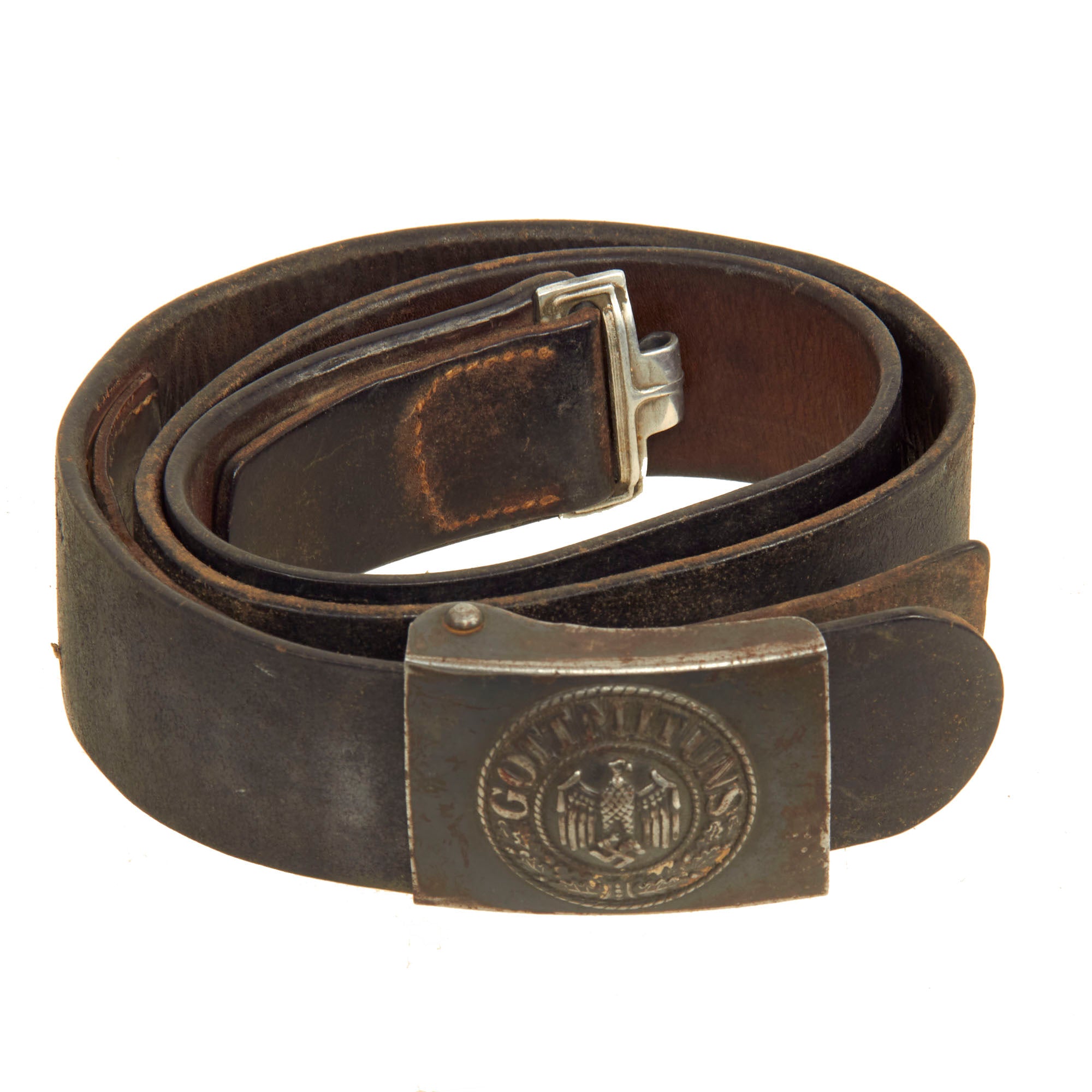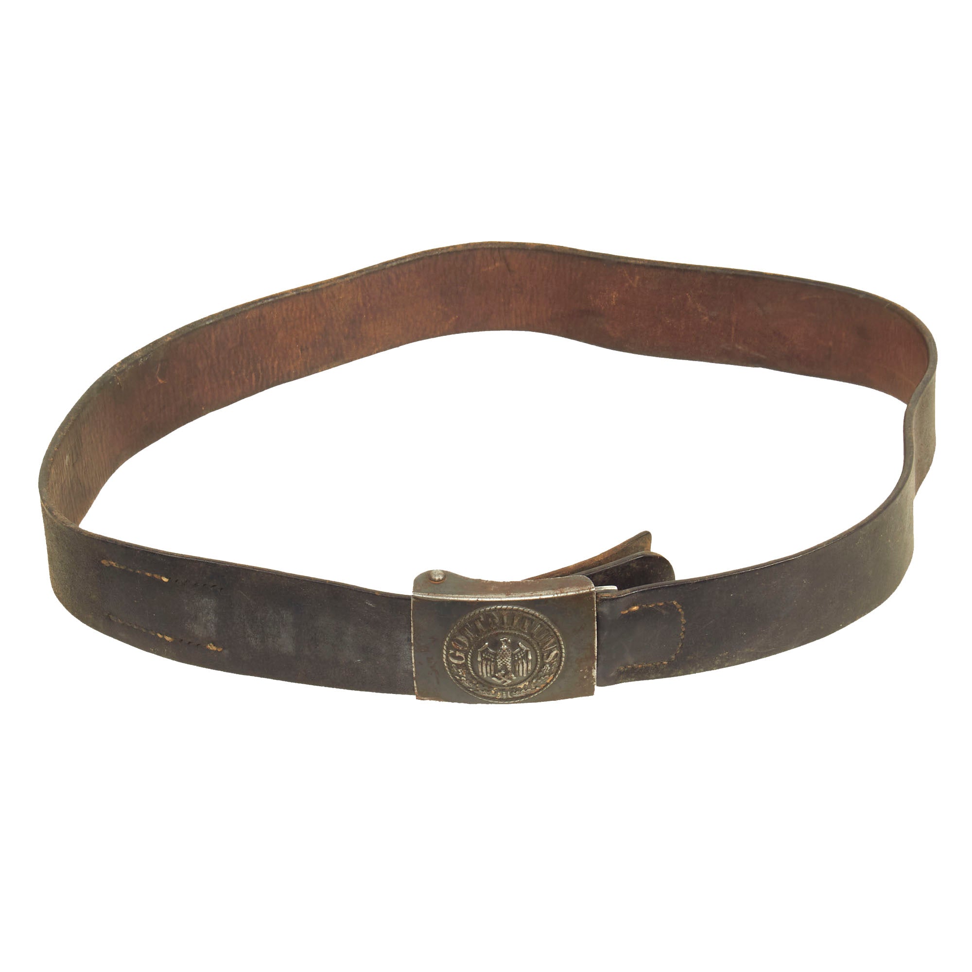 Original Item: Only One Available. This is a very nice service used condition some what rare WWII German Kriegsmarine (Navy) EM/NCO's Steel Belt Buckle (Koppelschloß), complete with a Kriegsmarine marked leather belt. The Navy used the standard Wehrmacht pattern buckles, but instead of the Field Gray color used by the Heer, they usually painted them a gold color. However, this was deemed most likely not the best color to use in Küstenartillerie (Coastal artillery) emplacements, so in 1937 they began to issue these dark navy blue belt buckles instead.