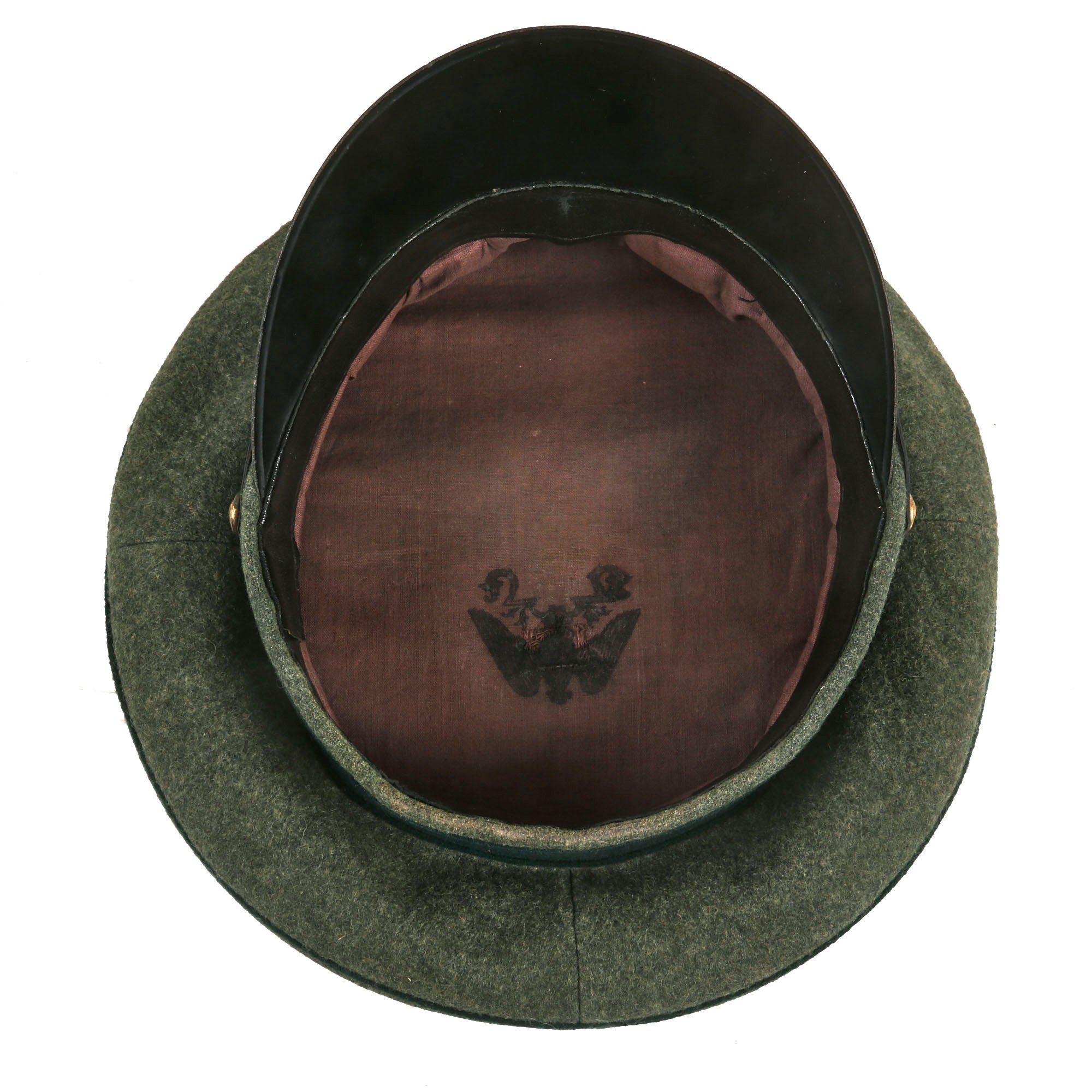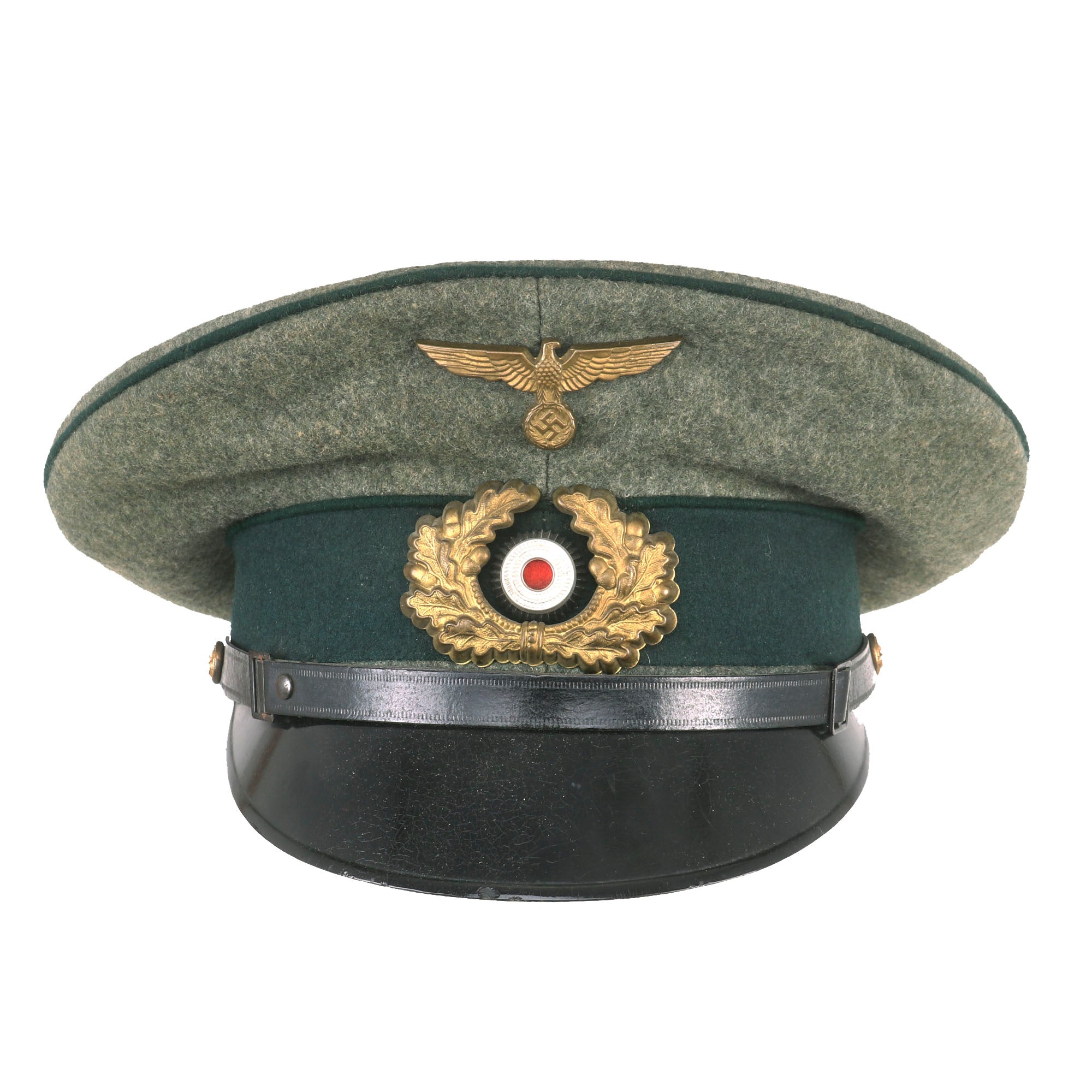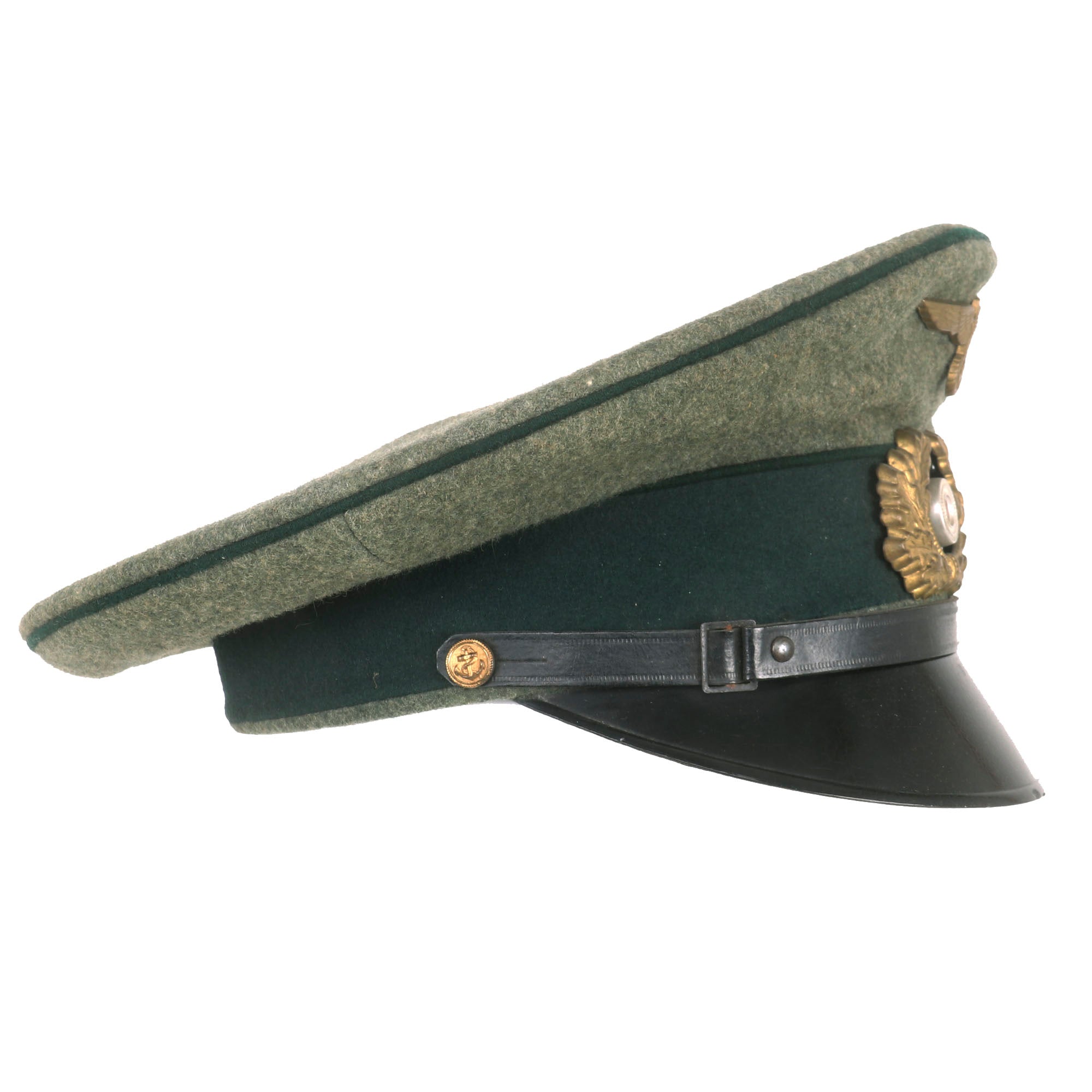 Original Item: Only One Available. This is a lovely service used condition German WWII Kriegsmarine Küstenartillerie (Navy Coastal Artillery) EM/NCO Schirmmütze Visor Cap. This example still retains the crown support stiffener ring, so it is not a “crushed” example. The cap shows high quality fabrication, made with typical feldgrau (Field Gray) green / gray wool with a flaschengrün (dark bottle-green) "badge cloth" band and a traditional high front, with matching bottle green piping around the top. This is very similar to the Army Heer visor cap, except that there are no corps colors around the green band, and the insignia are Kriegsmarine Gold.