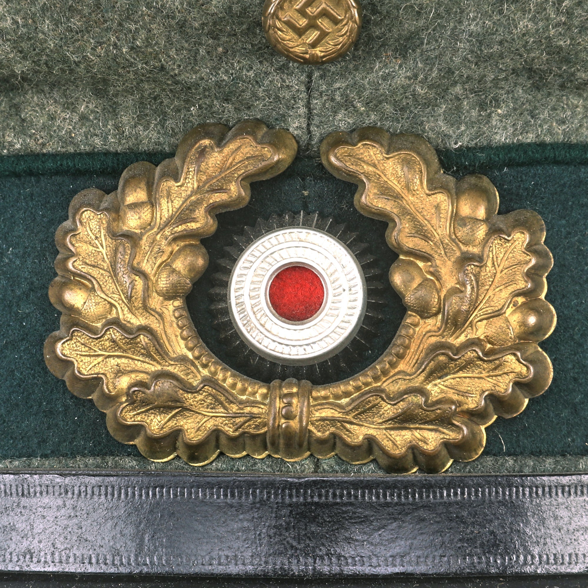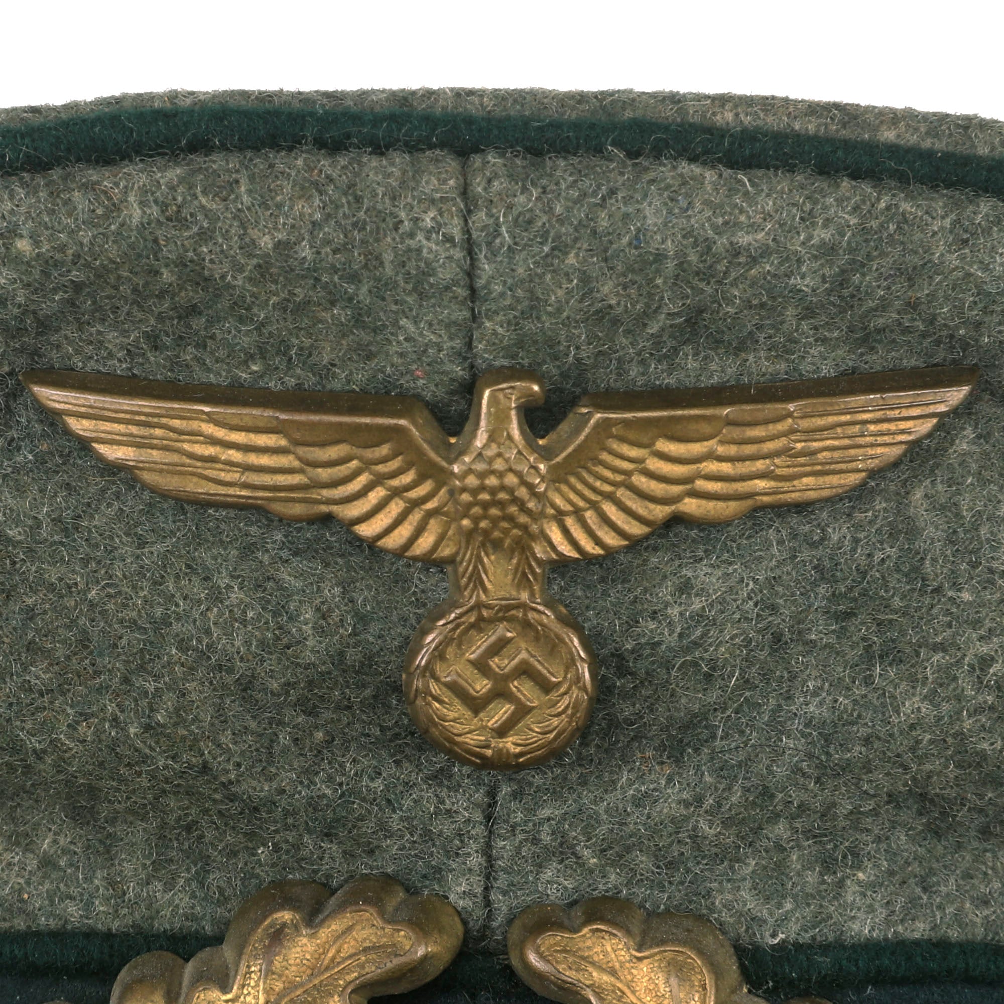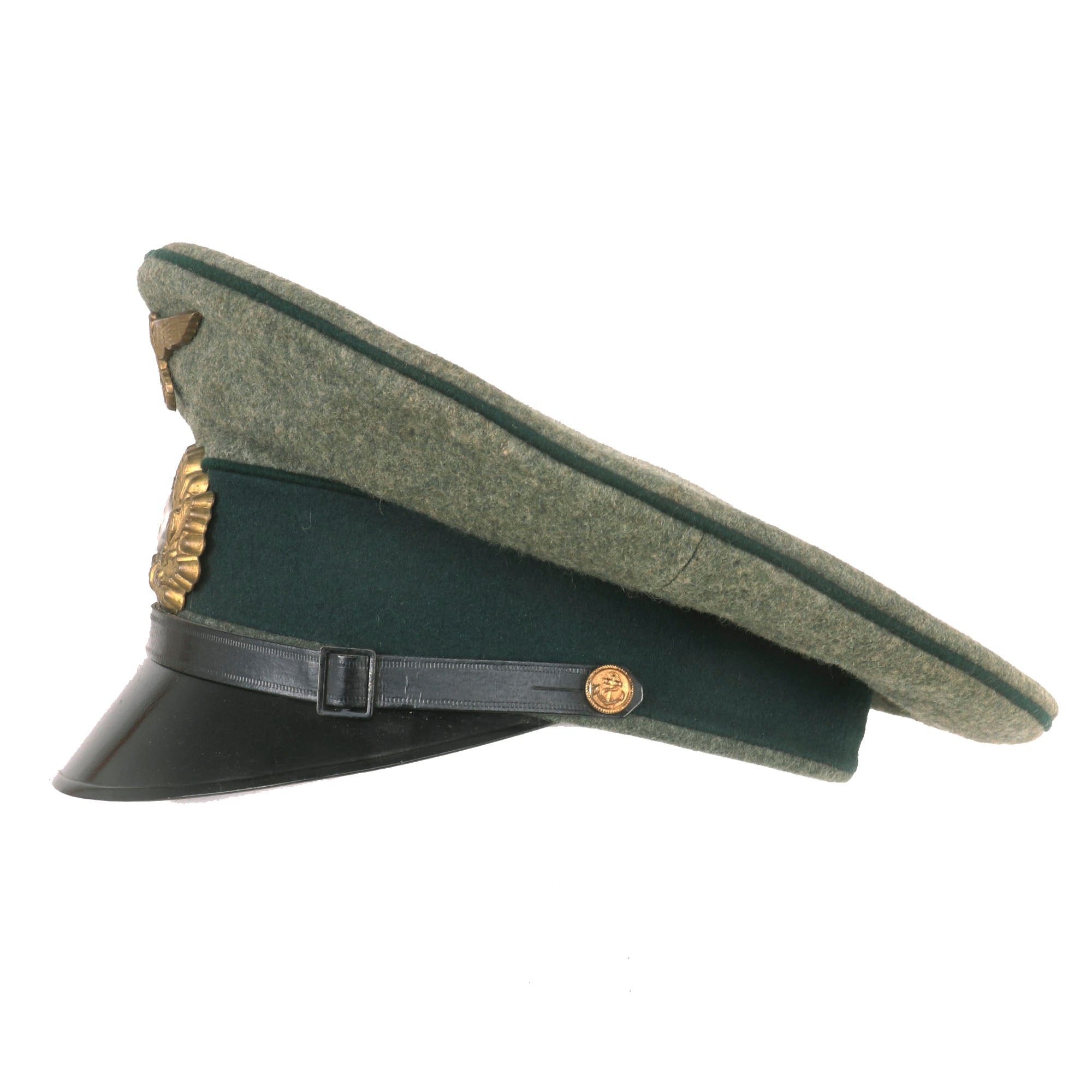 Original Item: Only One Available. This is a lovely service used condition German WWII Kriegsmarine Küstenartillerie (Navy Coastal Artillery) EM/NCO Schirmmütze Visor Cap. This example still retains the crown support stiffener ring, so it is not a “crushed” example. The cap shows high quality fabrication, made with typical feldgrau (Field Gray) green / gray wool with a flaschengrün (dark bottle-green) "badge cloth" band and a traditional high front, with matching bottle green piping around the top. This is very similar to the Army Heer visor cap, except that there are no corps colors around the green band, and the insignia are Kriegsmarine Gold.