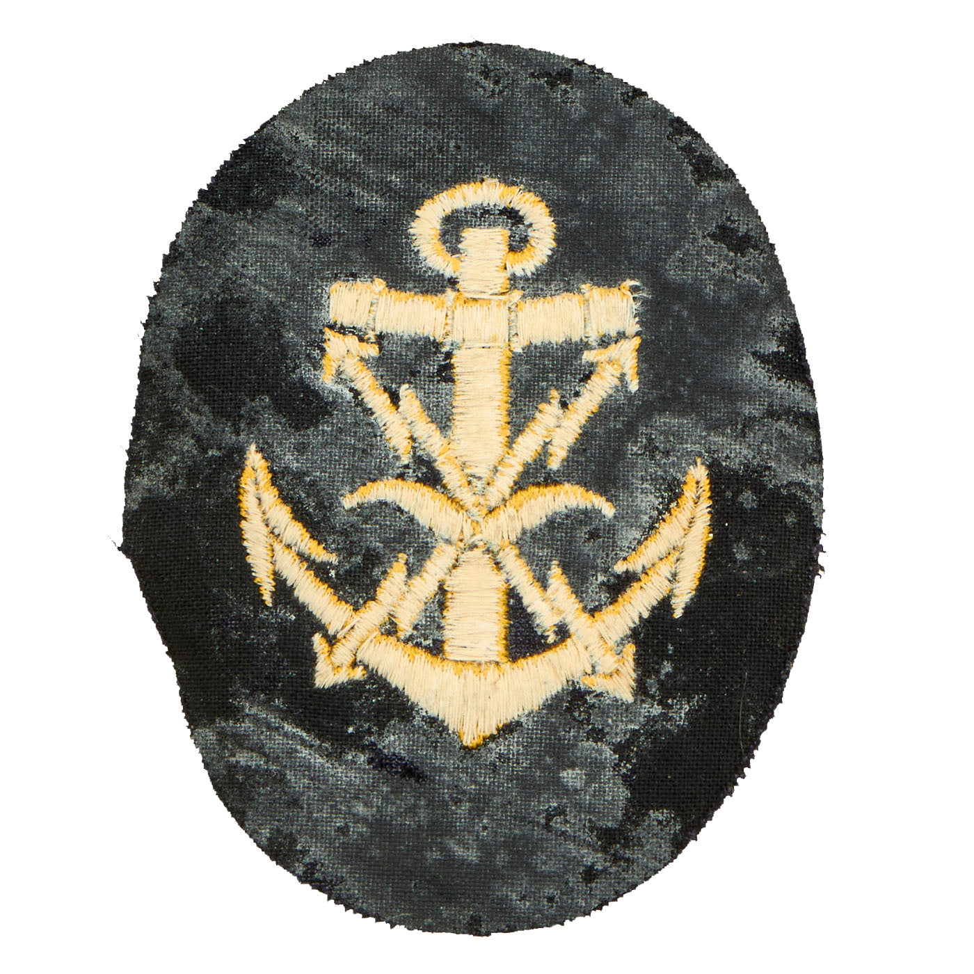 - Teletypist Petty Officer Rating Insignia: On entering Kriegsmarine service all personnel were assigned and trained for a specific career. These careers consisted of a wide variety of specialty trades and functions with some of the careers restricted to certain rank groups. On successful completion of the appropriate training, personnel were issued distinctive career insignia to be worn on the upper left sleeve of the uniforms. For EM/NCO’s the career insignia could be worn combined with the rank insignia or as separate insignia. Enlisted ranks of Matrose up to and including Hauptgefreiter career insignia were generally embroidered on small, round, bases while NCO ranks of Maat up to and including Oberdeckoffizier career insignia were on larger, vertically oval bases and could come in embroidered or stamped alloy versions. Regulations dictated that the base color of the insignia was to match the color of the uniform it was worn on. This career patch is in lovely, unused condition.