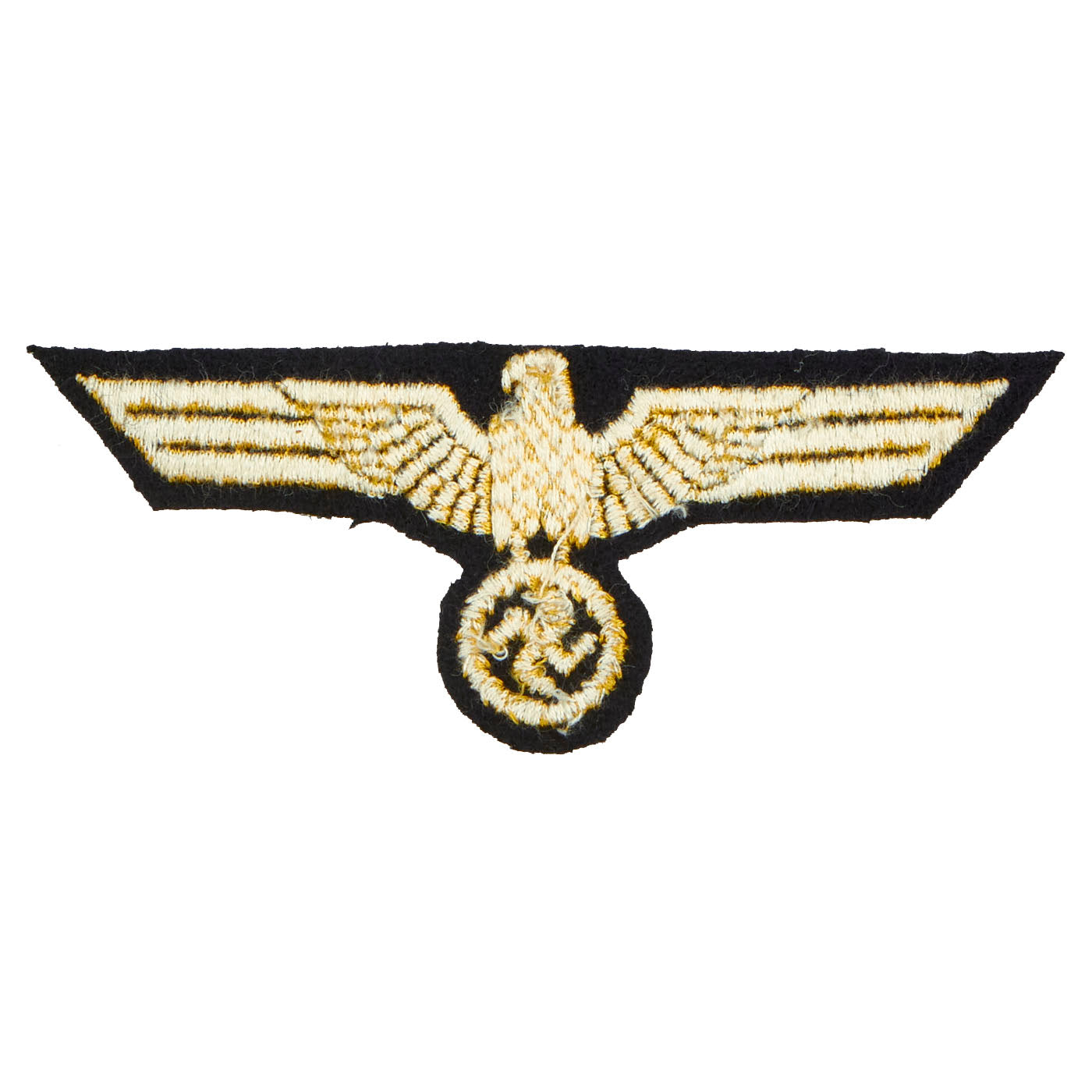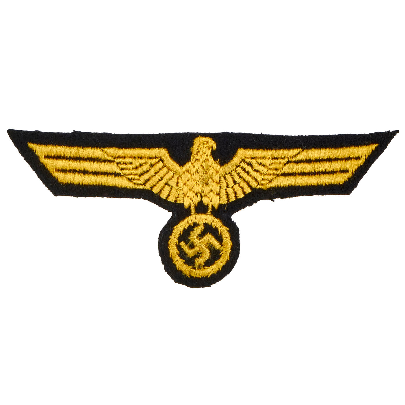 - Kriegsmarine EM/NCM Embroidered Breast Eagle: The Kriegsmarine’s version of the national eagle was identical to the army version except for the coloration with the army utilizing silver, white and grey eagles while the Kriegsmarine utilized golden yellow eagles. The only exceptions in the coloration of the Kriegsmarine eagles was that personnel serving in the Administrative branch utilized a silver eagle while eagles worn on the white jumper shirts were in cornflower blue. Generally, office ranks used hand embroidered breast eagles while NCO/Maanschaften ranks used machine embroidered or machine woven breast eagles. Besides the hand embroidered, machine embroidered and machine woven breast eagles the Kriegsmarine also utilized removable, metal breast eagles on a limited basis. The metal breast eagles were generally restricted to Officer ranks and were worn on the white tunic, the white mess jacket and the tropical brown and white tunics as opposed to the metal breast eagles utilized by the German army which were only worn on the white summer tunic. This embroidered example is in unused condition.