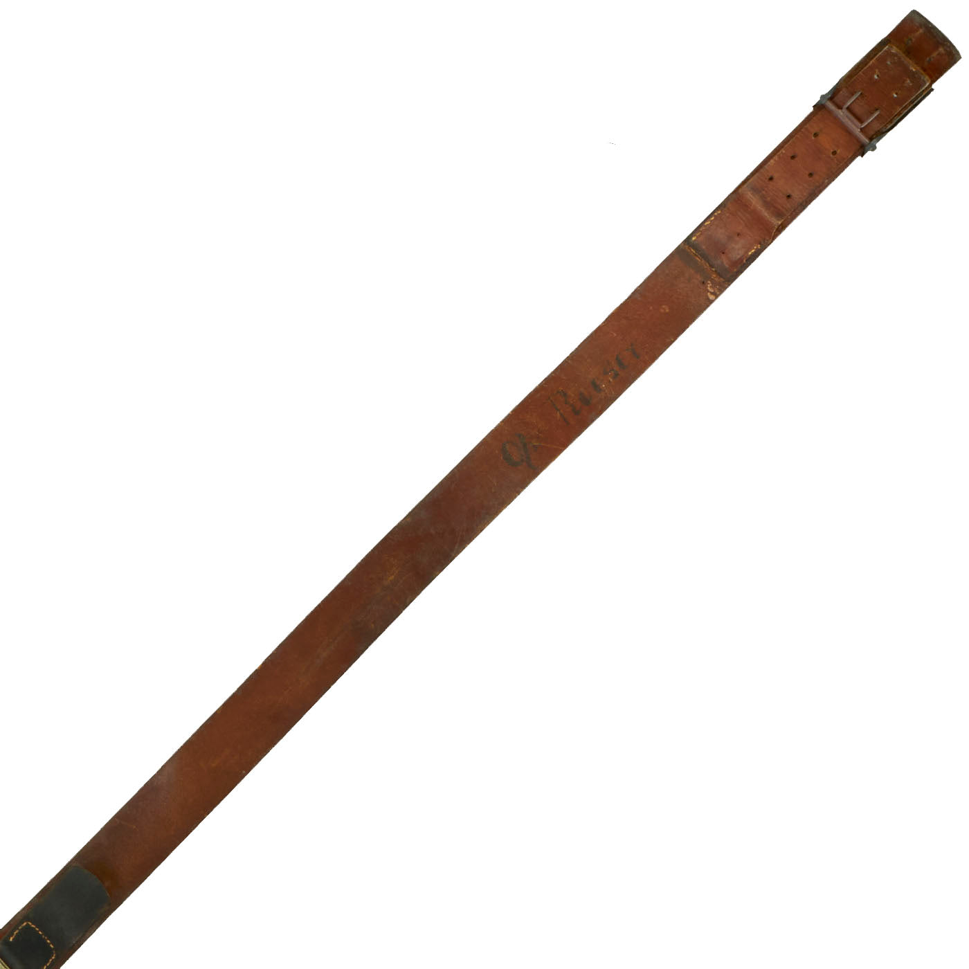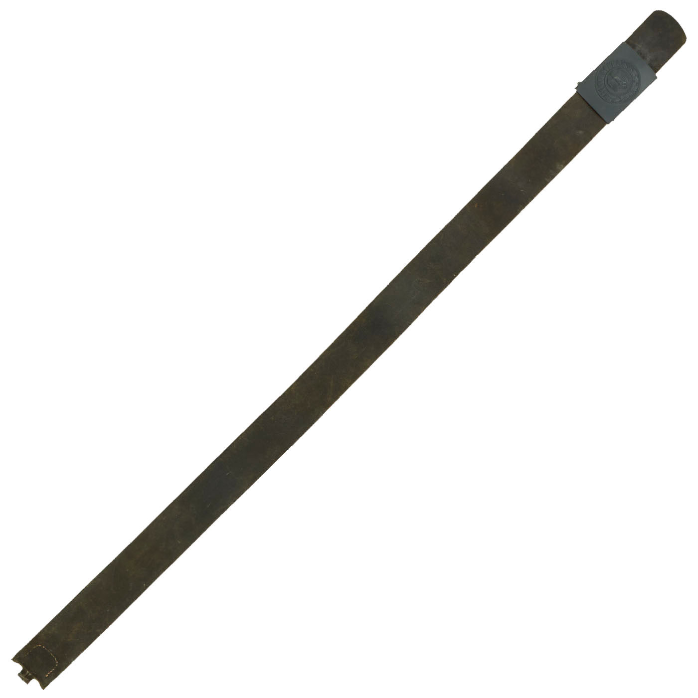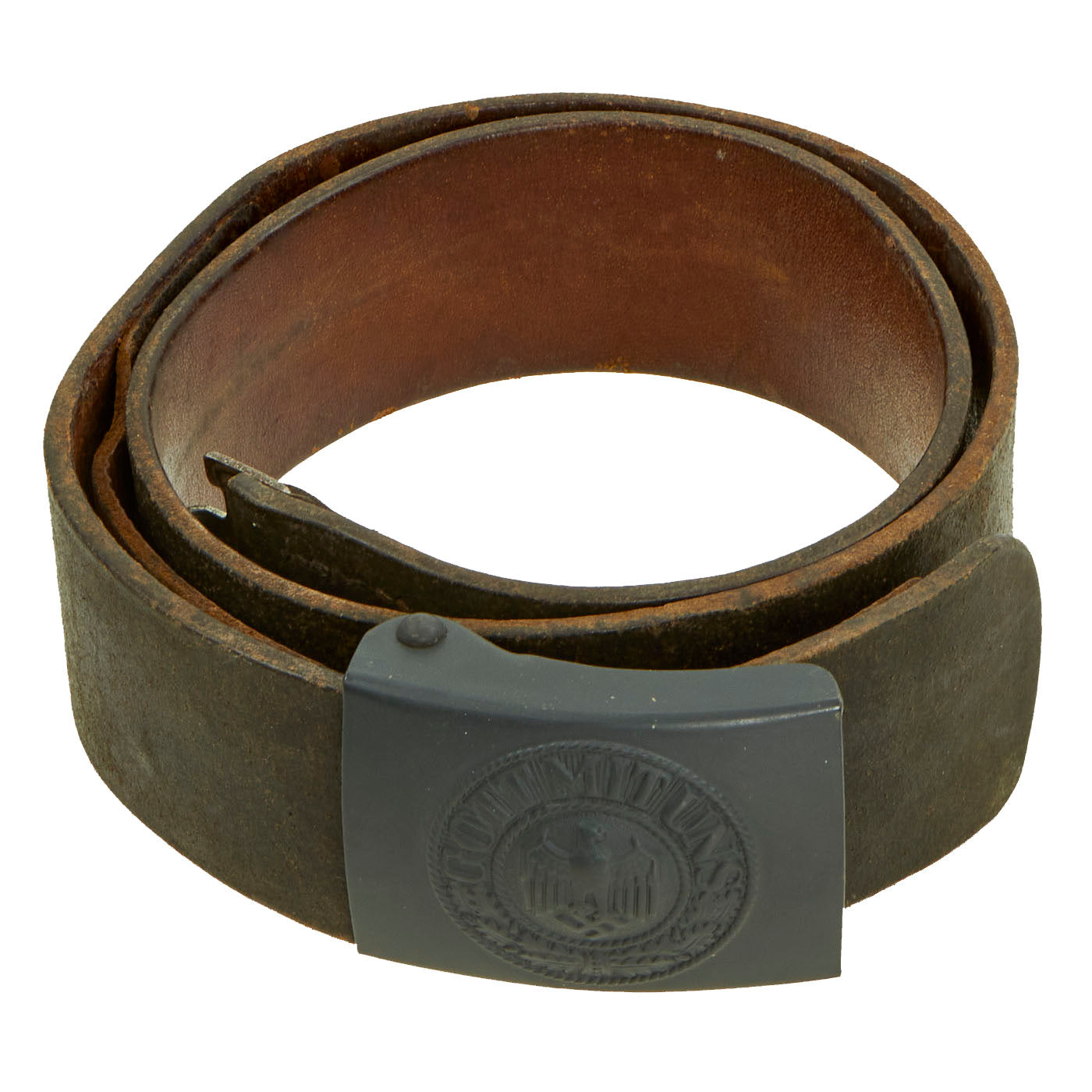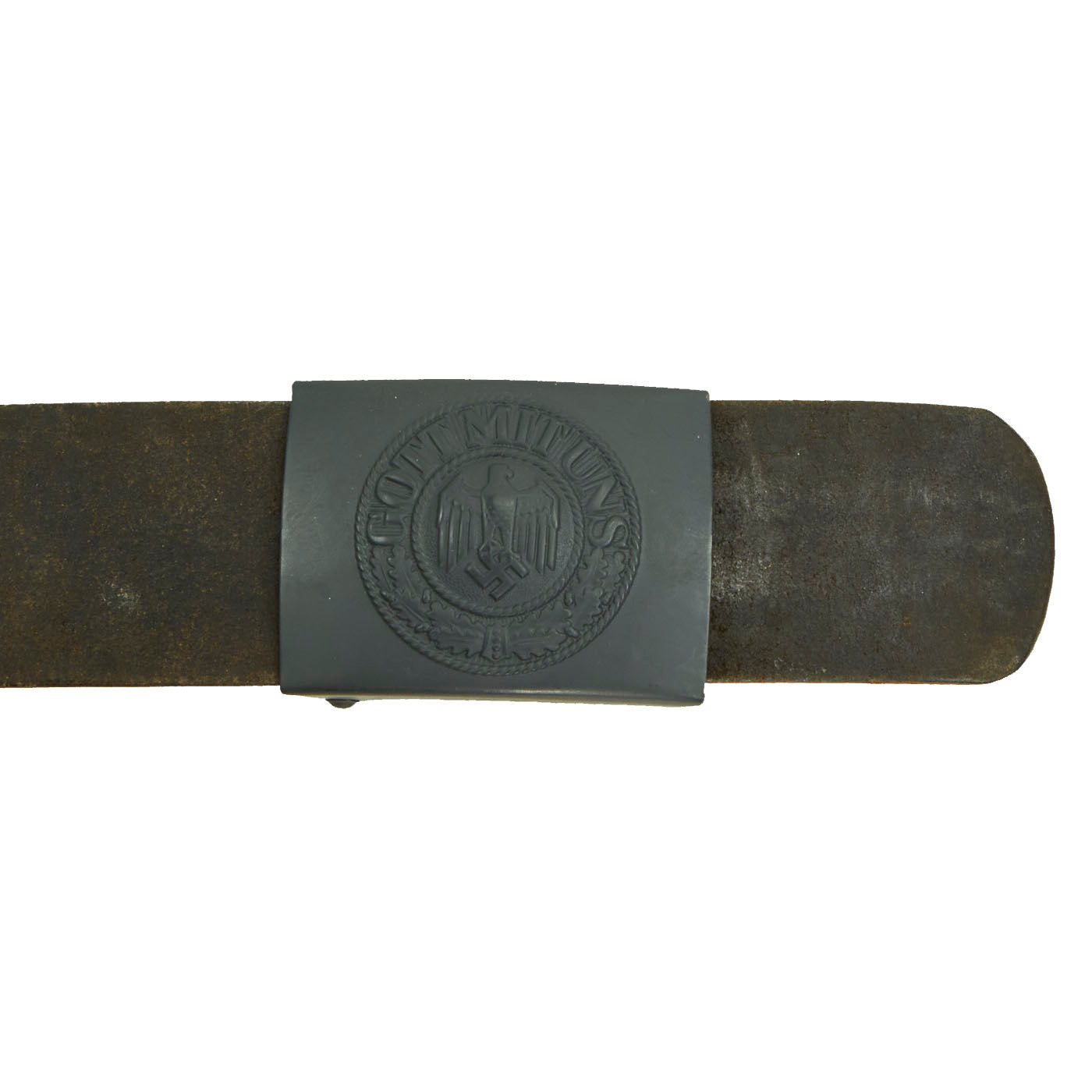 The Buckle design features a smooth outer field with central, high relief, embossed Wehrmacht eagle with down swept wings to slightly domed center, encompassed by an oak-leaf cluster to bottom and bears the Wehrmacht motto GOTT MIT UNS, (God with us), on the top. The oak-leaf cluster and script are on a ribbed background and encircled by an inner and outer simulated twisted rope border. This is a great field gray painted steel construction box buckle with a smooth background. The buckle is in great condition, with what appears to be a well retained paint or possibly repaint. The back of the buckle is nicely stamped with maker mark JFS for Josef Feix & Söhne of Gablonz, in the so-called Sudetenland. The leather tab, which would often be on buckles by this maker, is unfortunately missing. Belt has a makers mark but is unable to be read. Total length is 35”