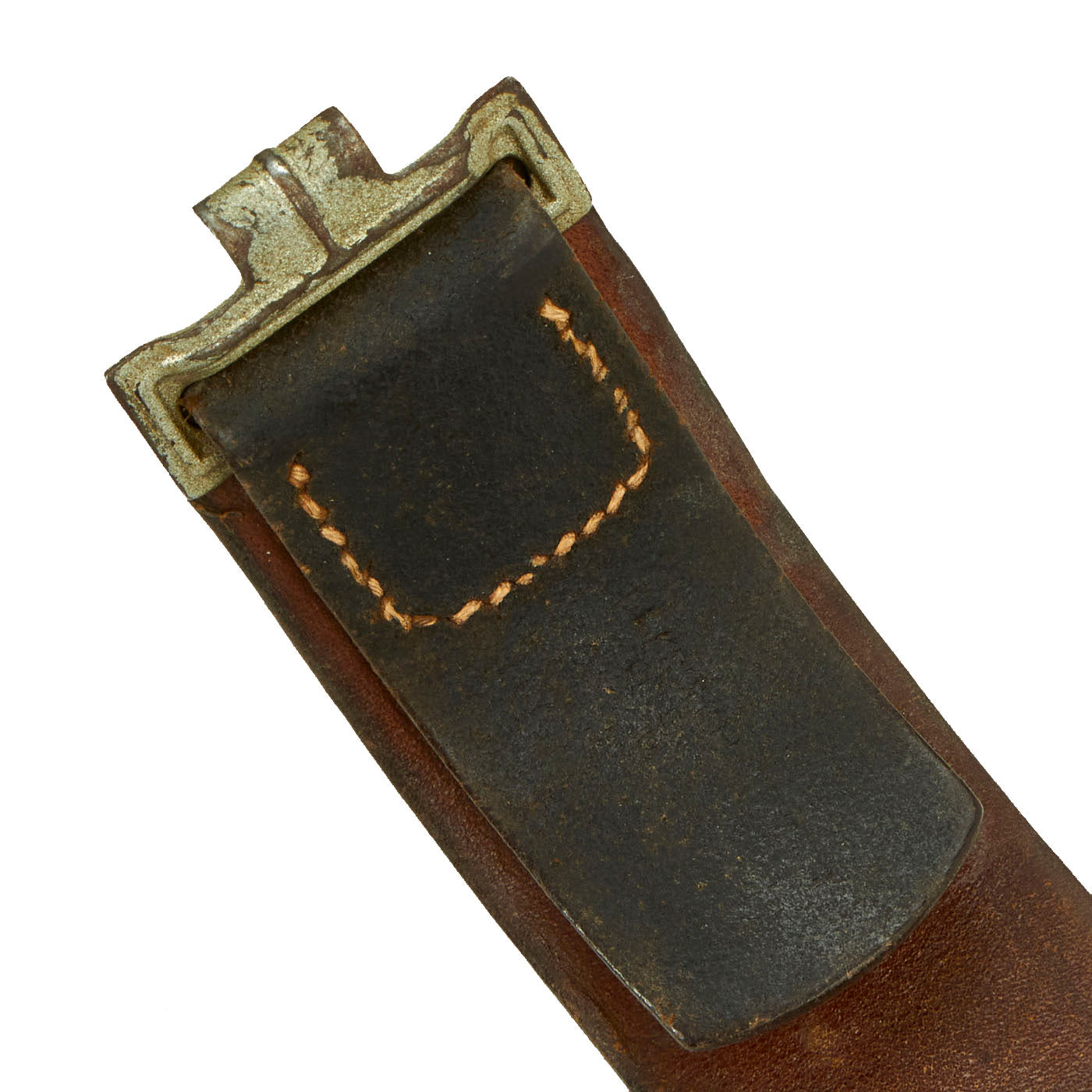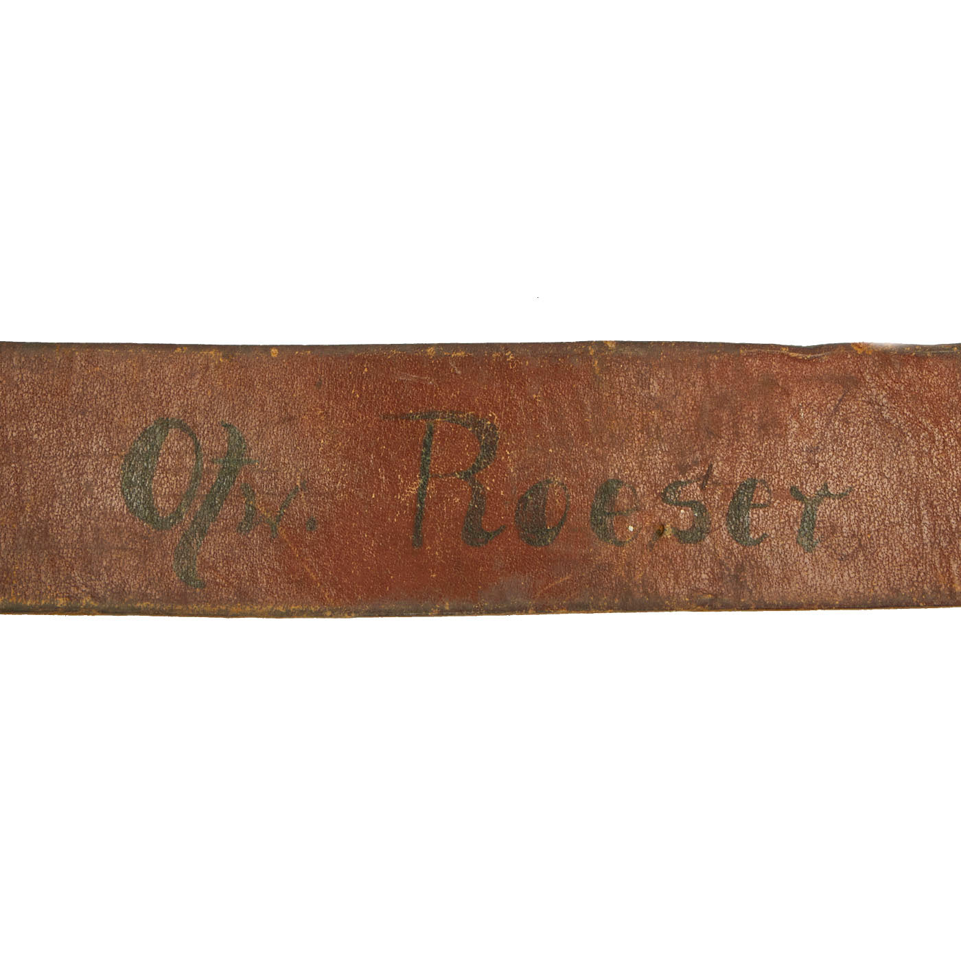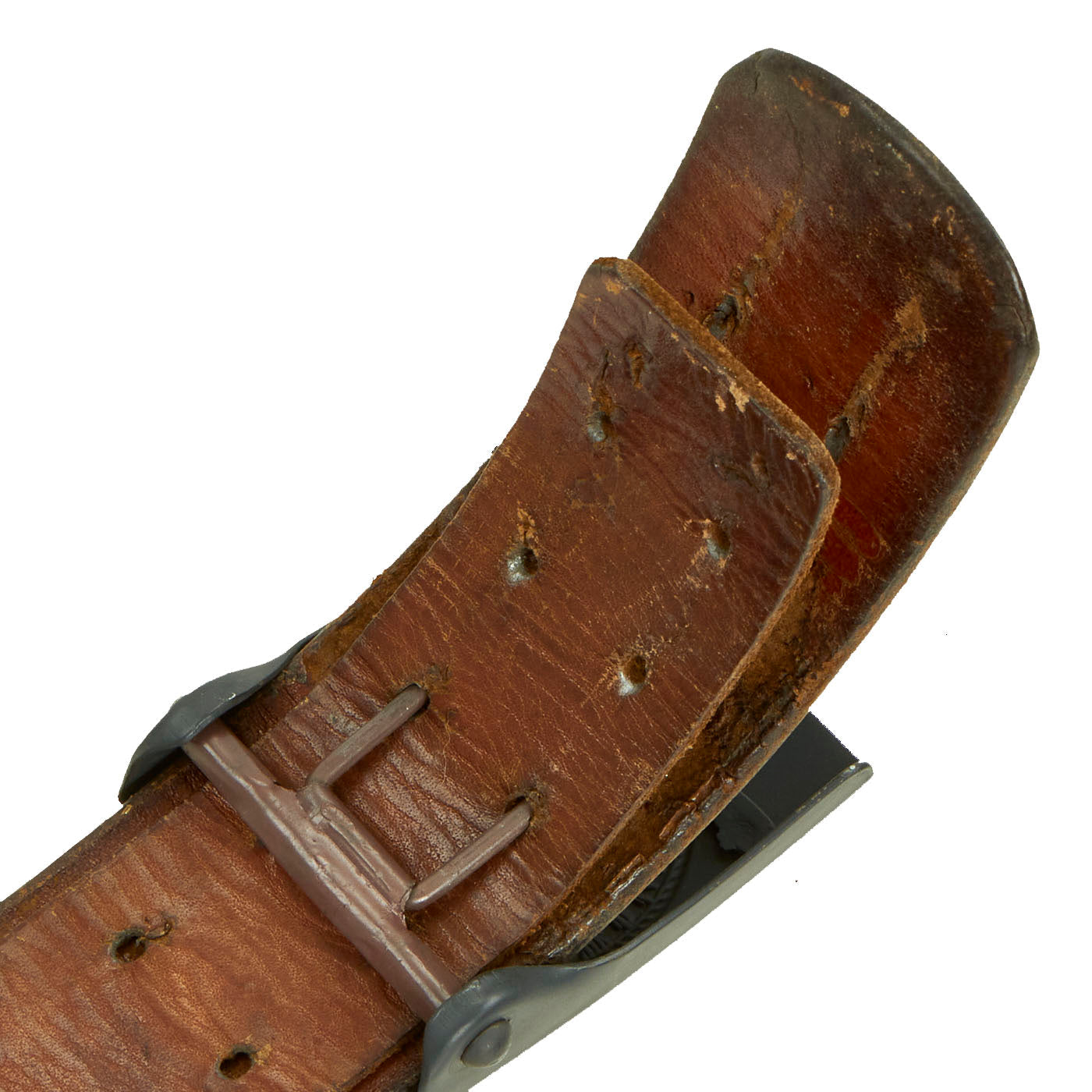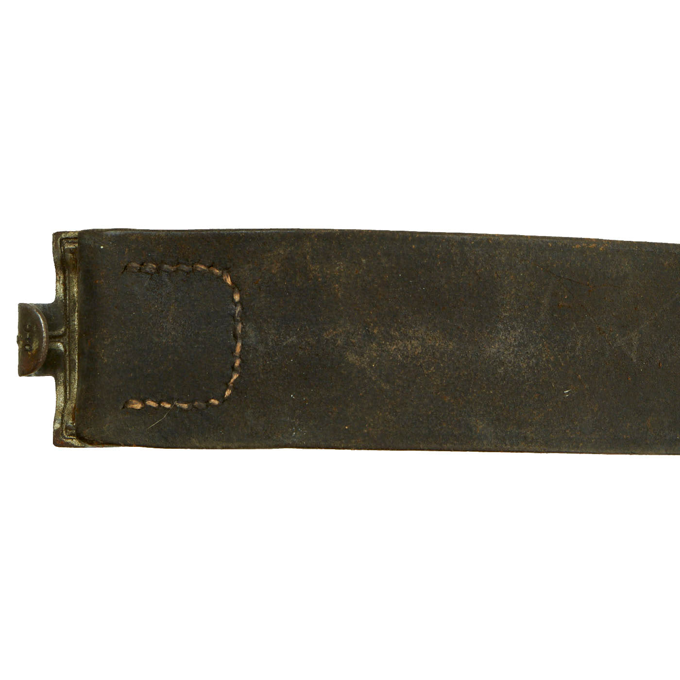 The Buckle design features a smooth outer field with central, high relief, embossed Wehrmacht eagle with down swept wings to slightly domed center, encompassed by an oak-leaf cluster to bottom and bears the Wehrmacht motto GOTT MIT UNS, (God with us), on the top. The oak-leaf cluster and script are on a ribbed background and encircled by an inner and outer simulated twisted rope border. This is a great field gray painted steel construction box buckle with a smooth background. The buckle is in great condition, with what appears to be a well retained paint or possibly repaint. The back of the buckle is nicely stamped with maker mark JFS for Josef Feix & Söhne of Gablonz, in the so-called Sudetenland. The leather tab, which would often be on buckles by this maker, is unfortunately missing. Belt has a makers mark but is unable to be read. Total length is 35”