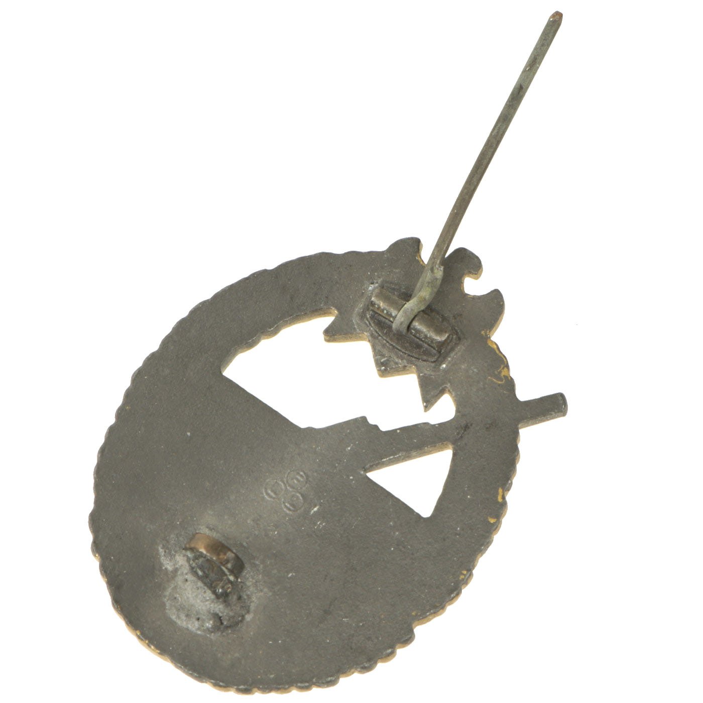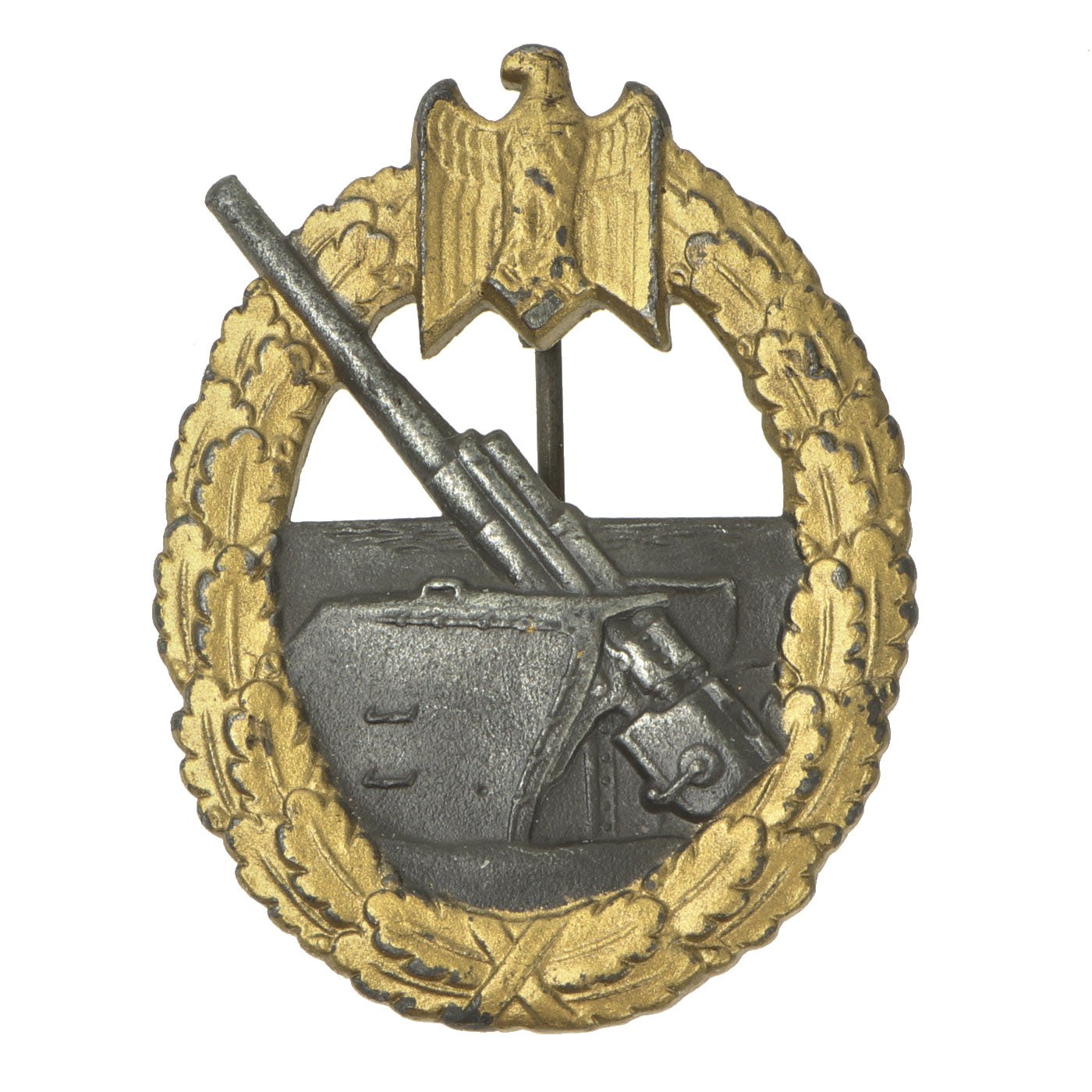 The medal was designed by Otto Placzek of Berlin. It consists of an outer laurel wreath of oak leaves with the German Eagle at the top, displaying "down-swept" wings while clutching a swas (both gold in color). The central area featured a coastal artillery gun with the sea behind (in grey color). The early war version were made of bronze and later nickel.Inferior quality late-war versions were made of "pot or monkey metal". The medal was worn on the lower part of the left breast pocket of the naval service tunic.