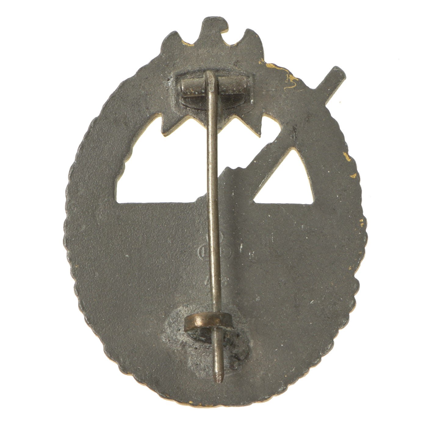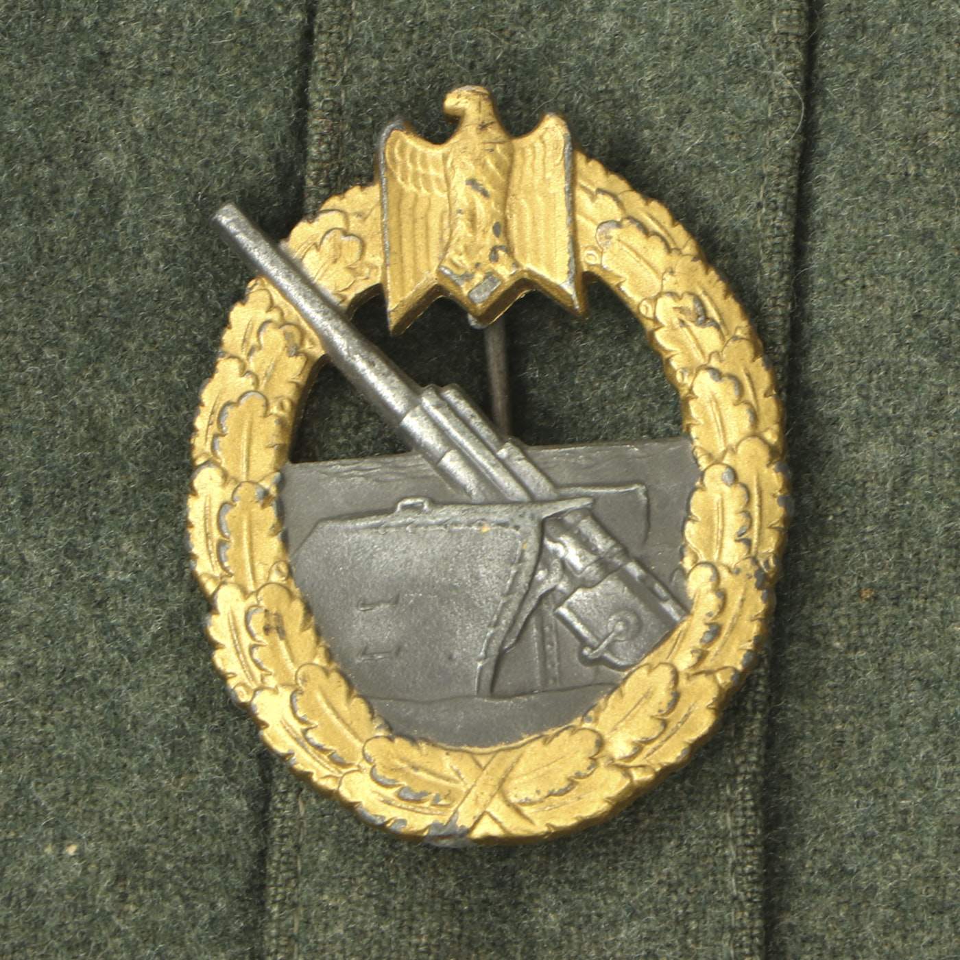 The Naval Artillery War Badge or War Badge for the Coastal Artillery (German: Kriegsabzeichen für die Marineartillerie) was a World War II German military decoration awarded to the crews of Kriegsmarine land-based marine artillery and anti-aircraft units. It was presented to personnel of coastal defense units, and anti-aircraft units. The award was instituted on 24 June 1941 by Grand Admiral Erich Raeder to reward the actions of both individuals and crew members. It was also awarded to those killed in action in said units.