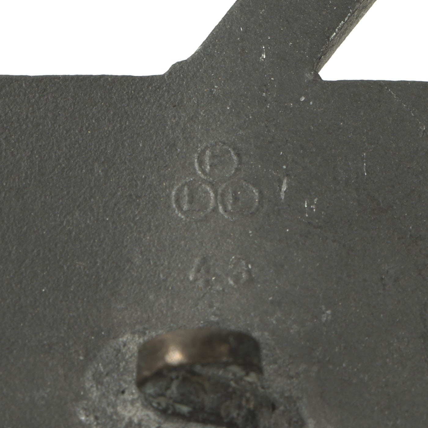 The exterior of this tunic is clean, with good original wool nap, and showing only minor staining and fading. The cuffs feature hidden closure buttons. There are medal loops with an Original German WWII Kriegsmarine Coastal Artillery Badge by Friedrich Linden. This is a very nice example constructed of Zinc with exterior gilt wash on the surround, nicely marked on the reverse FLL 43.