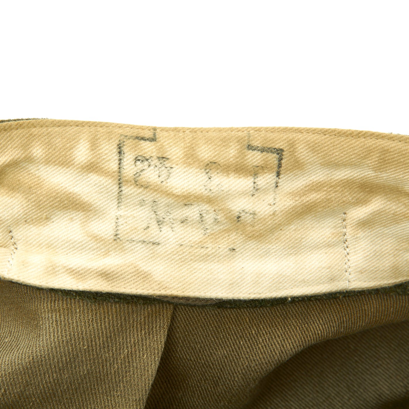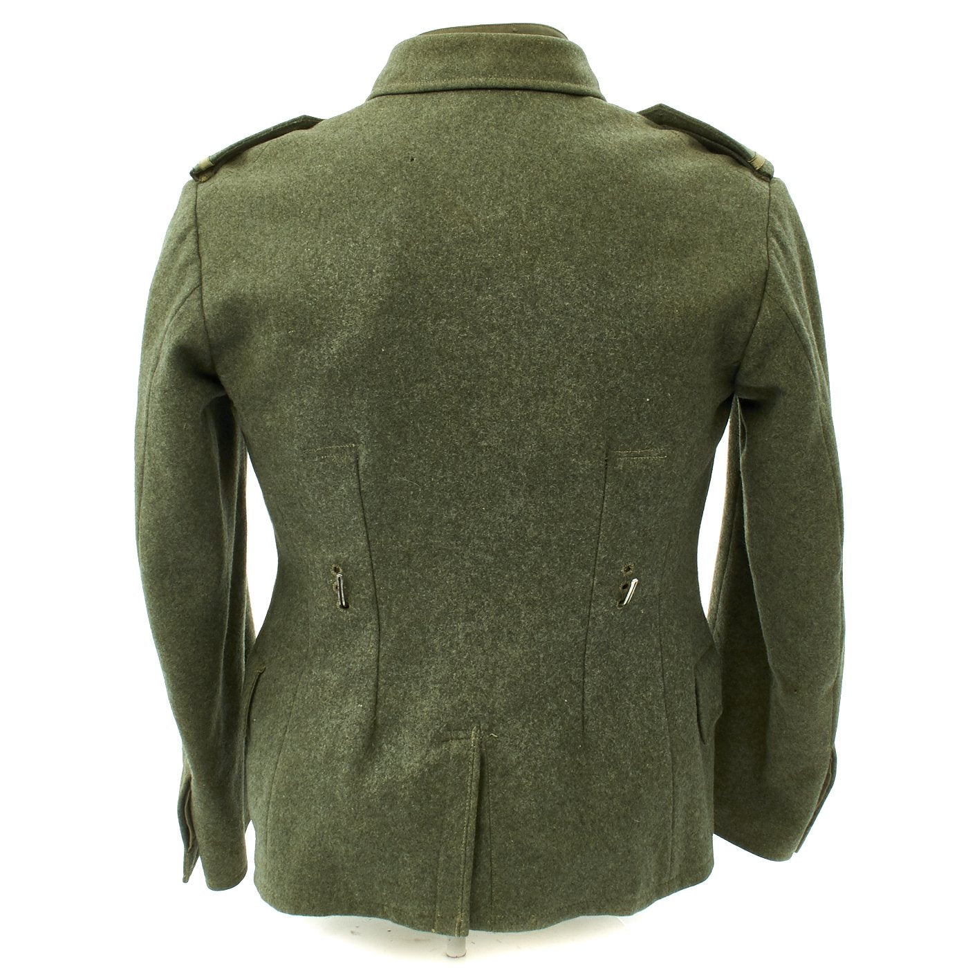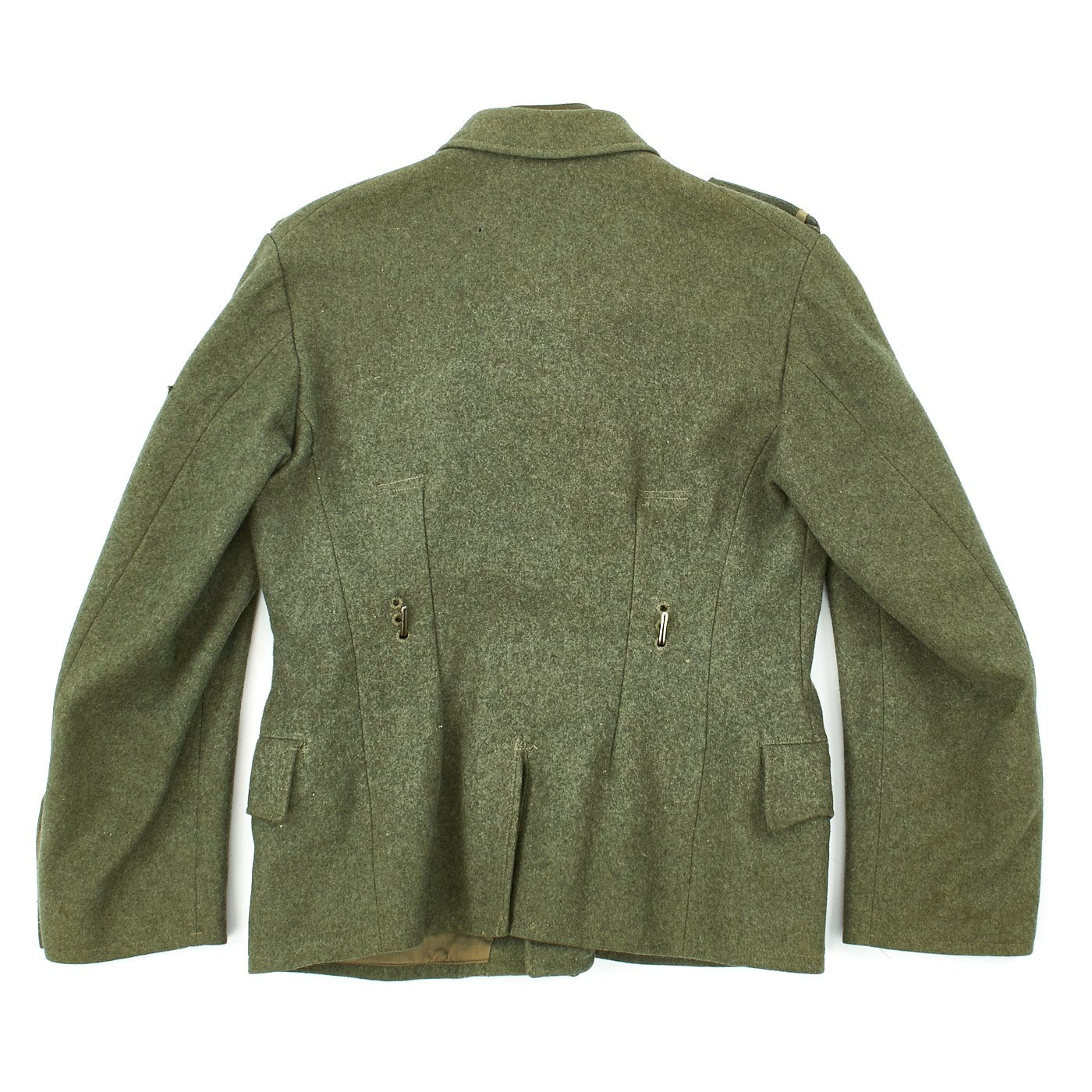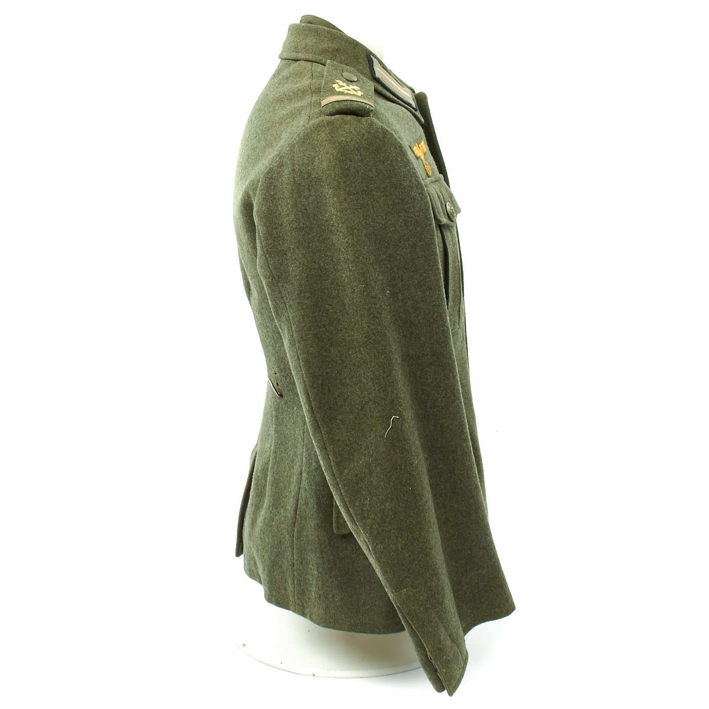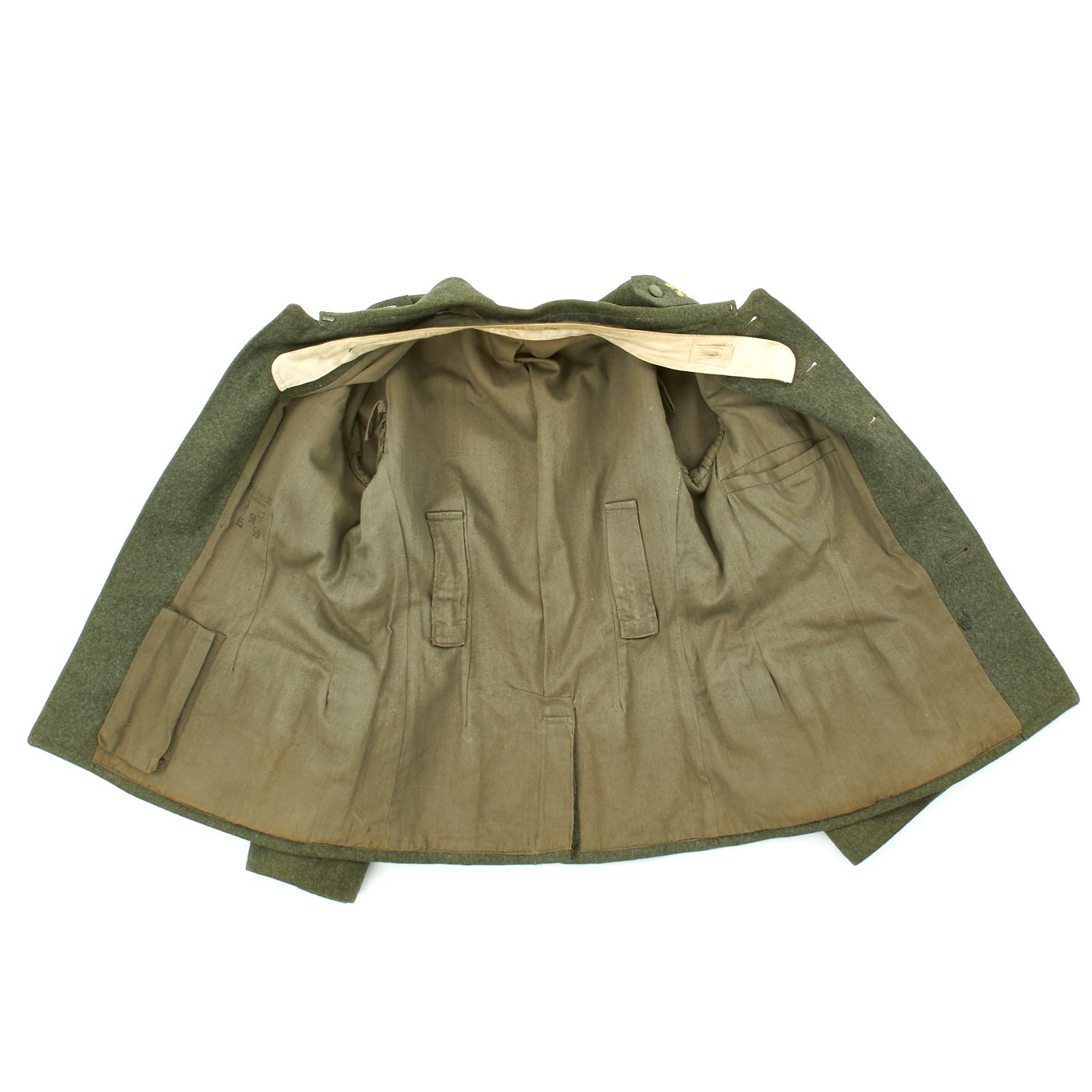 The inside of this Navy tunic is fully lined with cotton, as is typical. The interior of the M36 style dark green badge cloth collar has button for affixing a collar bind which is also included. Hidden belt hooks are also present. There are ink maker stamps on the interior that read: Fritz Schmitz & Co. PFORZHEIM 39 42 96 65 59.