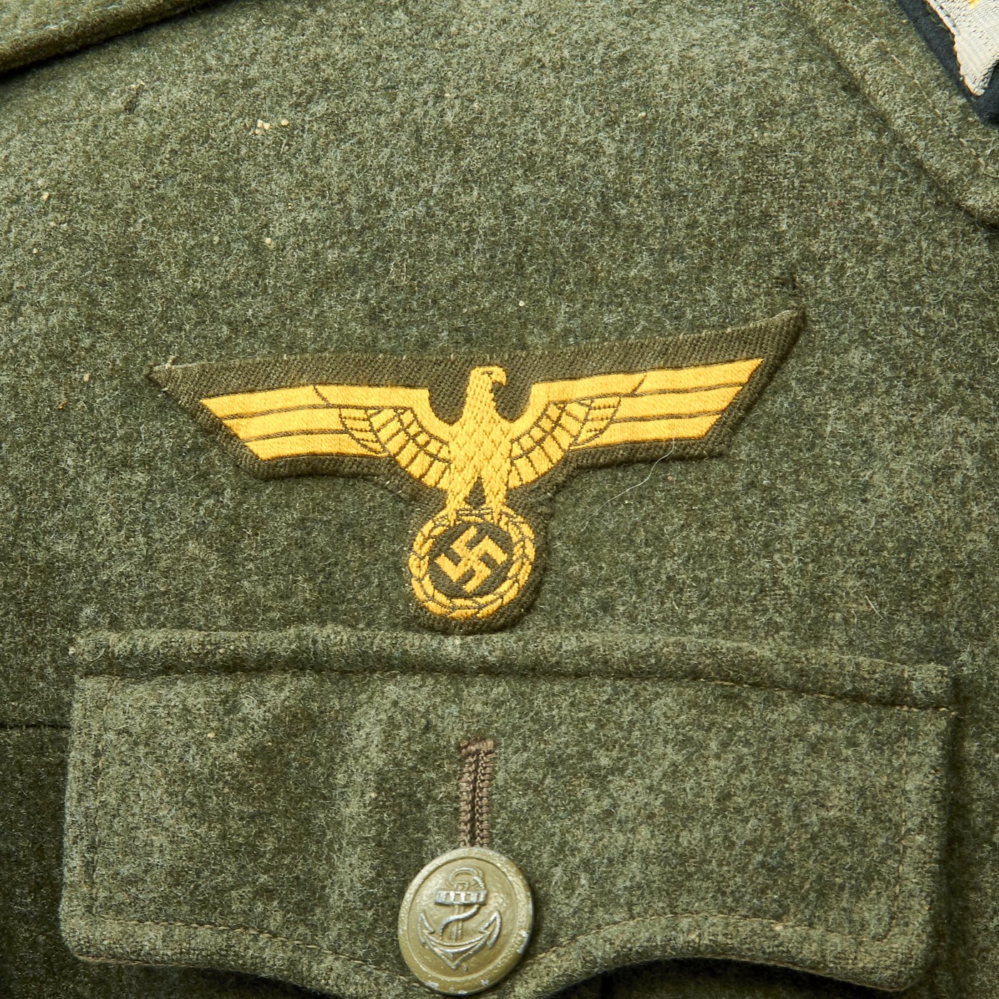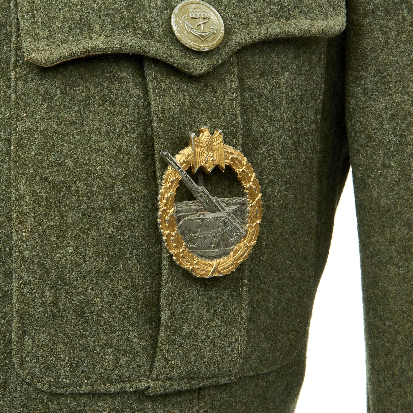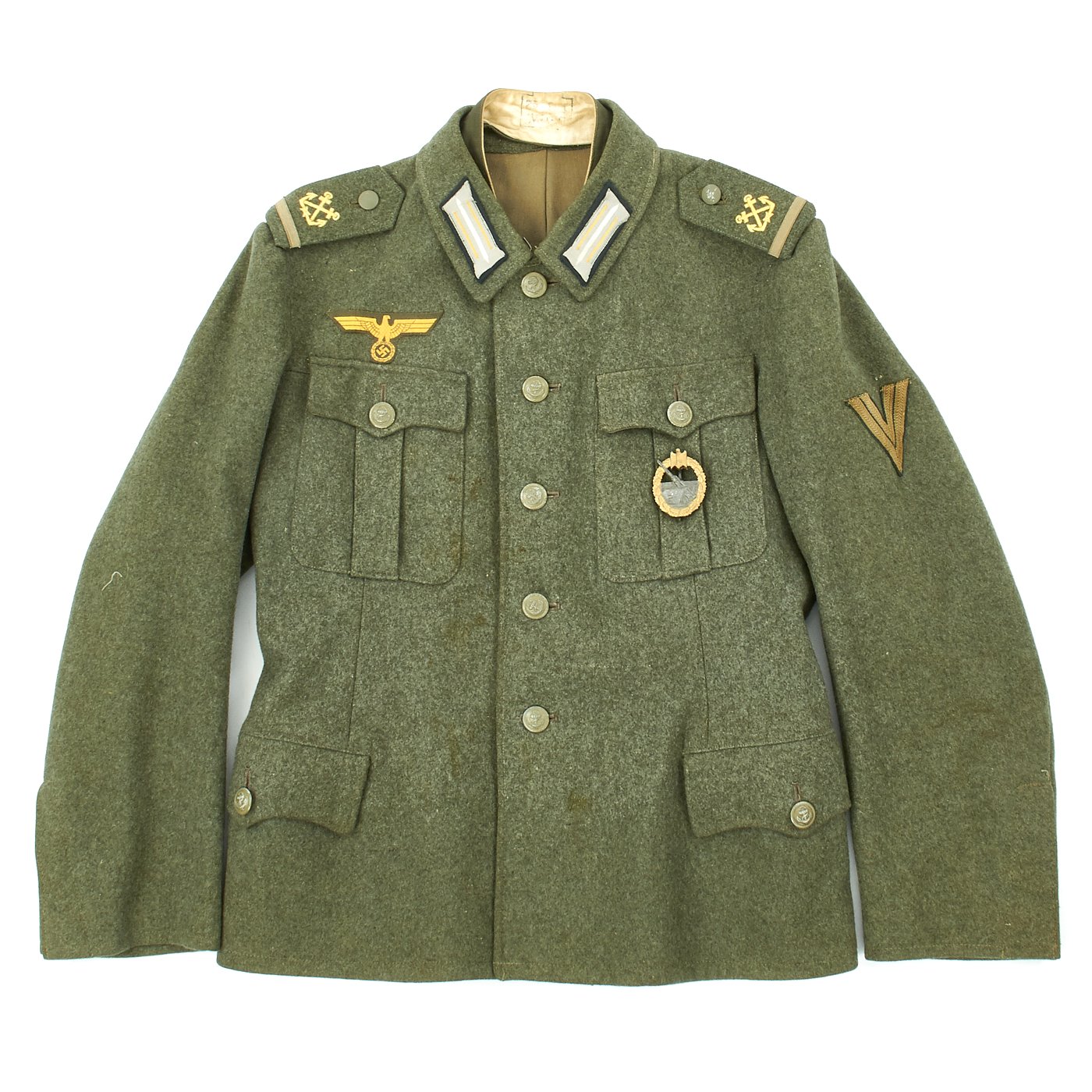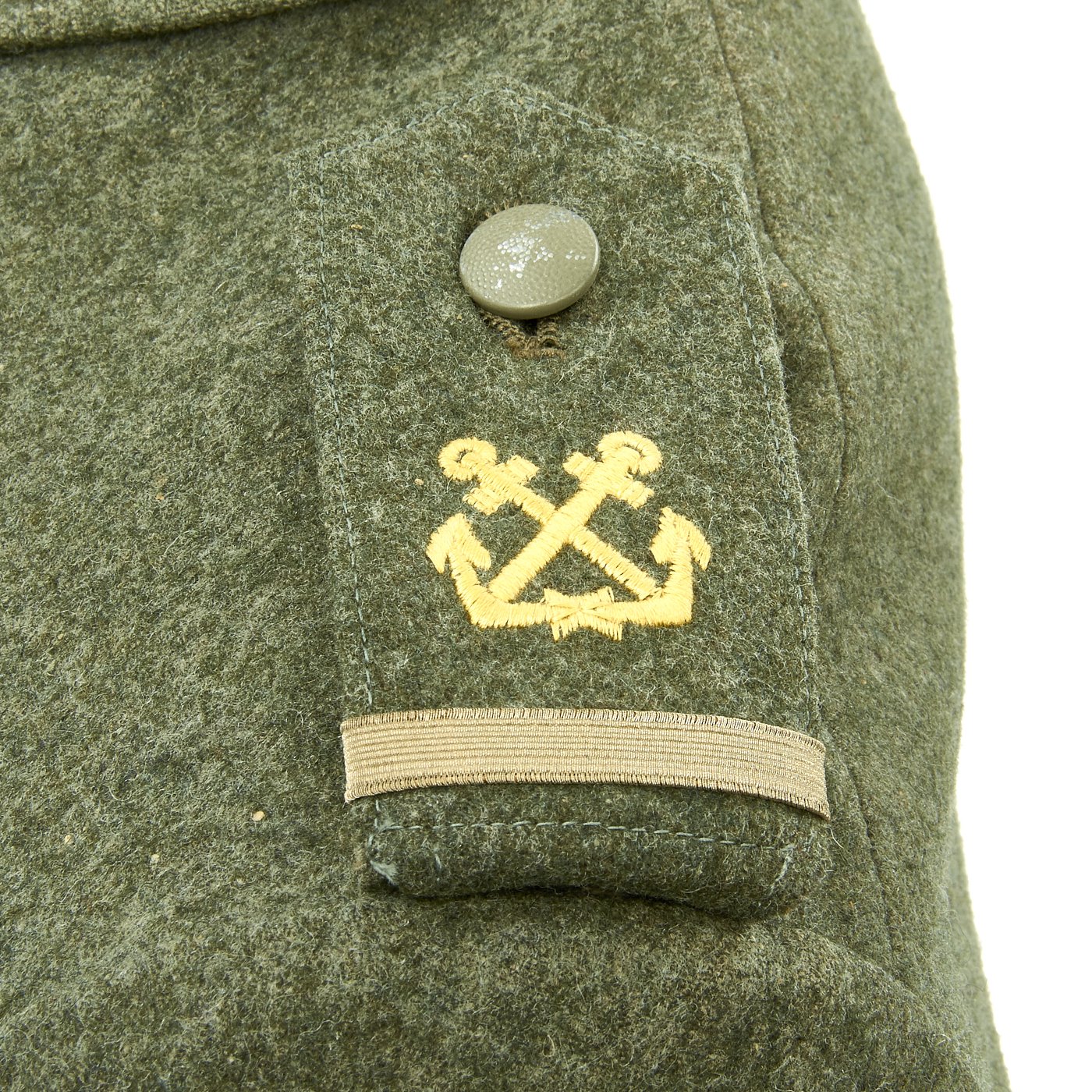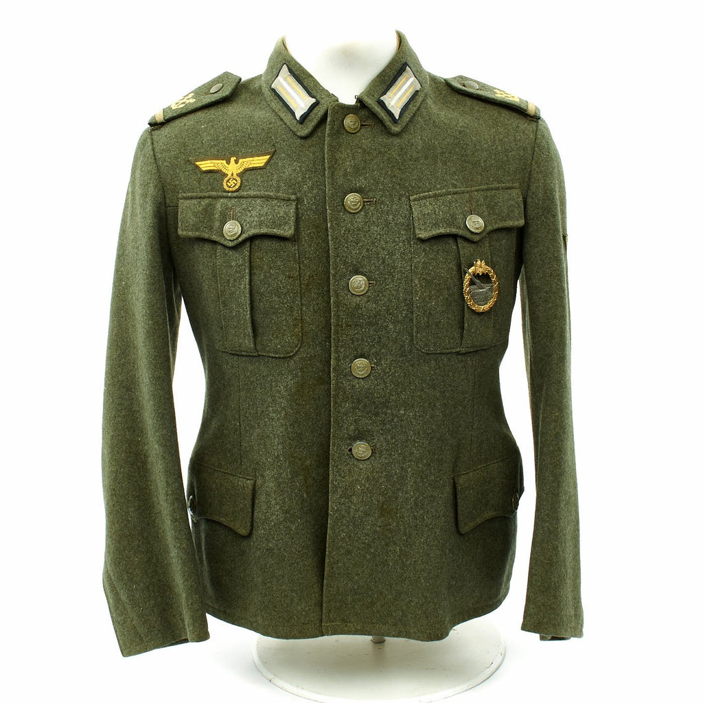 Original Item: Only One Available. This is an excellent example of a WW2 German Army Kriegsmarine Coastal Artillery Matrosenobergefreiter (Seaman 2nd Class) tunic. This beautiful tunic is nearly untouched. The tunic itself is made of a medium weight field gray/green wool. The front closes with five green painted Kriegsmarine Navy Anchor painted buttons. The attractive Naval breast eagle stitched to the chest in a fashion typical of wartime German tailor work. The collar tabs are correct for the rank and machine applied. The shoulder boards have embroidered crossed anchor and are neatly and tightly applied. Chevron on left shoulder is machine stitched and in excellent condition.