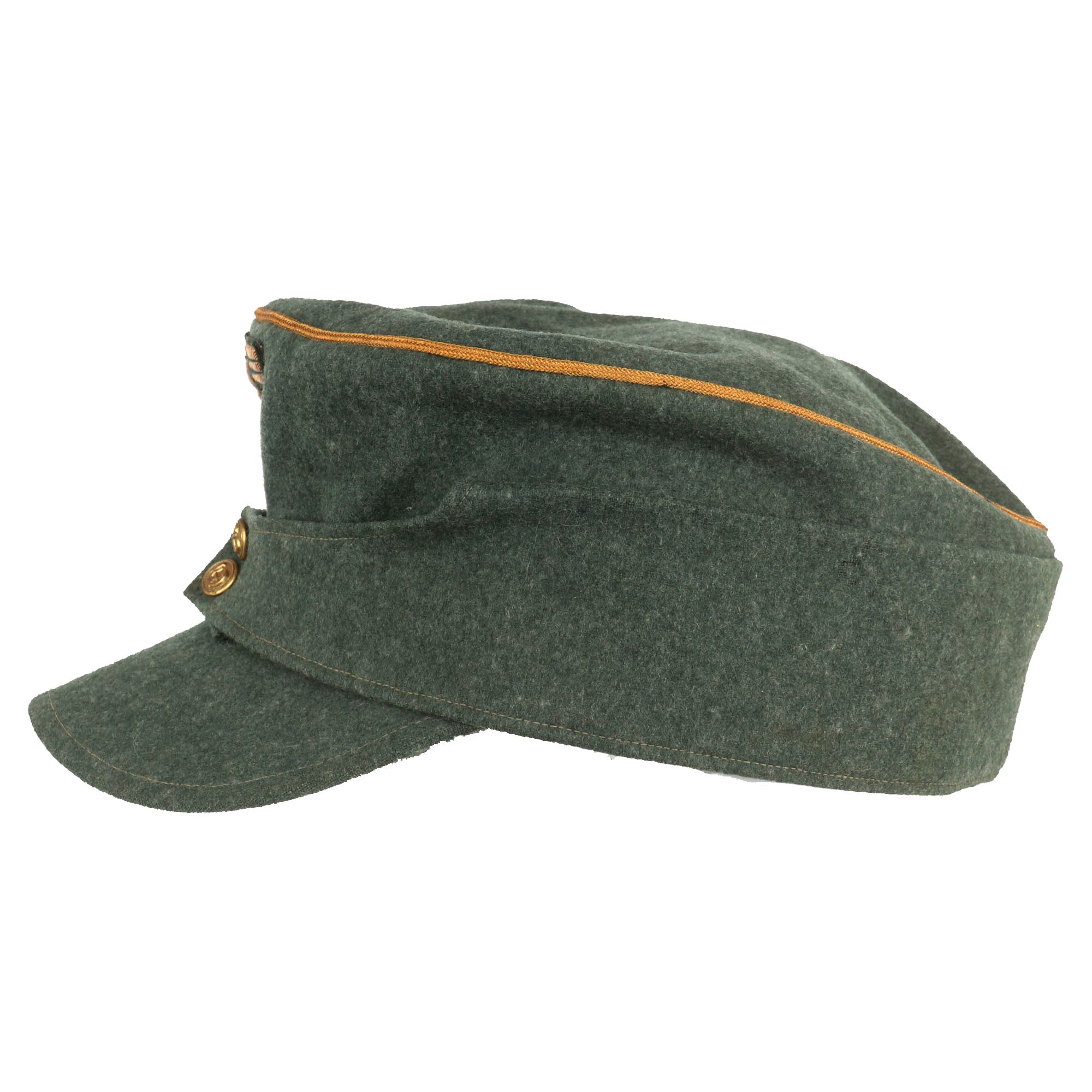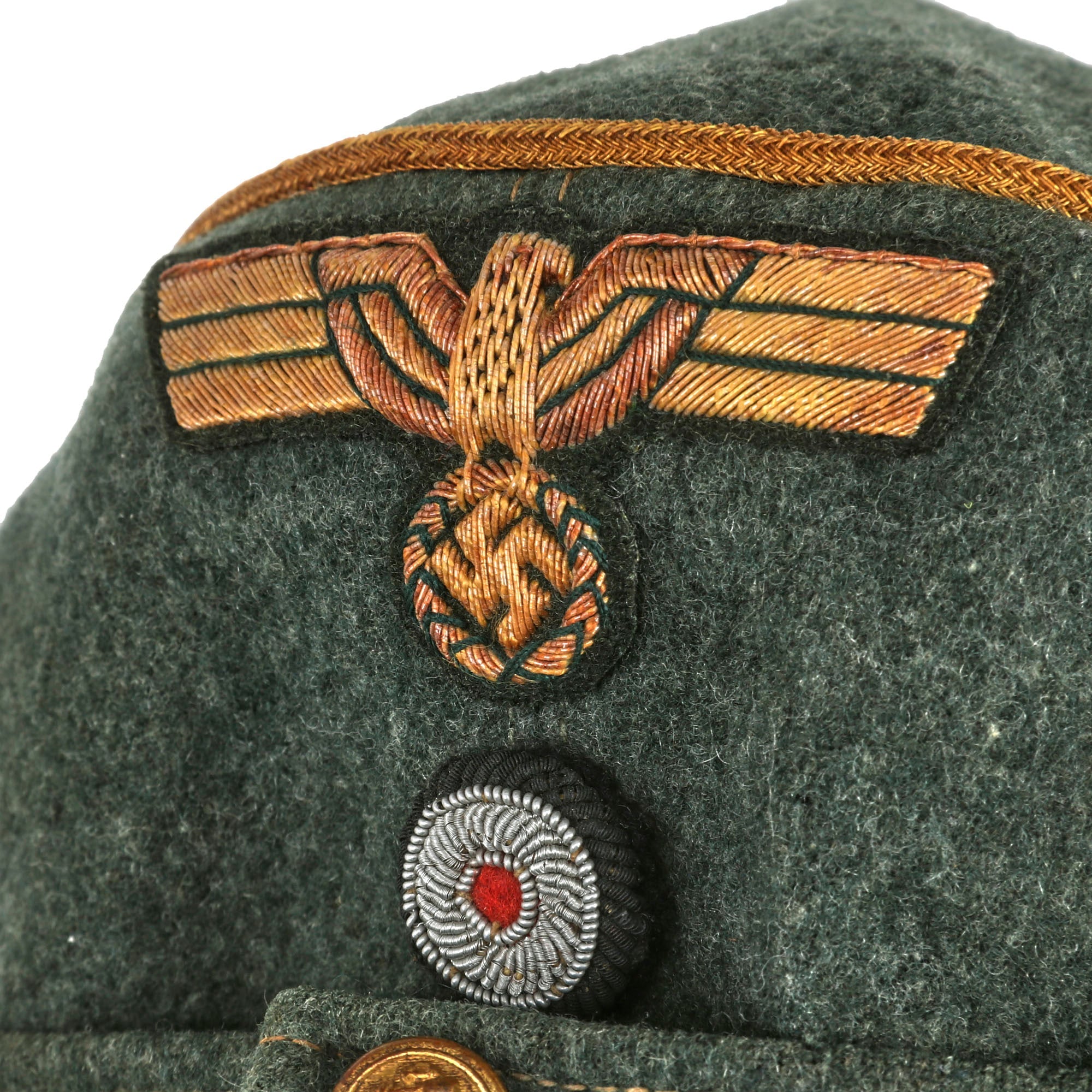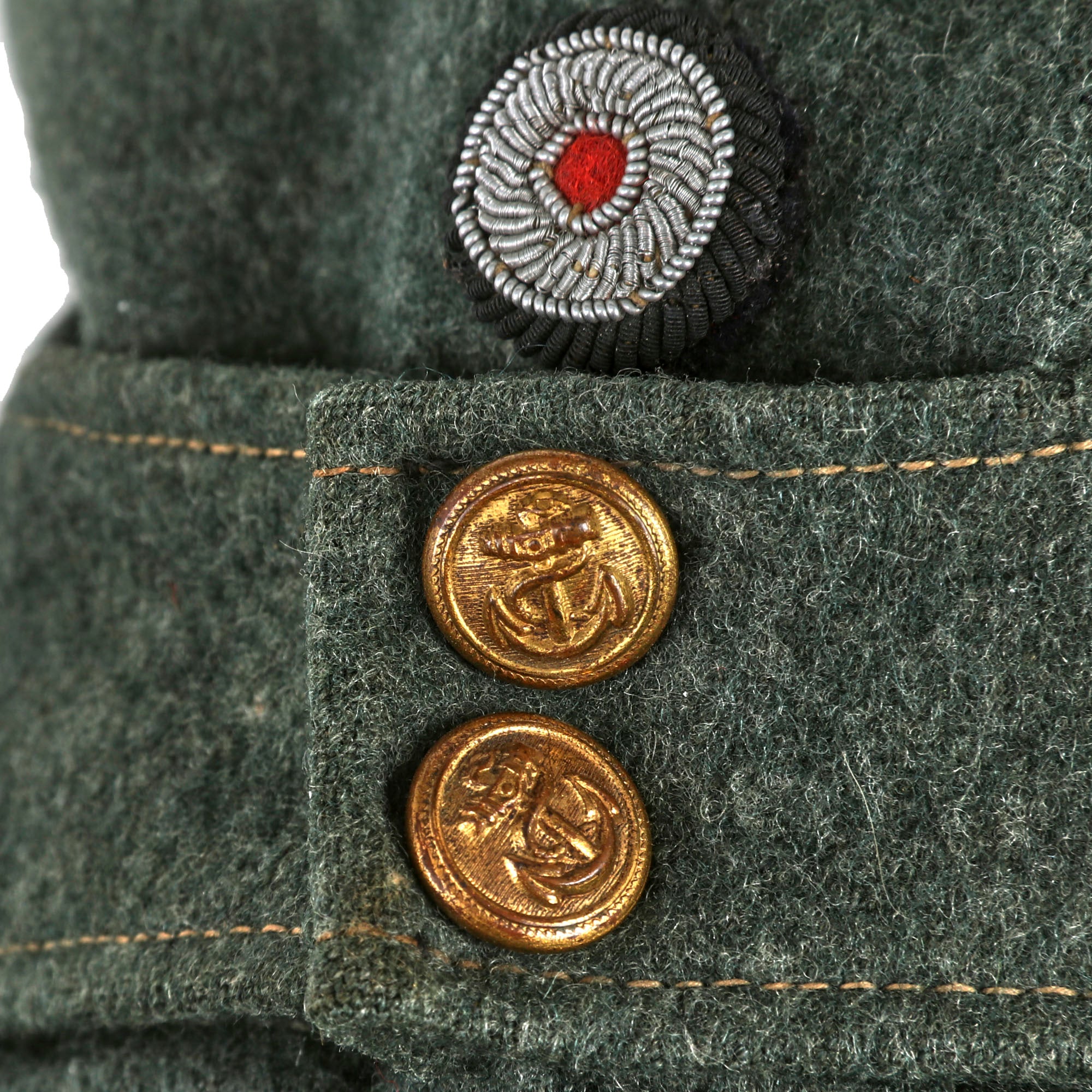 The field cap is constructed of field-gray wool, with fold-down sides and back panels with gently sloping, downward scallops to the front, and these are pretty much identical to the Army version save for the insignia. The top front of the cap features a wonderfully detailed bullion embroidered, Kriegsmarine-style eagle in gold metal wire mounted to a green woolen base. Below the eagle is a bullion embroidered, national tricolor cockade in black, silver and red, and the hat bears a gold bullion cord around the crown, indicating an officer. The skirt arms display the usual square-ended pattern and are secured at the front of the cap with two gold Kriegsmarine "anchor" buttons.