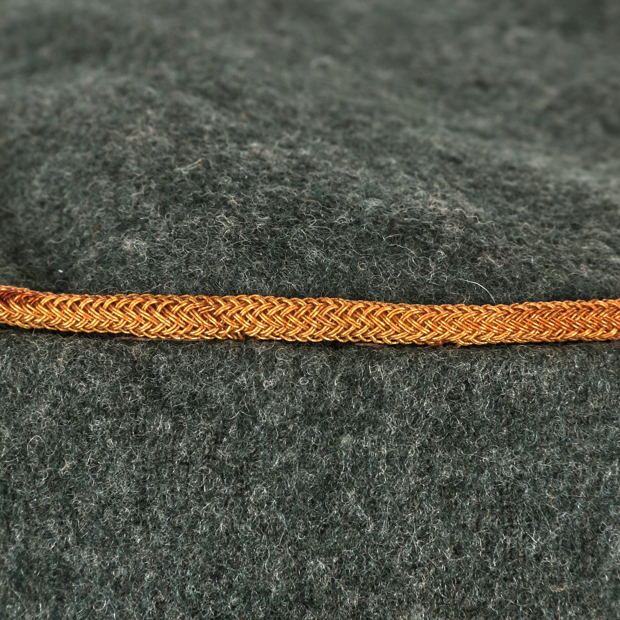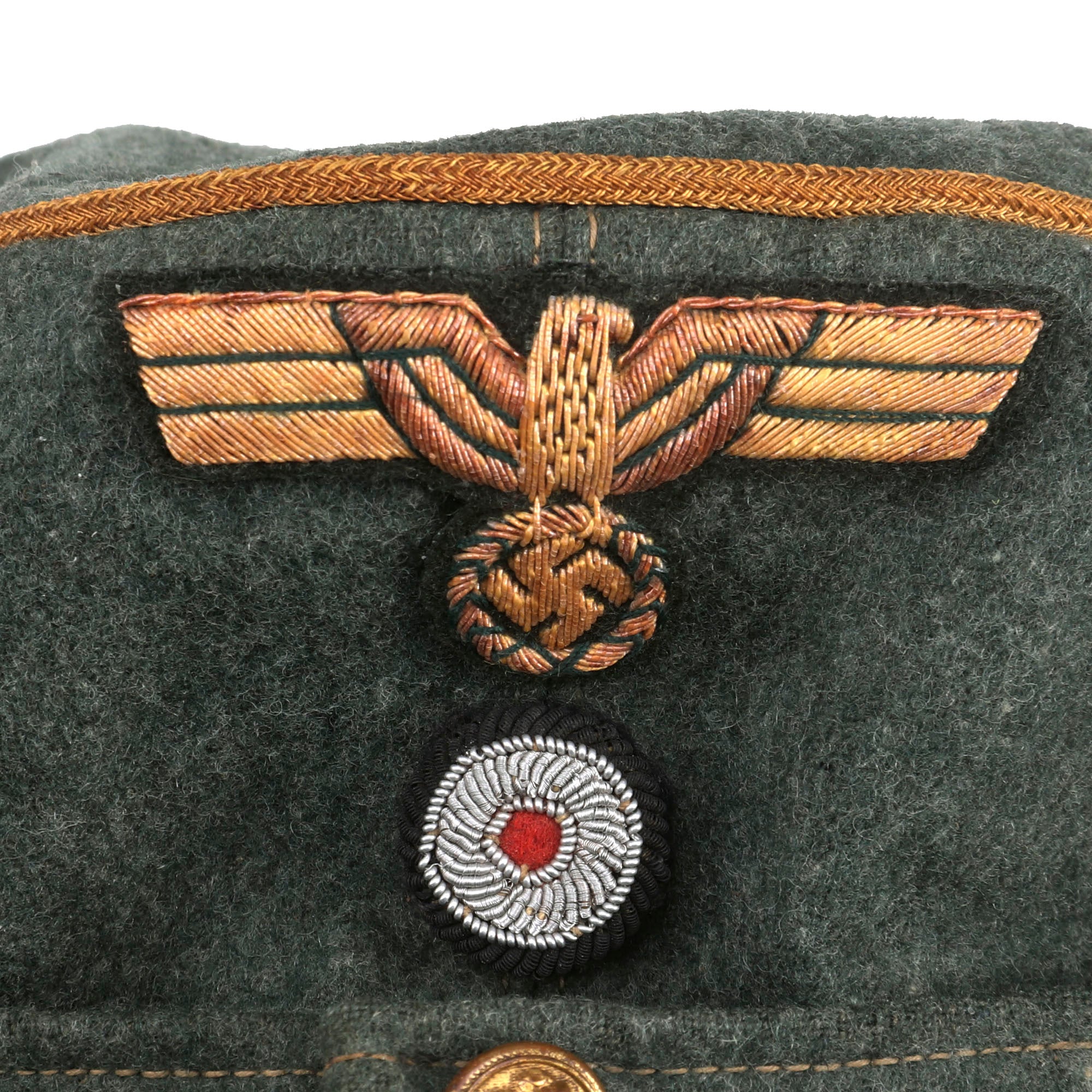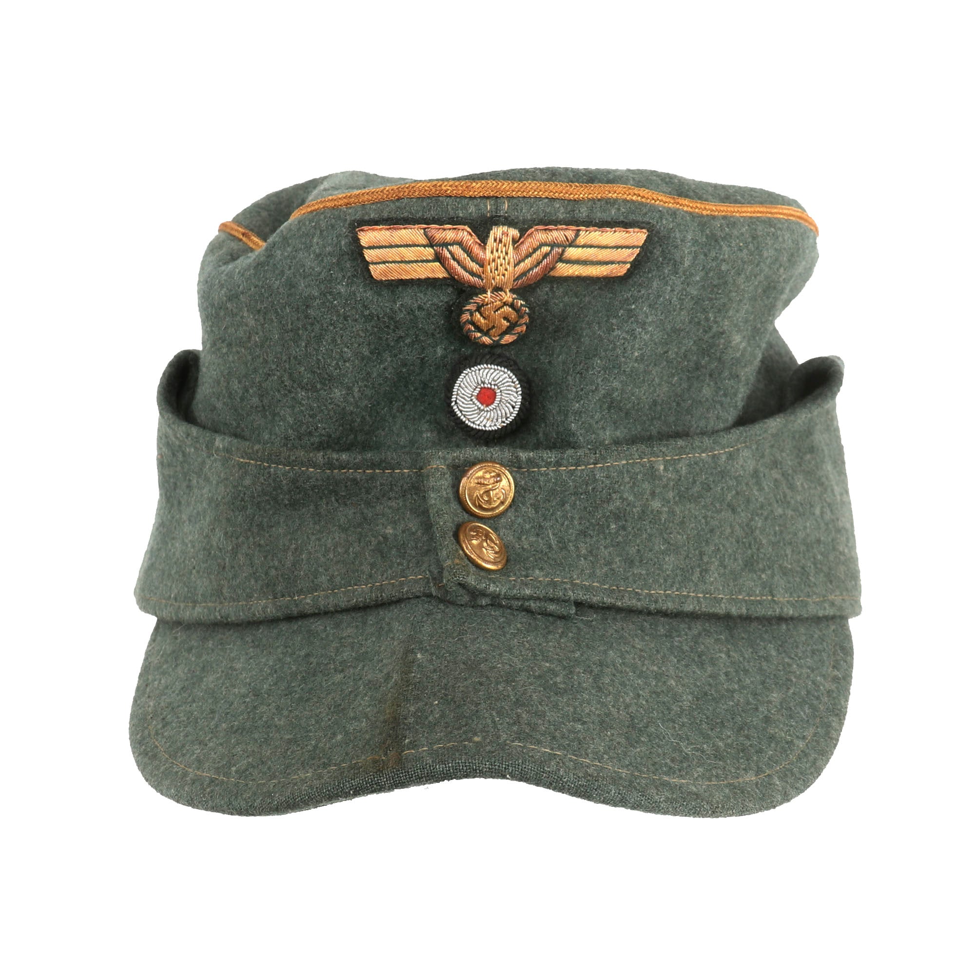 The field cap is constructed of field-gray wool, with fold-down sides and back panels with gently sloping, downward scallops to the front, and these are pretty much identical to the Army version save for the insignia. The top front of the cap features a wonderfully detailed bullion embroidered, Kriegsmarine-style eagle in gold metal wire mounted to a green woolen base. Below the eagle is a bullion embroidered, national tricolor cockade in black, silver and red, and the hat bears a gold bullion cord around the crown, indicating an officer. The skirt arms display the usual square-ended pattern and are secured at the front of the cap with two gold Kriegsmarine "anchor" buttons.