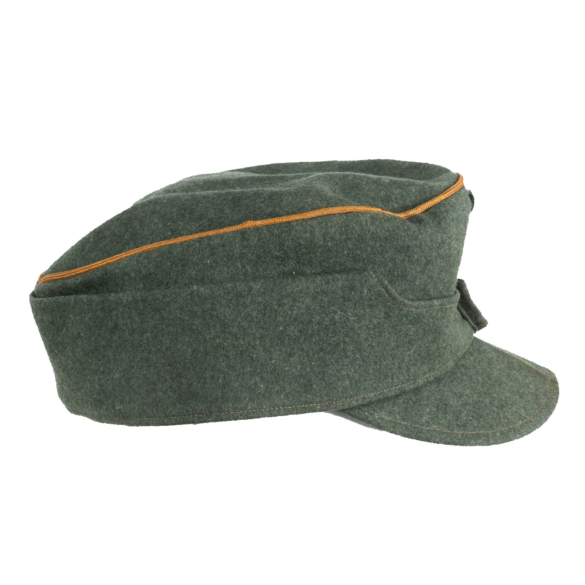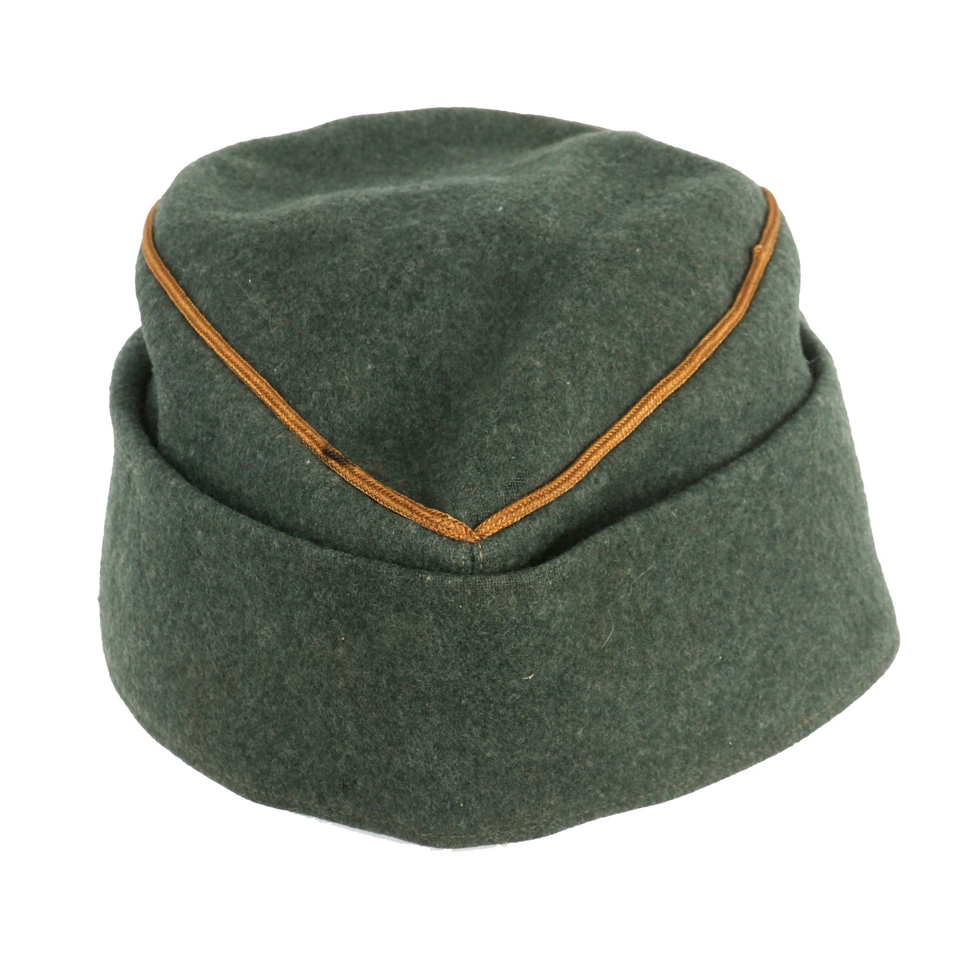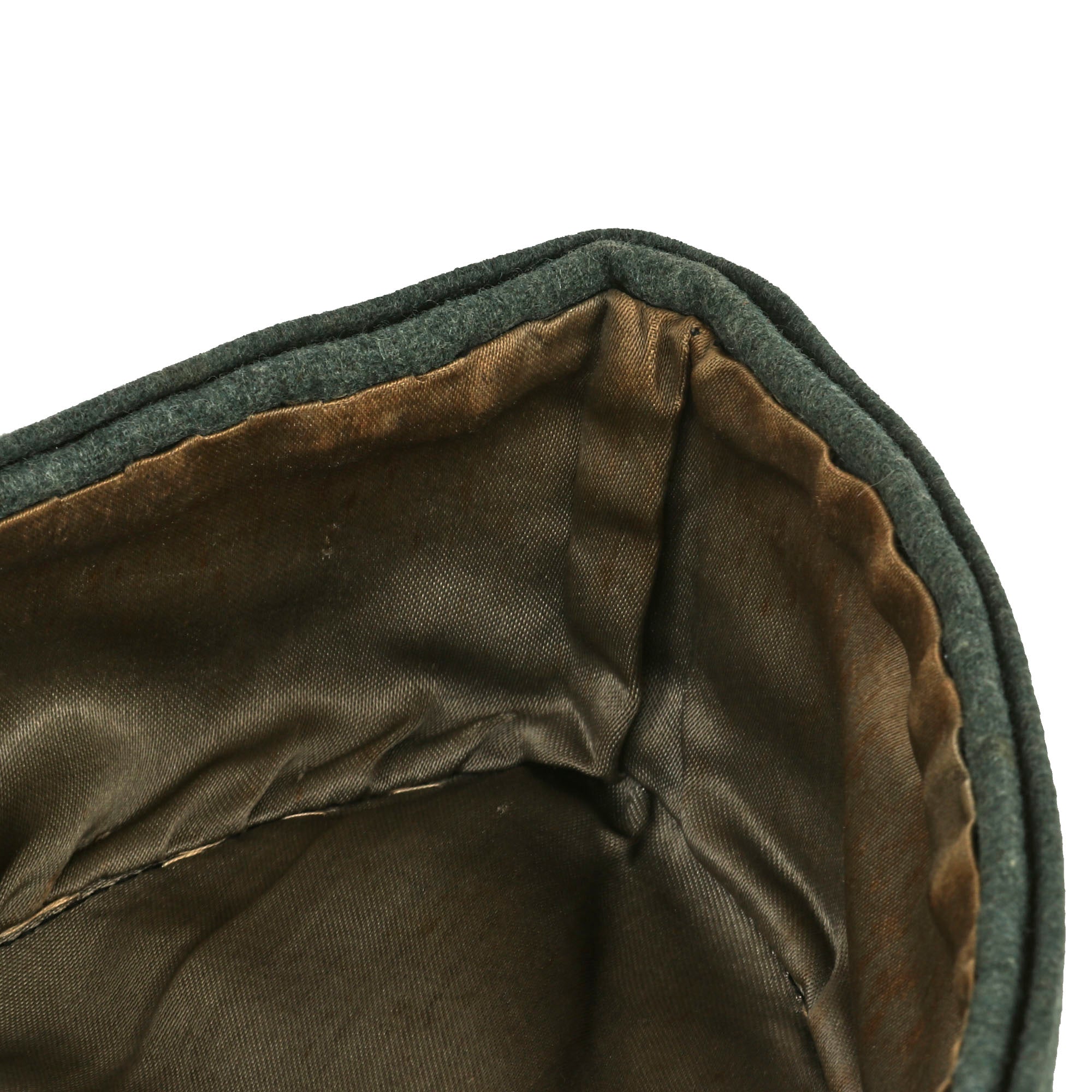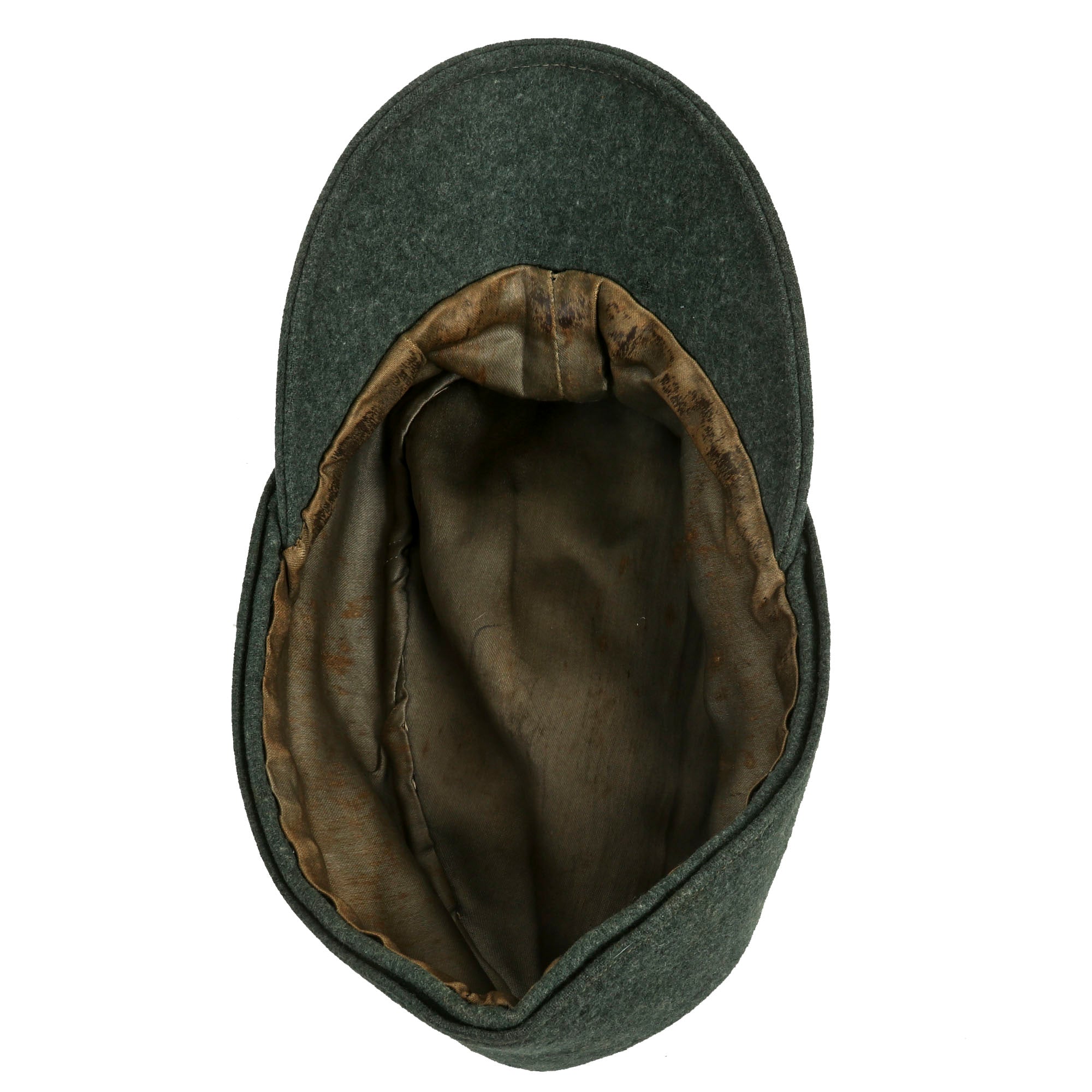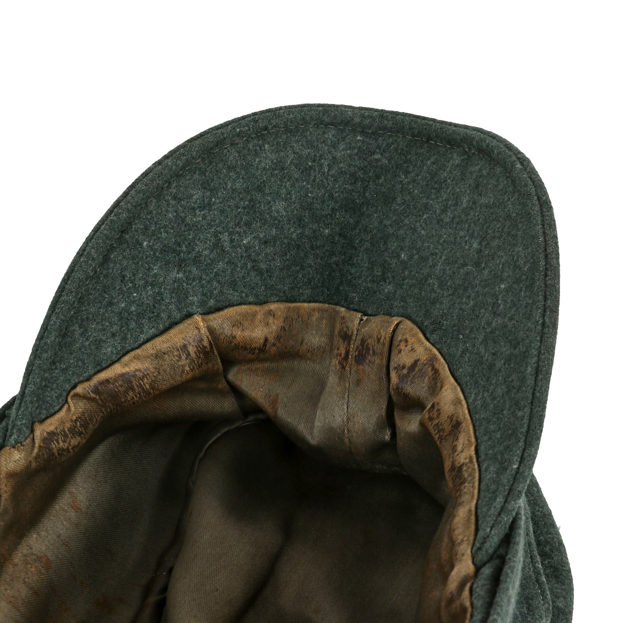 Condition of this field cap is very good, though the exterior does show some light wear, which has removed some of the fuzzy "nap" on the fabric around the edges. The interior lining shows some staining and soiling around the lower edge, especially in the forehead area.
