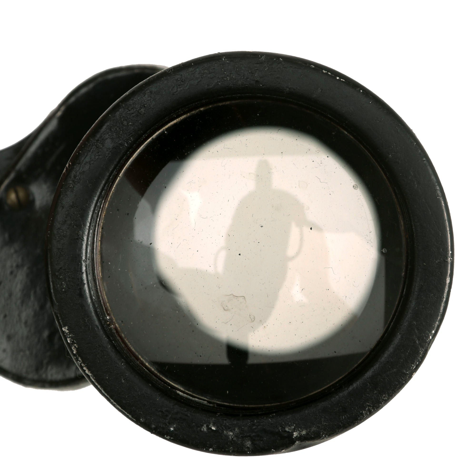 The binoculars are really in great shape, with the optics showing just a bit of haze, and both focus diopters functioning correctly. These do not have a range reticle / graticule in either eyepiece. The bakelite eye cups are in great shape, with no chips or cracks. As with most WWII German binoculars they are non-magnetic, and the body is in great shape, with the textured coating mostly retained, showing just a few areas where it flaked off.