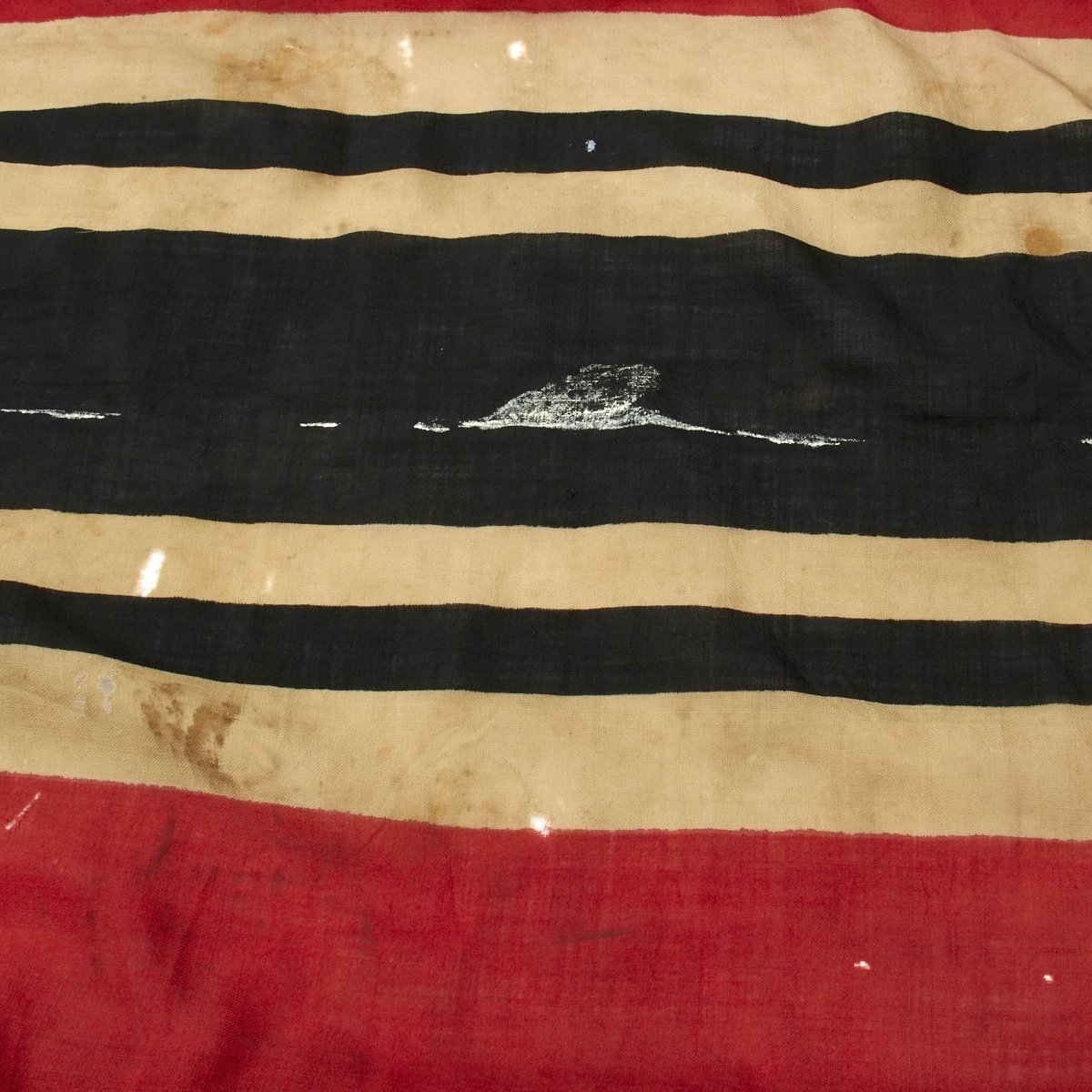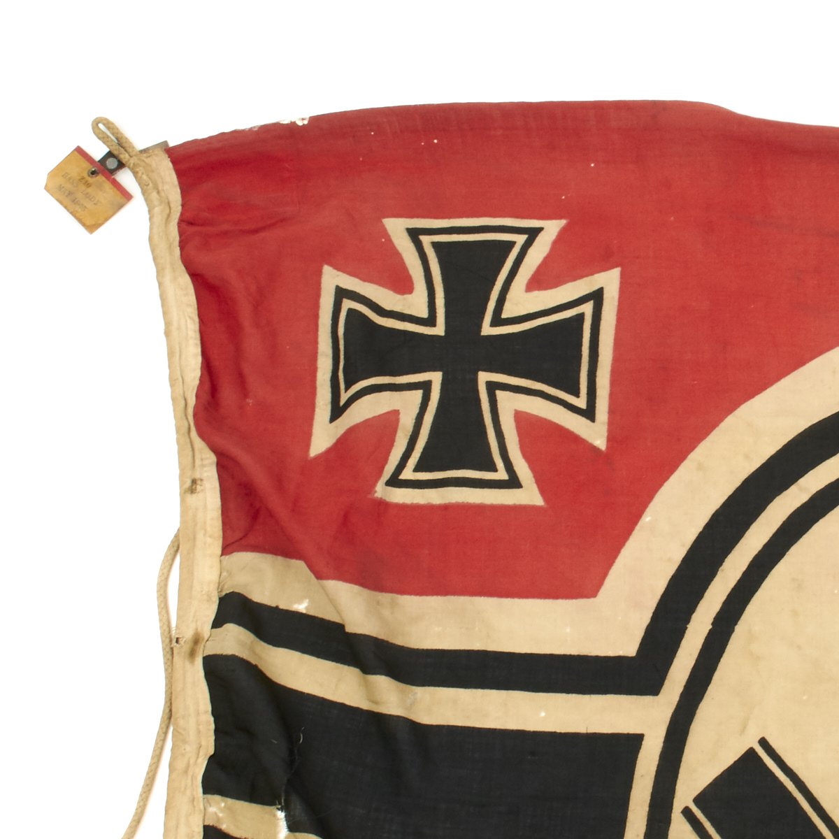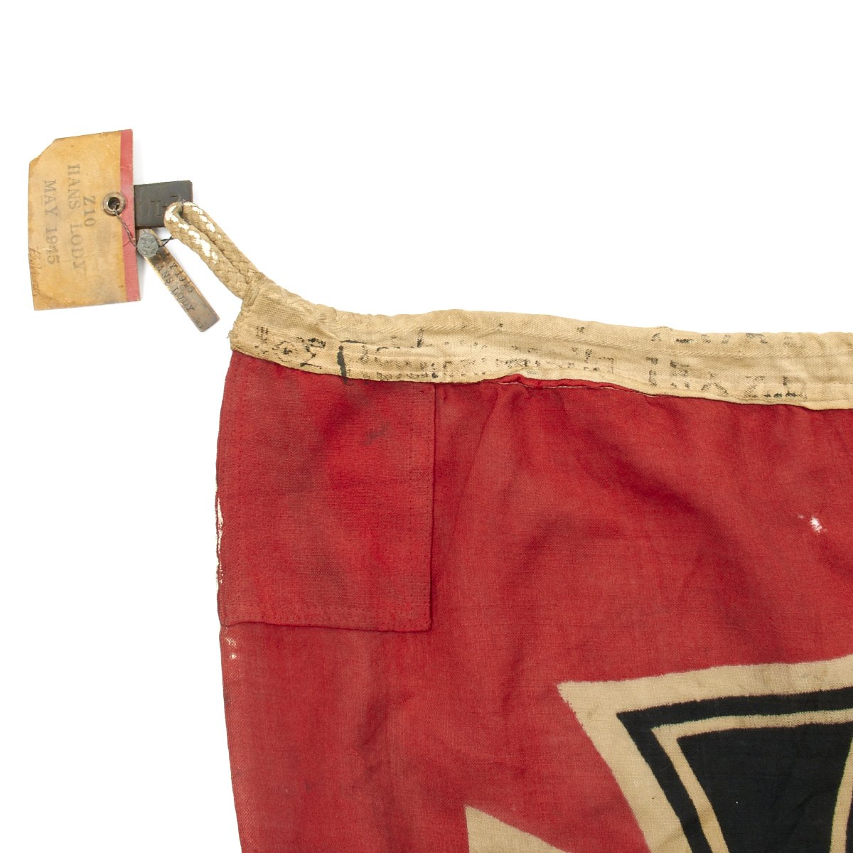 Attached to the flag is are two tags that both read Z-10 HANS LODY MAY 1945. One page is old waxed cardboard with a leather tab attached via grommet. We believe this tag was applied by U.S. forces, also attached is a metal tag which appears to have a ASN on the reverse side which reads 1-12737-3. A fantastic piece of history directly connected to the capture of one of Germany's battleships at the very end of World War Two.