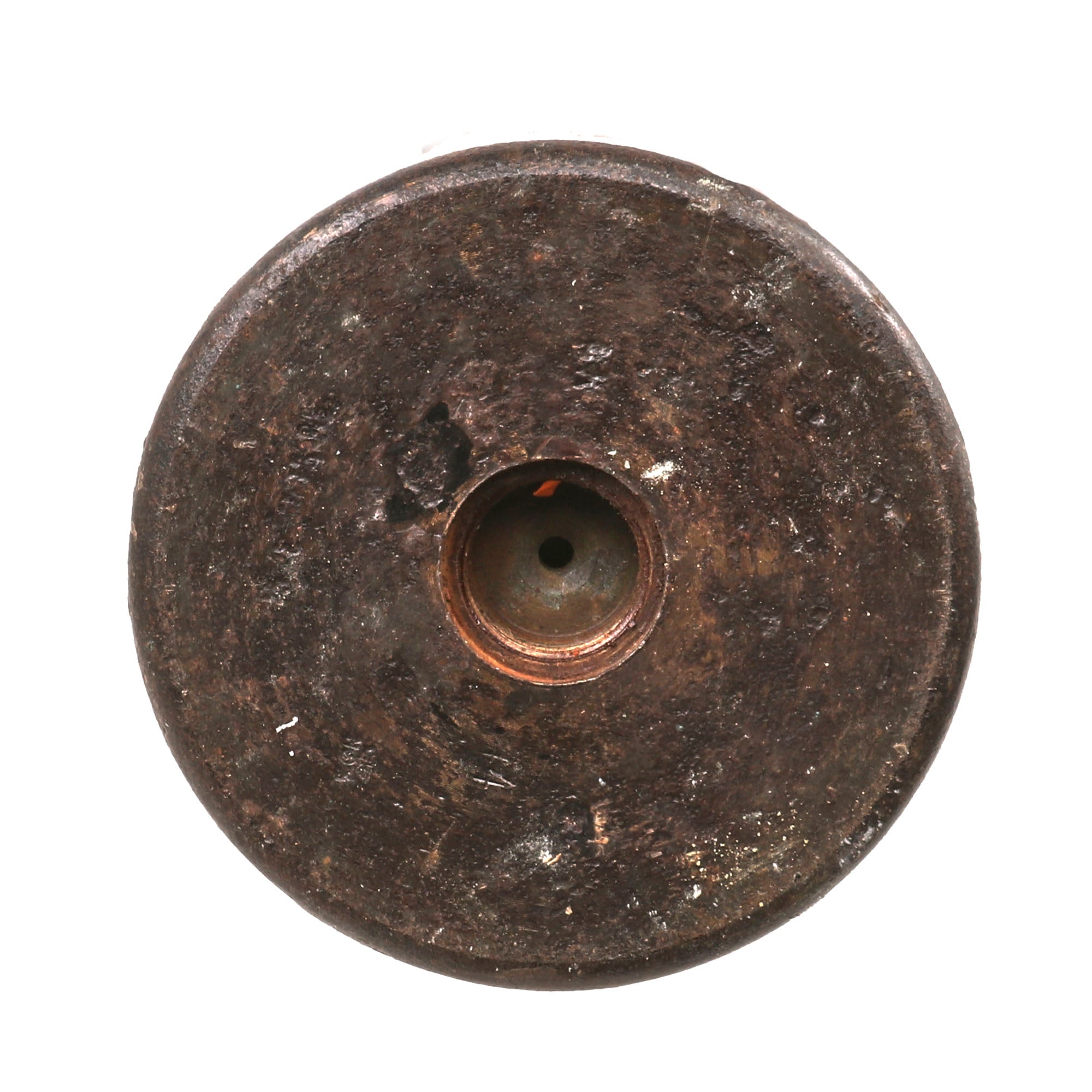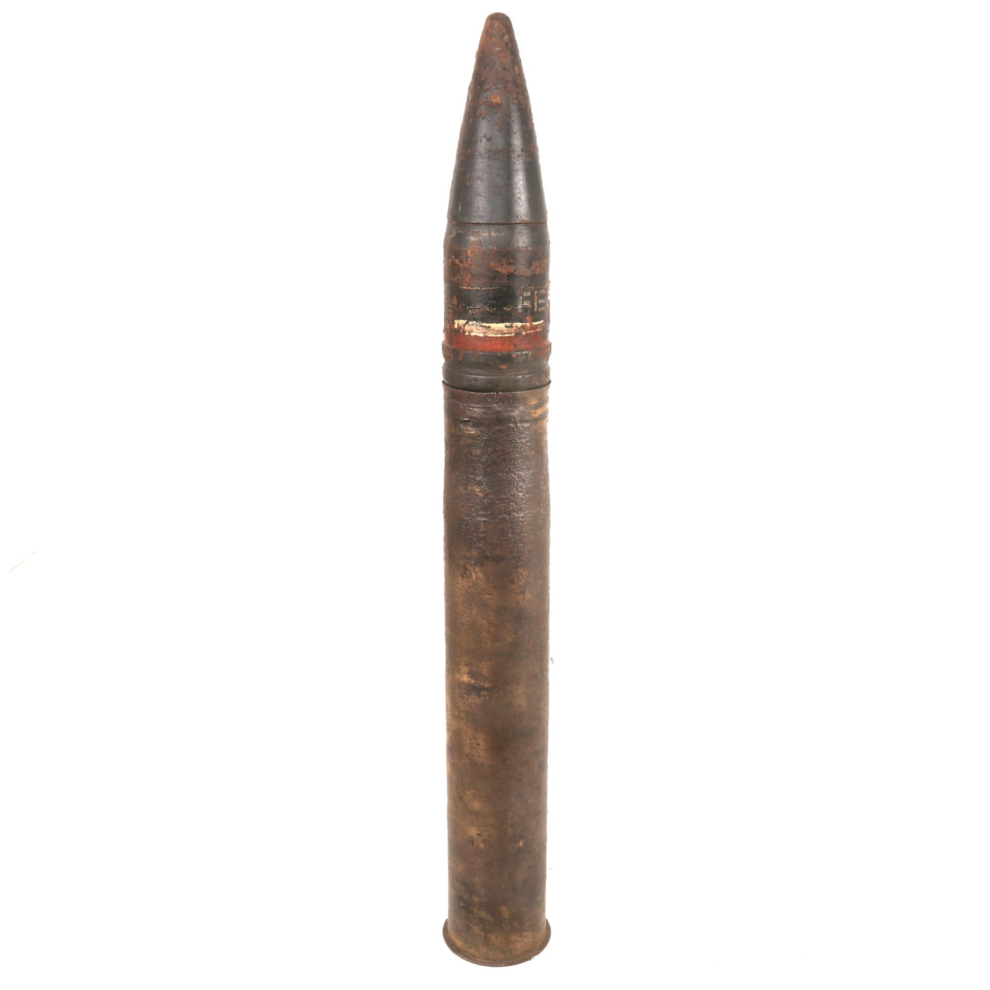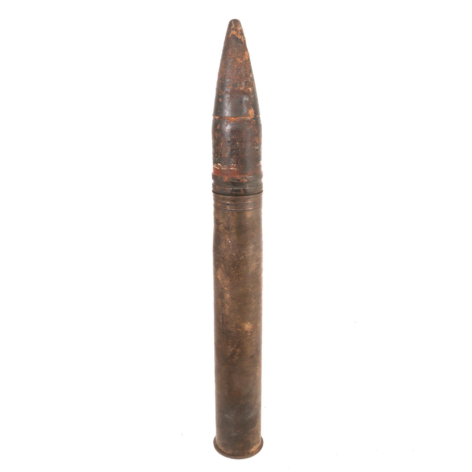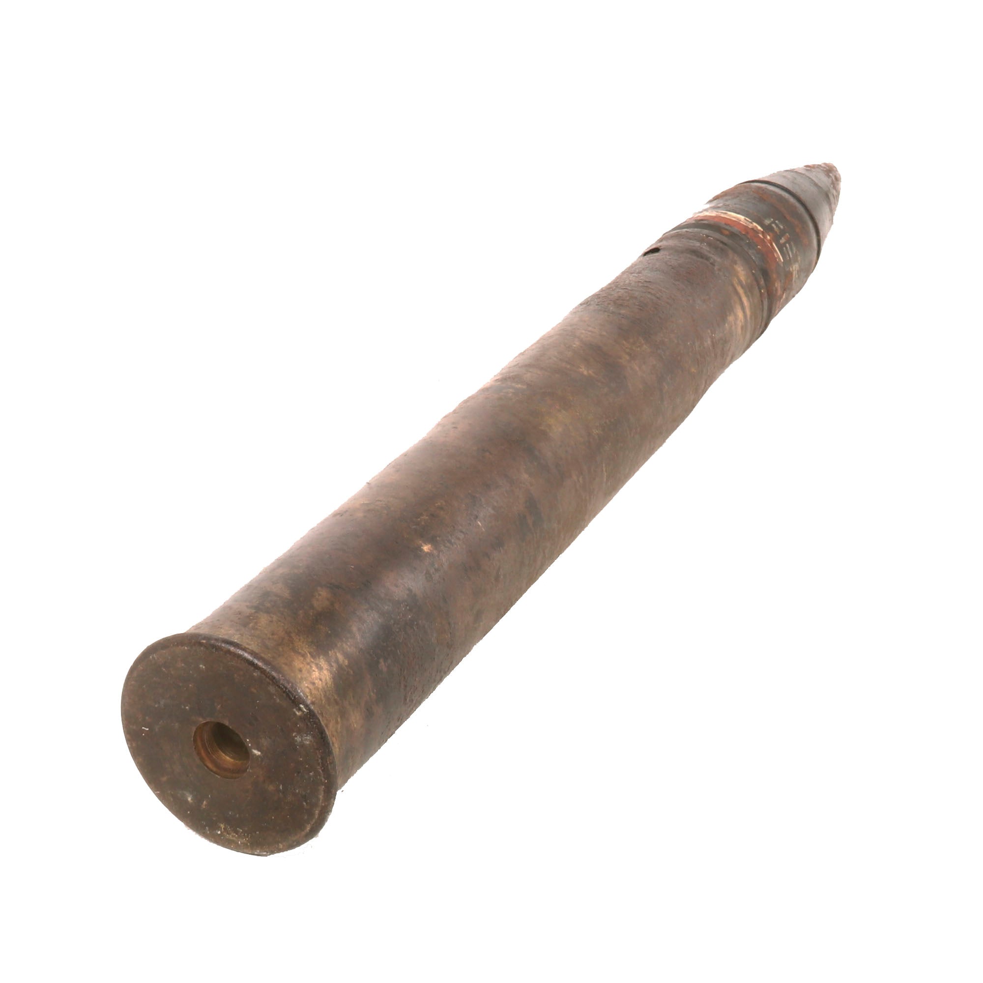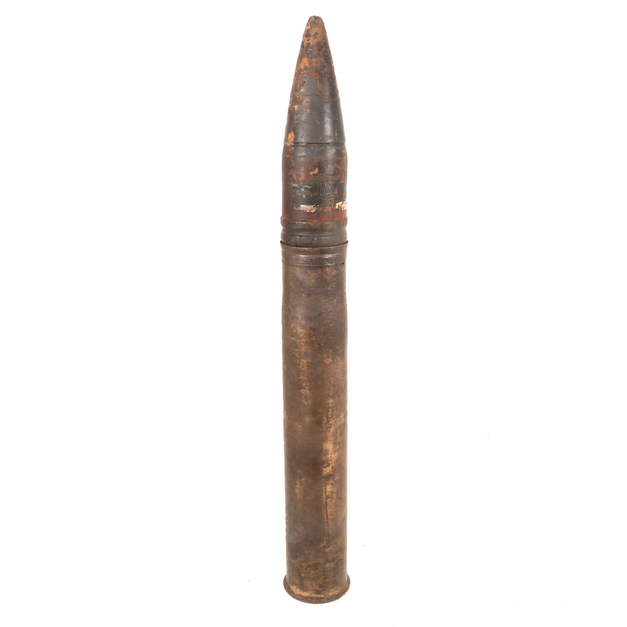 Original Item. Only One Available. The 10.5 cm SK C/32 (SK - Schiffskanone (ship board cannon) C - Construktionsjahr (year of design), was a widely used German naval gun on a variety of Kriegsmarine ships during World War II. Originally designed as a surface weapon, it was used in a number of other roles such as anti-aircraft and coastal defence; wet-mounts were developed for U-boats. On the base of the round are the German Navy acceptance stamps, with the well-known Eagle M Kriegsmarine proof. Like all deactivated ordnance, this projectile is Not Available for Export.This is a tremendously rare armor-piercing round for the SK C/32 Naval Cannon. The bottom of the casing is heavily deteriorated, but some markings can still be discerned, most notably the Kriegsmarine Eagle M inspection marking which verifies this as a Naval round. Due to heavy oxidation and deterioration, some markings are too difficult to make out. The parts we can read are:ck 44(KM Eagle)10.5cm-3/2This denotes a manufacture date of 1944, but we couldn’t discern much else. The side of the projectile does retain partial markings but only partial due to the heavy oxidation, and none of the markings we saw really helped much. There is a white over red band painted around the projectile. Thankfully, we were able to unscrew the bottom piece of the projectile, and inside were some very clear markings, reading:BdZf 10cm PzgrRhS 166 1938 11e* (Waffenamt Eagle) WaA121The casing of the round has some cracking and holes in the side and edges due to extremely heavy oxidation. The round does sit fine in the casing but it takes time to get it to sit properly. With the projectile inserted, the round measures 39¾” tall and 5” in diameter.A great example of a scarce round, ready for further research and display.The 10.5 cm SK C/32 was a built-up gun, 45 calibers long, with a jacket and breech that weighed about 1.8 tons. The gun fired 10.5 centimeters (4.1 in) fixed ammunition, which was 1.51 m (5.0 ft) long, weighed 24.2 kg (53 lb) and had a 4.08-kilogram (9.0 lb) propellant charge. Useful life expectancy was 4,100 effective full charges (EFC) per barrel.The 10.5 cm SK C/32 was widely deployed on three different types of single mounts. The high-angle MPLC/30 was a modified 8.8 cm mount. The low-angle MPLC/32 was used on Type 35 torpedo boats, Type 37 torpedo boats and Type 40 minesweepers. The high-angle MPLC/32 gE was used on the cruiser Emden, the battleship Schlesien, the battleship Schleswig-Holstein, Elbing class torpedo boats, Type 35 minesweepers and Type 43 minesweepers.The 10.5 cm SK C/32 was the standard low-angle deck gun mounted forward of the conning tower in type I, type IX and type X U-boats. The Ubts LC/32 mounting used in type I and early type IX U-boats weighed about 5 tonnes. Later type IX and type XB U-boats used the lighter Ubts LC/36 mounting with a maximum elevation of +30° .[1] During the early war years, these guns were used to encourage surrender of independently routed merchant ships or to sink ships damaged by torpedoes.Some of these guns were later removed from U-boats for mounting aboard type 40 minesweepers after unshielded deck guns proved impractical in action against Defensively Equipped Merchant Ships and escorted trade convoys.