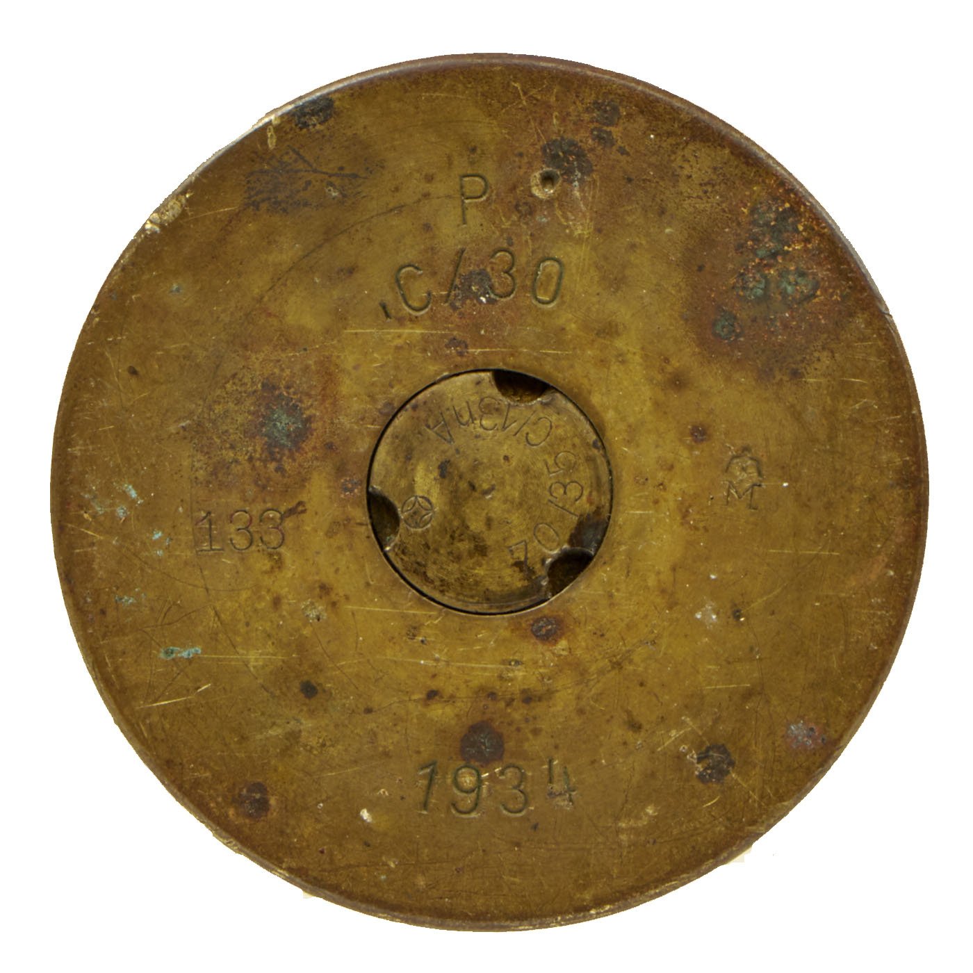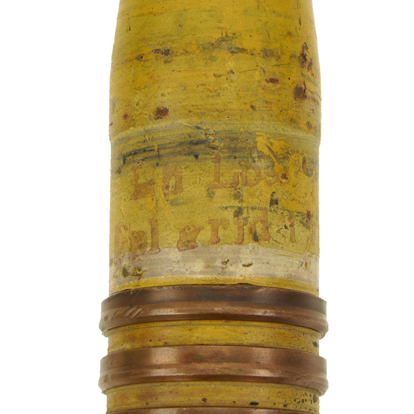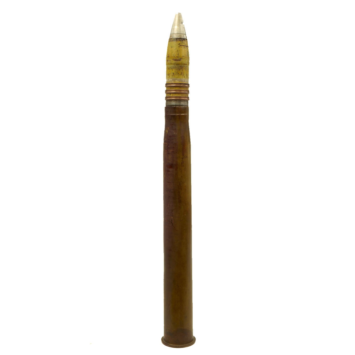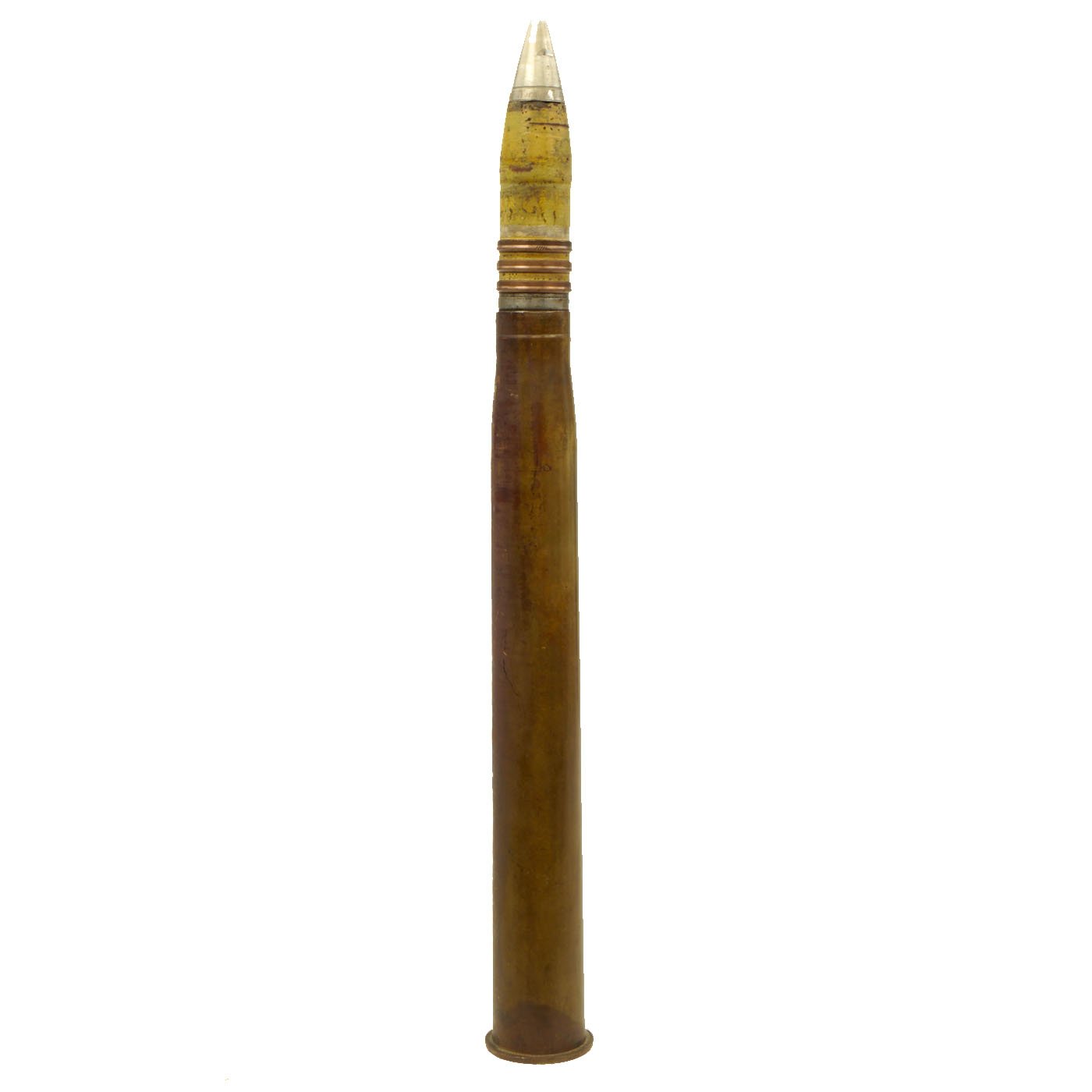 Original Item: Only One Available. Fantastic and hard to find WW2 German 3.7cm Naval flak inert shell, Dated 1934 and clearly marked with an M for Marine (Naval). It measures 14.5 inches high. The fuse is stamped with Waffen acceptance stamp. The projectile has the correct ordnance, maker and date stamps as does the brass shell base. The yellow paint denotes H.E. with tracer.