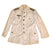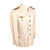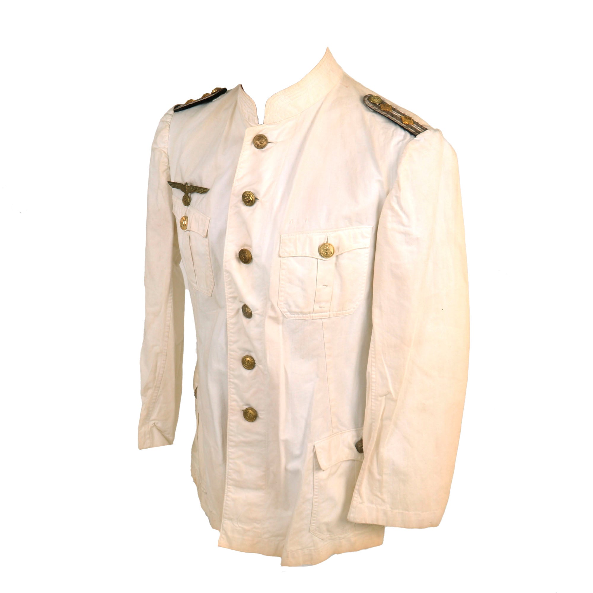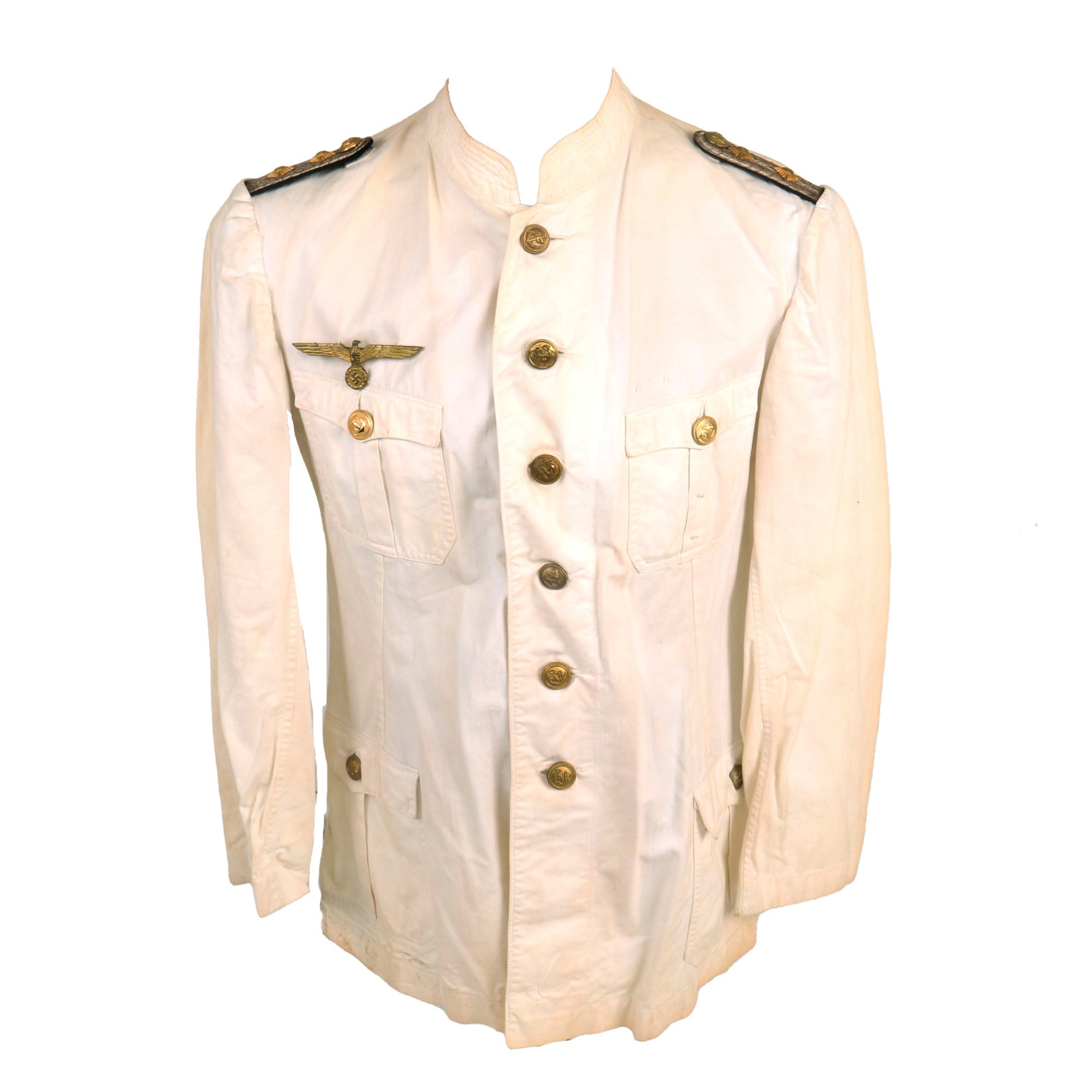 This very nice condition summer uniform tunic is fabricated from white cotton, and features a "banded collar", with no fold down portion or lapels, giving a very sleek look when worn. There are four pockets on the front with scalloped flaps, one on each breast and larger ones at the waist on both sides. Each is designed with a decorative pleat and gilt Kriegsmarine buttons, each of which is maker marked and are held in place by clips on the inside of the pocket embedded in the pleat. The front of the jacket has a vertical row of six Kriegsmarine gilt buttons, also maker marked held in place by clips on the underside and visible on the inside of the tunic under a flap.