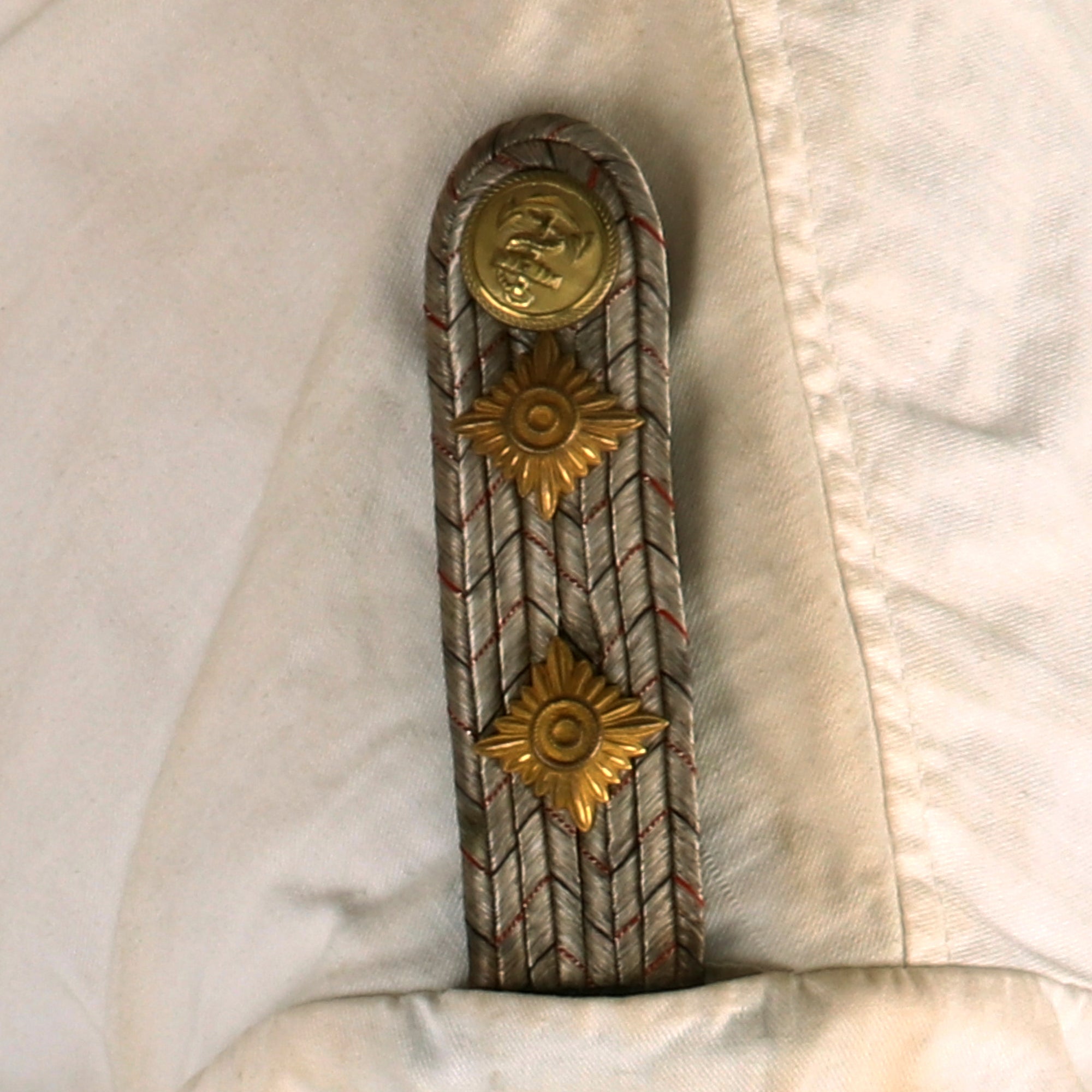 The officers Schulterstücken (Shoulder boards) of this tunic are constructed with two rows of fine silver flatware "Russia Braid" double piping and have the correct navy blue backing for the Kriegsmarine field uniforms. They are the type that slides through a slot in the shoulder seam, and is held in place by a wider piece on the end, with the other end attached to the button on the uniform. There are two rank "pips", indicating a Kapitänleutnant, a rank equivalent to a U.S. Navy Lieutenant. Interestingly, there are thin blue and red chevrons woven into the Russia Braid, which was the style used during WWI with the Kaiserliche Marine, and probably during the Weimar period..