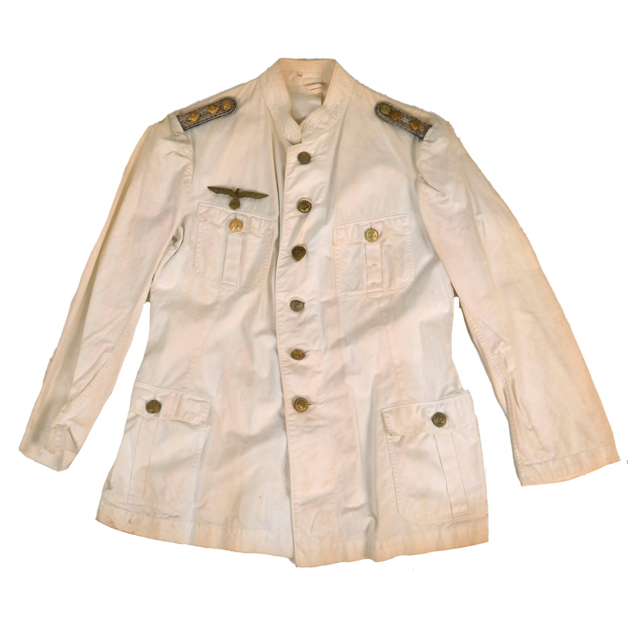 The right breast above the pocket is enriched with a Summer Kriegsmarine Metal breast eagle insignia pin held in place via two vertically-aligned vertical loops in white threading for the pin, with a horizontal loop below for the hook on the bottom. There are additional thread loops over and on the left breast pocket, for awards not included on the uniform. There is no size or maker mark inside the tunic, just a small label reading 50 in red on the back of the collar.