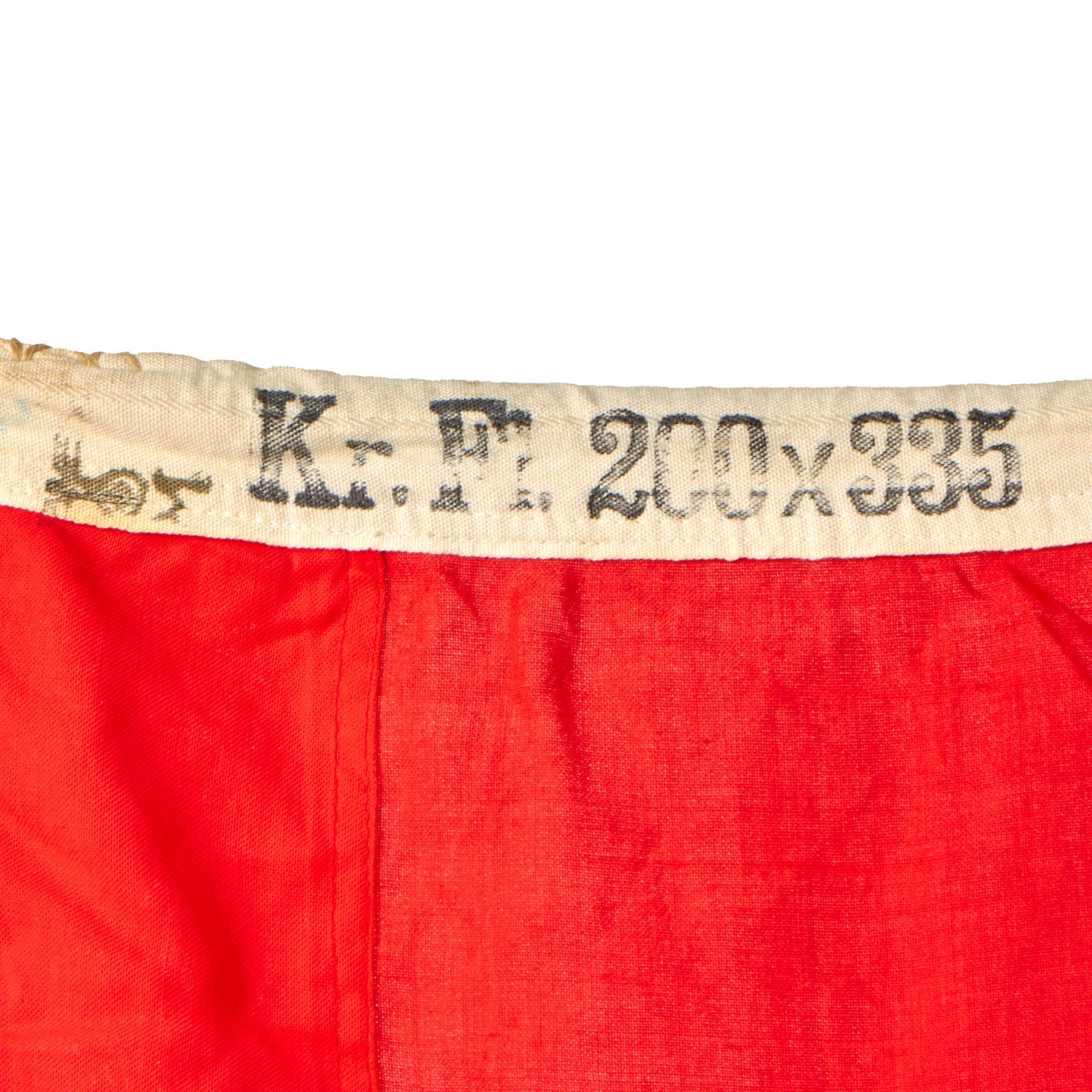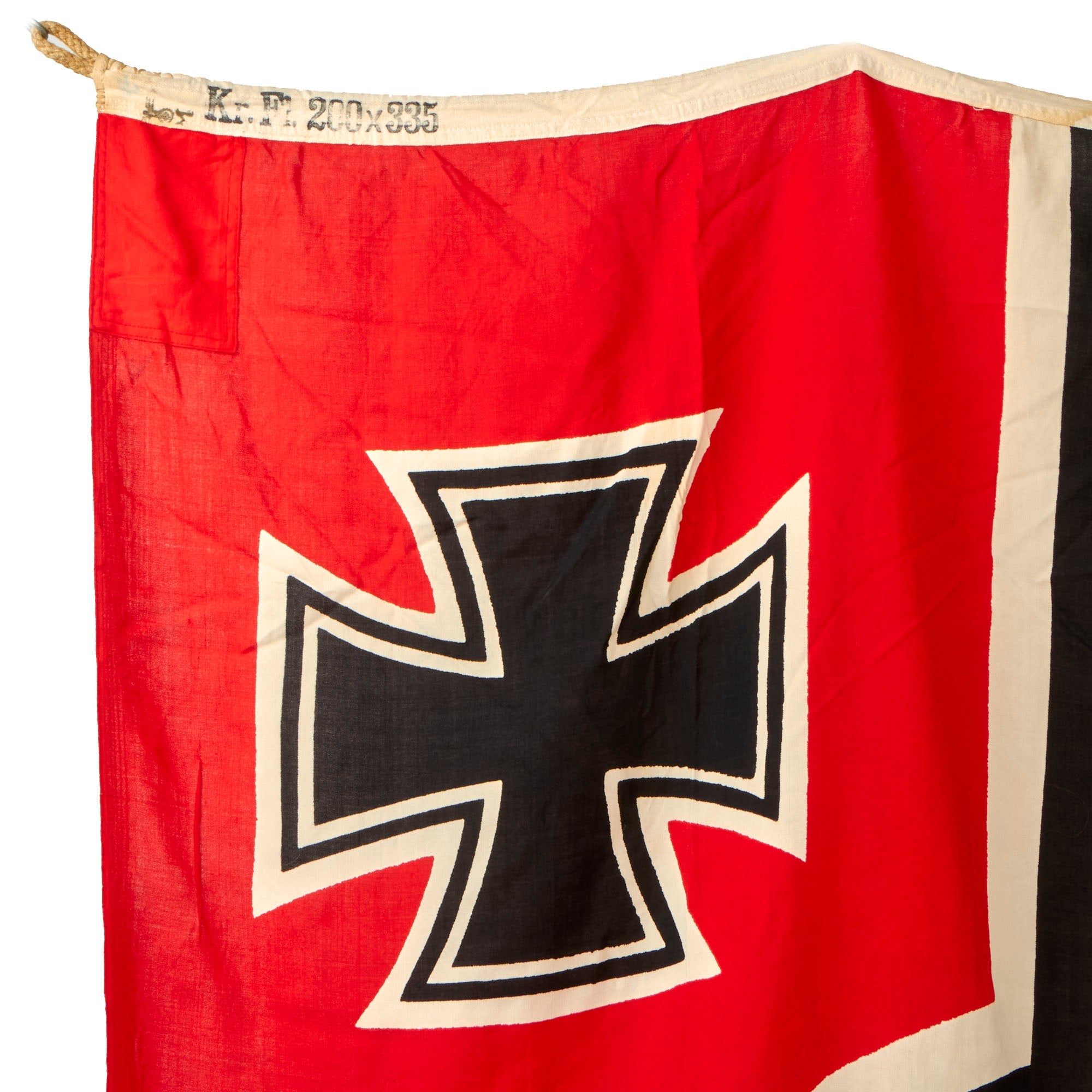 This indicates that it is a 200cm × 335cm (2m × 3.35m) [Reichs]kriegsflagge. The other end of the header on this example is actually marked with the maker, which we do not often see on these larger flags: