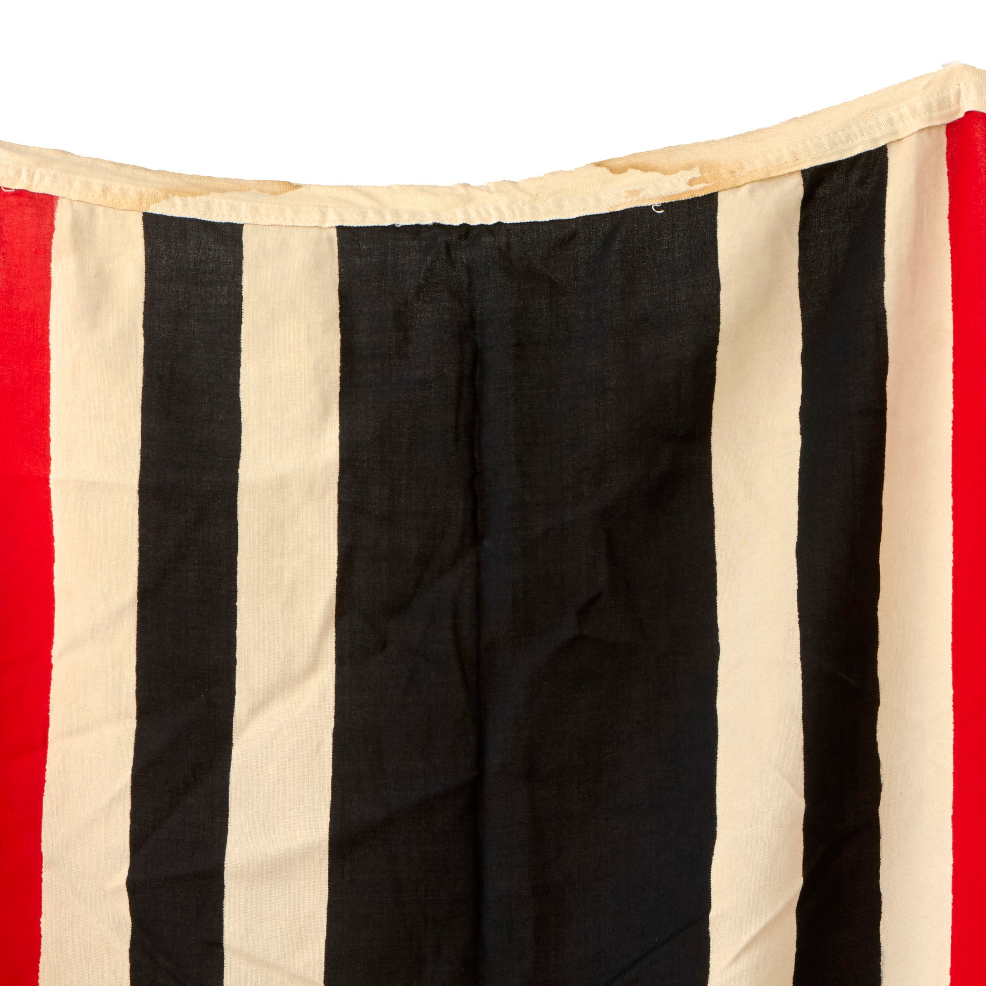 This Naval battle flag is totally original and is in very good lightly used condition, showing some age toning as well as staining on the header, but with no major wear such as holes or tears. It looks like it was probably in storage, and got wet on the way home, or possibly during long storage.