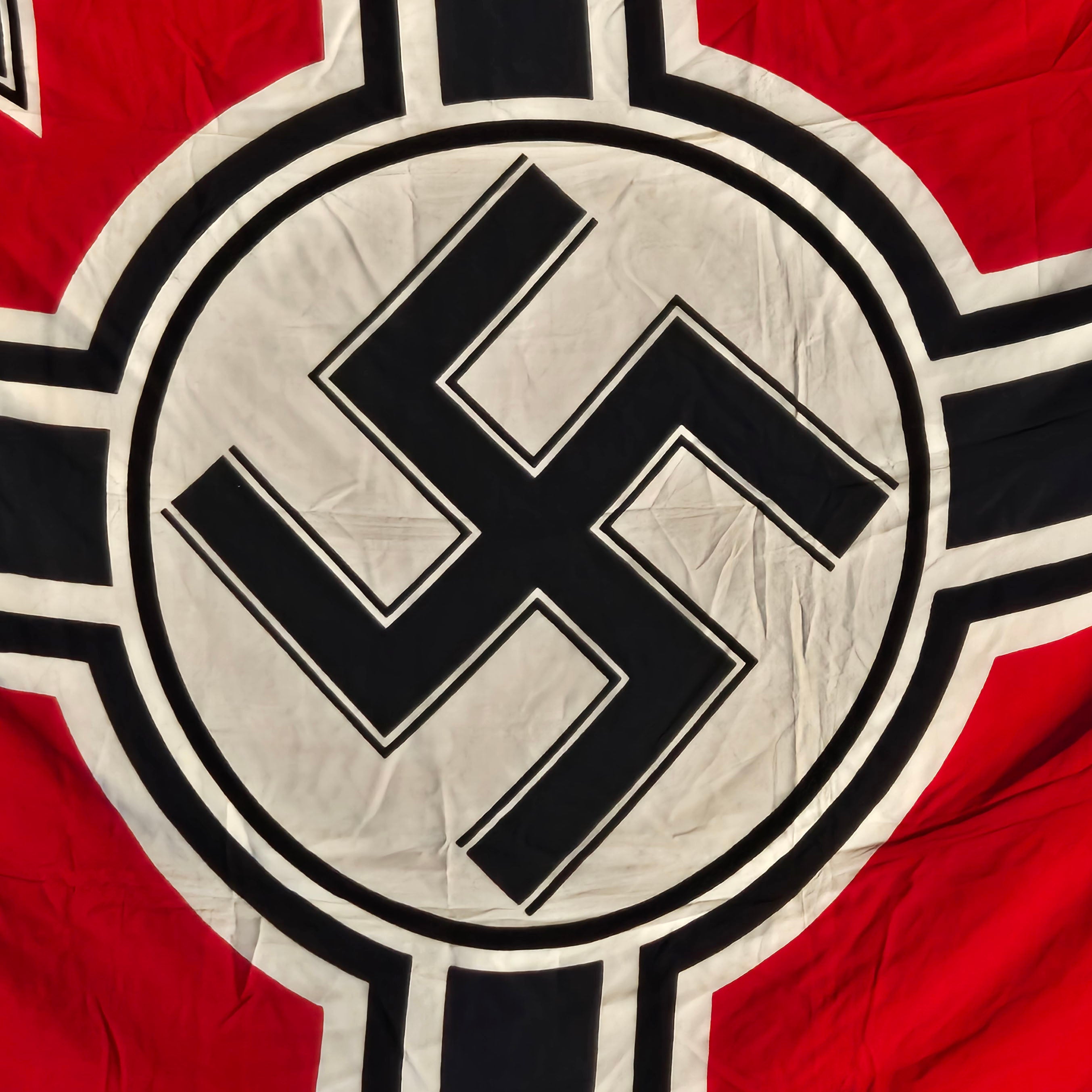 Original Item: Only One Available. The Reichskriegsflagge (Imperial War Flag) was the official name of the war flag and war ensign used by the German armed forces from 1933 to 1945. Recently acquired from a private collector, this is without a doubt the most impressive battle flag design of the German WWII era, in a nice medium large size. It measures 78.7" x 131.9", or 200cm x 335cm. This larger size indicates it would have been used on a sizable ship.