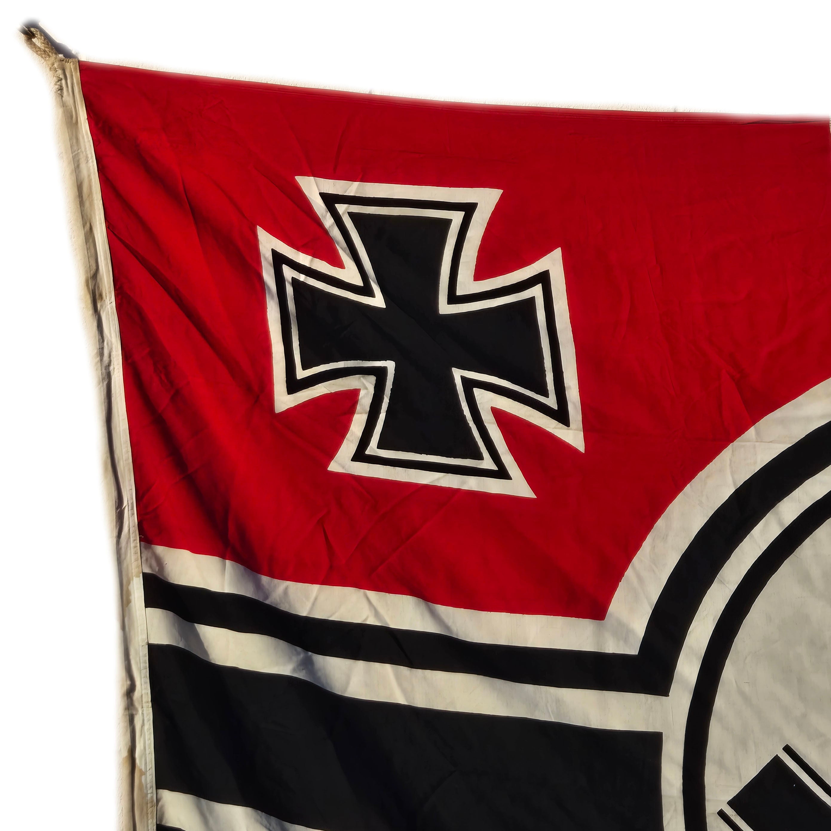 The proportions of the flag are 3:5. Fusing elements of the NSDAP German Flag (swas and red background) with that of the old Imperial Reich War Flag (four arms emanating from off-center circle and Iron Cross in the canton), these flags were uniformly produced as a printed design on bunting.