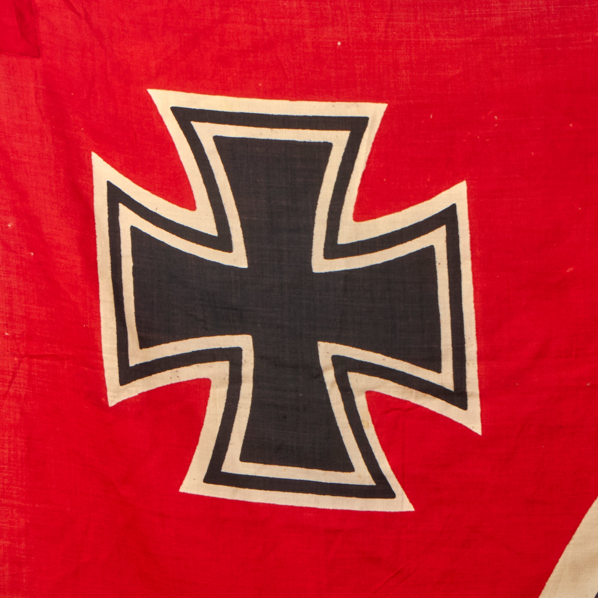 The proportions of the flag are 3:5. Fusing elements of the NSDAP German Flag (swas and red background) with that of the old Imperial Reich War Flag (four arms emanating from off-center circle and Iron Cross in the canton), these flags were uniformly produced as a printed design on bunting.