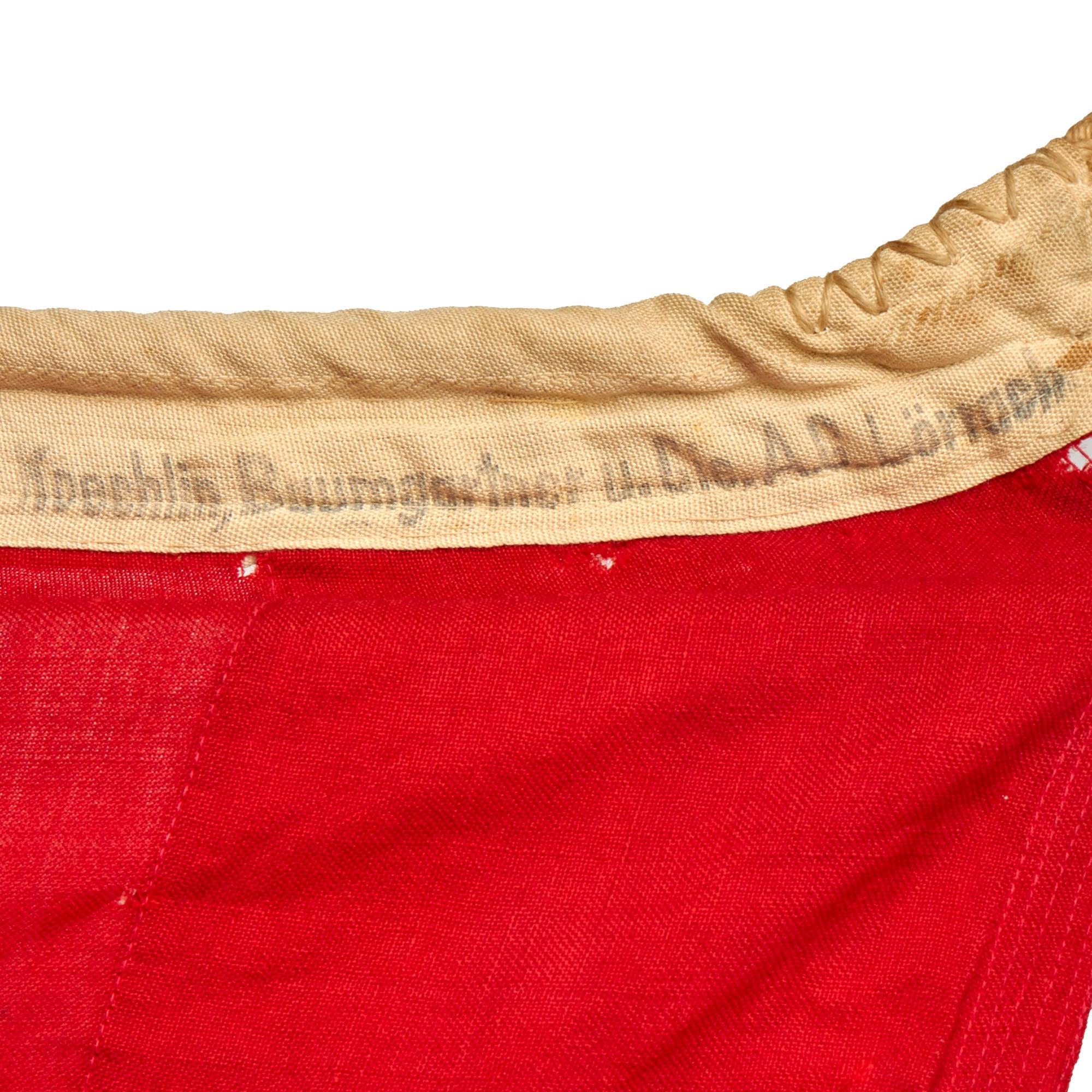 This indicates that it is a 200cm × 335cm (2m × 3.35m) [Reichs]kriegsflagge. The other end of the header on that side has the name W.E. WALTON written on it, most likely the soldier who brought it back. The other side of the header on this example is actually marked with the maker, which we do not often see on these larger flags: