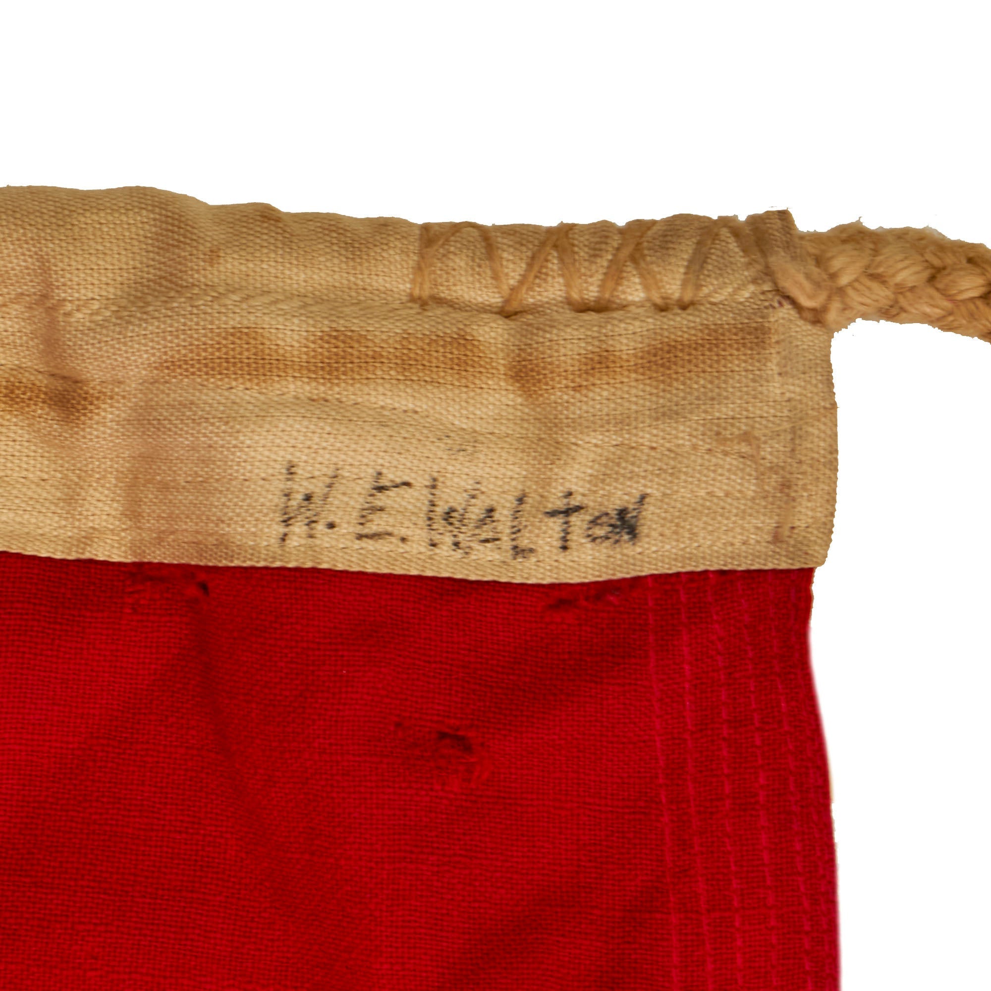 This Naval battle flag is totally original and is in very good service used condition, showing some age toning as well as light staining. The header of the flag is a bit worn, as is the halyard, and there are holes, tears, and other wear to the body of the flag consistent with service.
