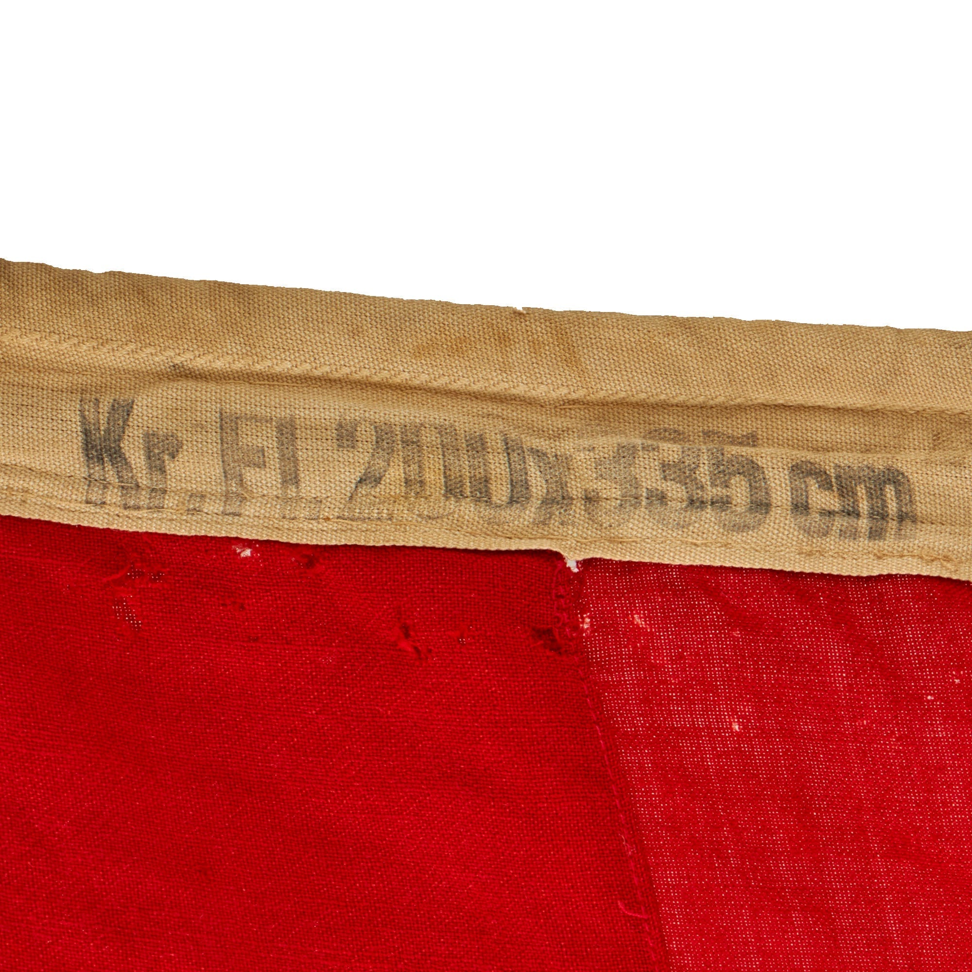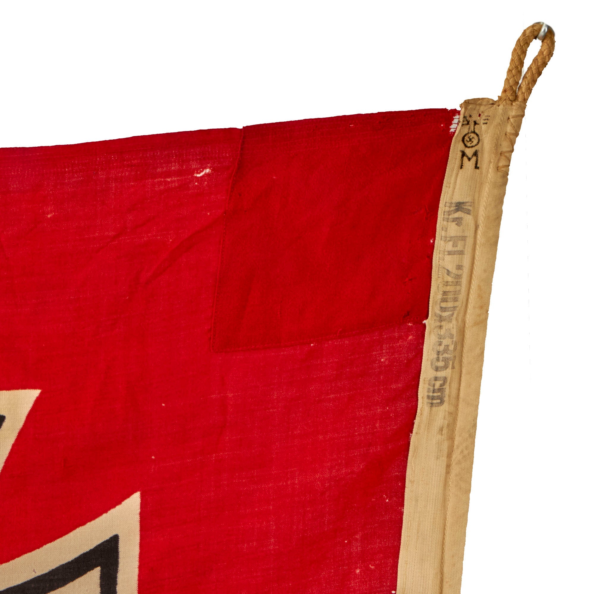 The flag is marked on the header with a black Eagle / M indicating German Kriegsmarine (Navy) acceptance. The header is also stamped right next to this with the correct naval designation and size number, along with the measurements: