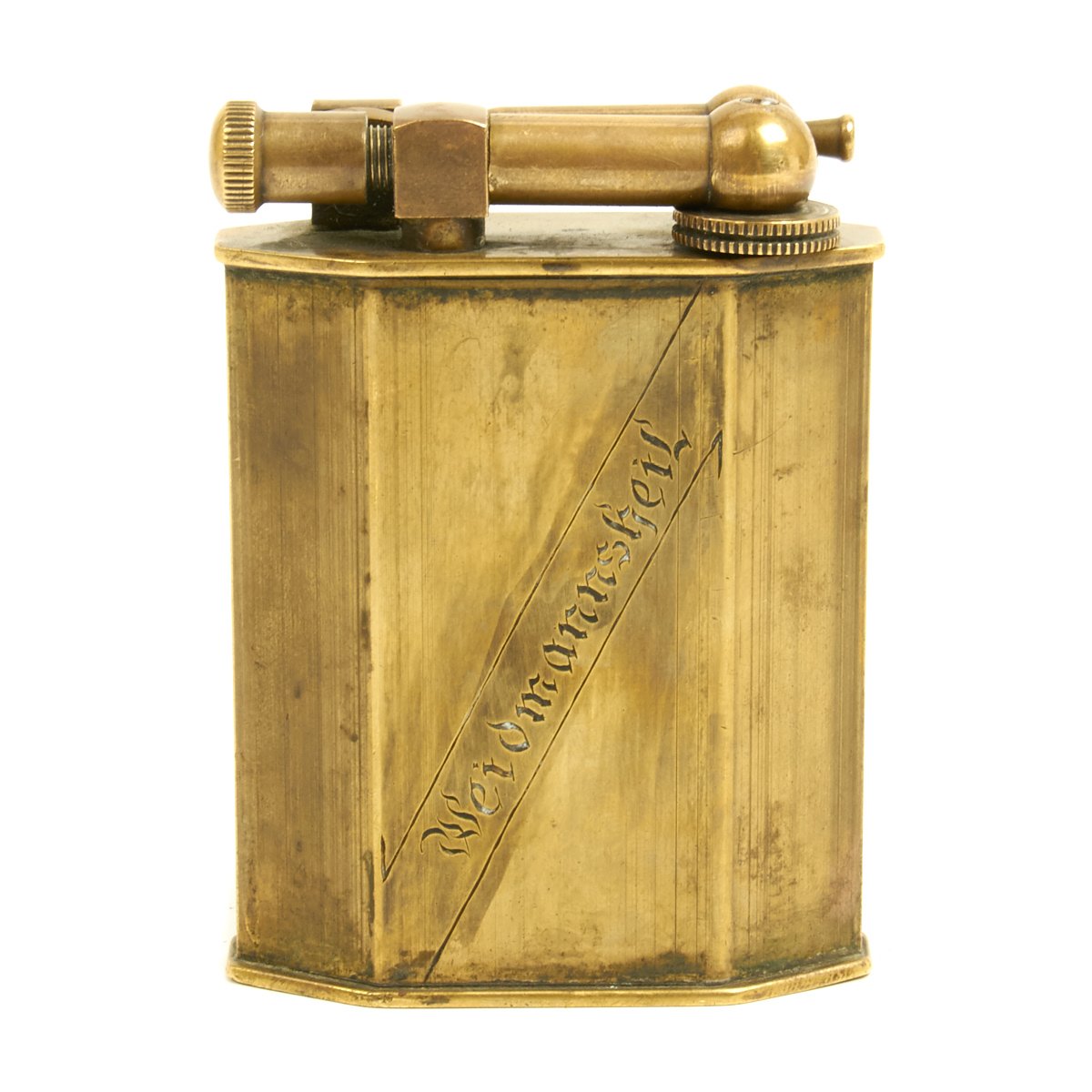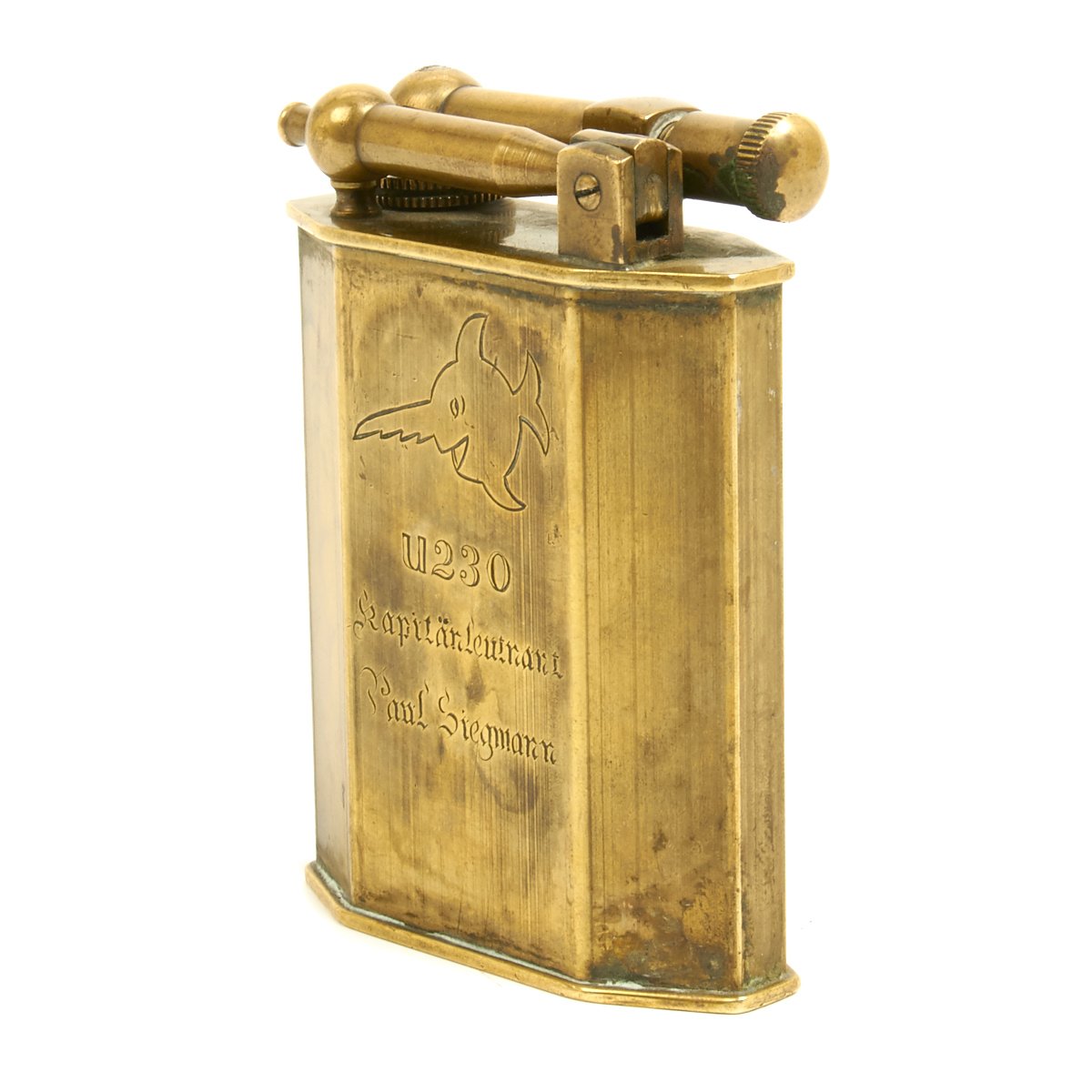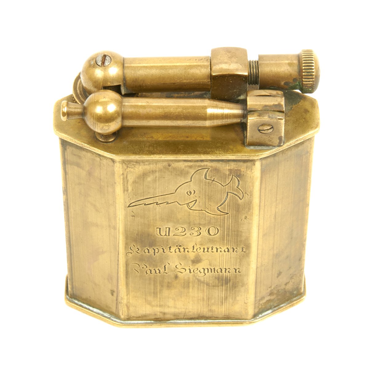 Original Item: One of a Kind. This is an all brass substantial table lighter measuring 4" tall by 3" across. These lighters were often custom made by the workers in the U-boat's engine room, as they had to be skilled in metalwork as part of their duty. The cover for the flame hinges up, after which it can be ignited with the wheel next to it.
