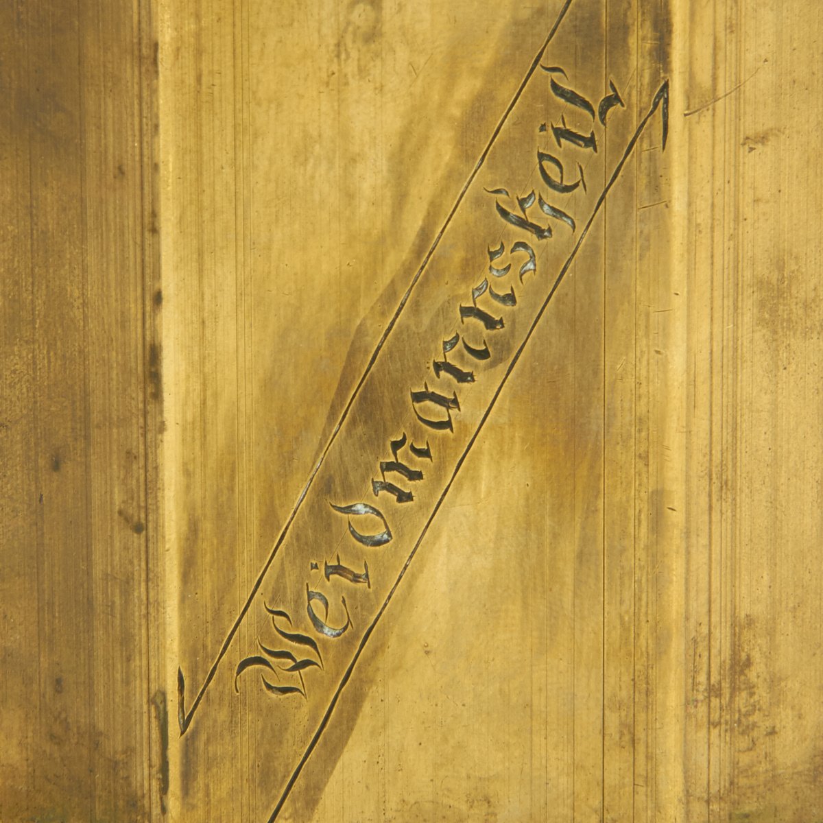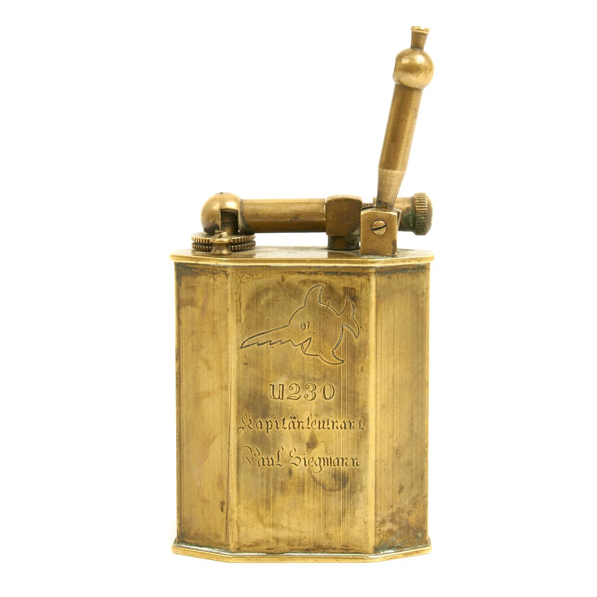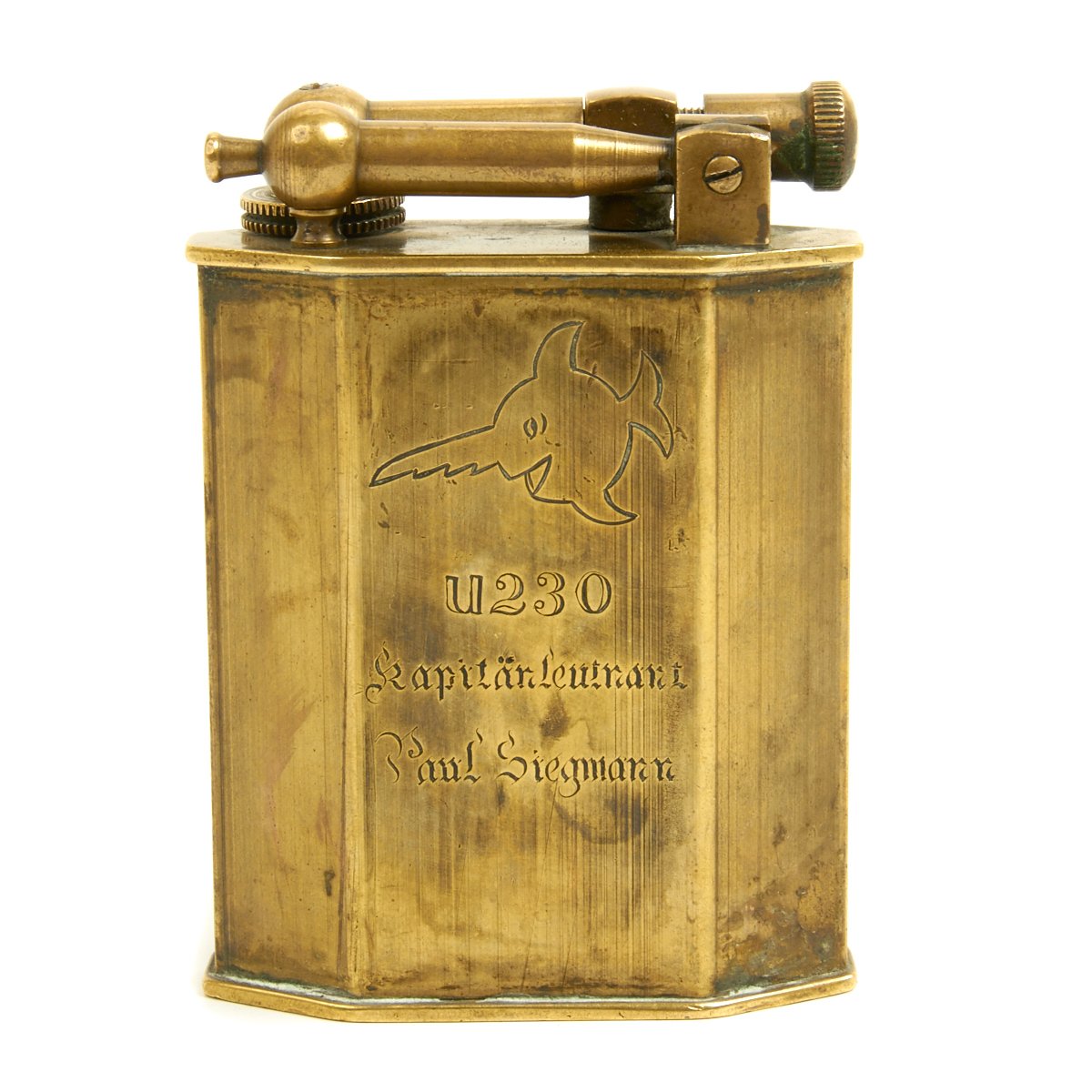 Original Item: One of a Kind. This is an all brass substantial table lighter measuring 4" tall by 3" across. These lighters were often custom made by the workers in the U-boat's engine room, as they had to be skilled in metalwork as part of their duty. The cover for the flame hinges up, after which it can be ignited with the wheel next to it.