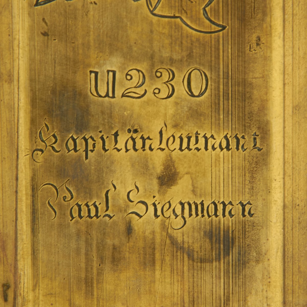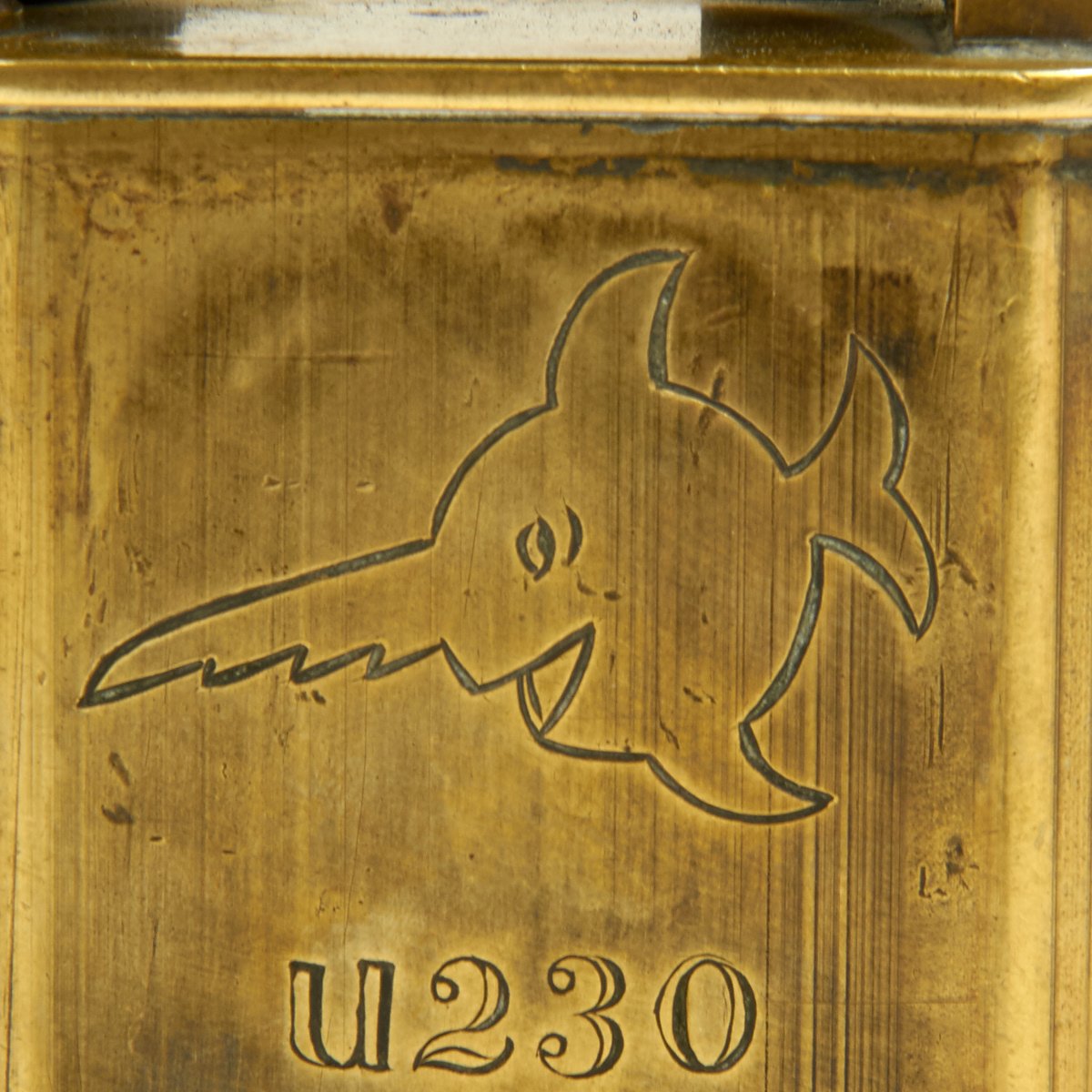 It is engraved Weidmannsheil across one side, meaning "GOOD HUNTING, an apt statement for a U-boat captain. The back of the lighter is engraved with the "Laughing Swordfish" logo of the 9. Unterseebootsflottille (9th U-boat Flotilla). This was originally the conning tower insignia of the famous U-96 of "Das Boot" fame, commanded by Heinrich Lehmann-Willenbrock. When Lehmann-Willenbrock assumed command of the flotilla, he took the emblem with him. It is further personalized below the logo with an engraving in German Block Typeface:
