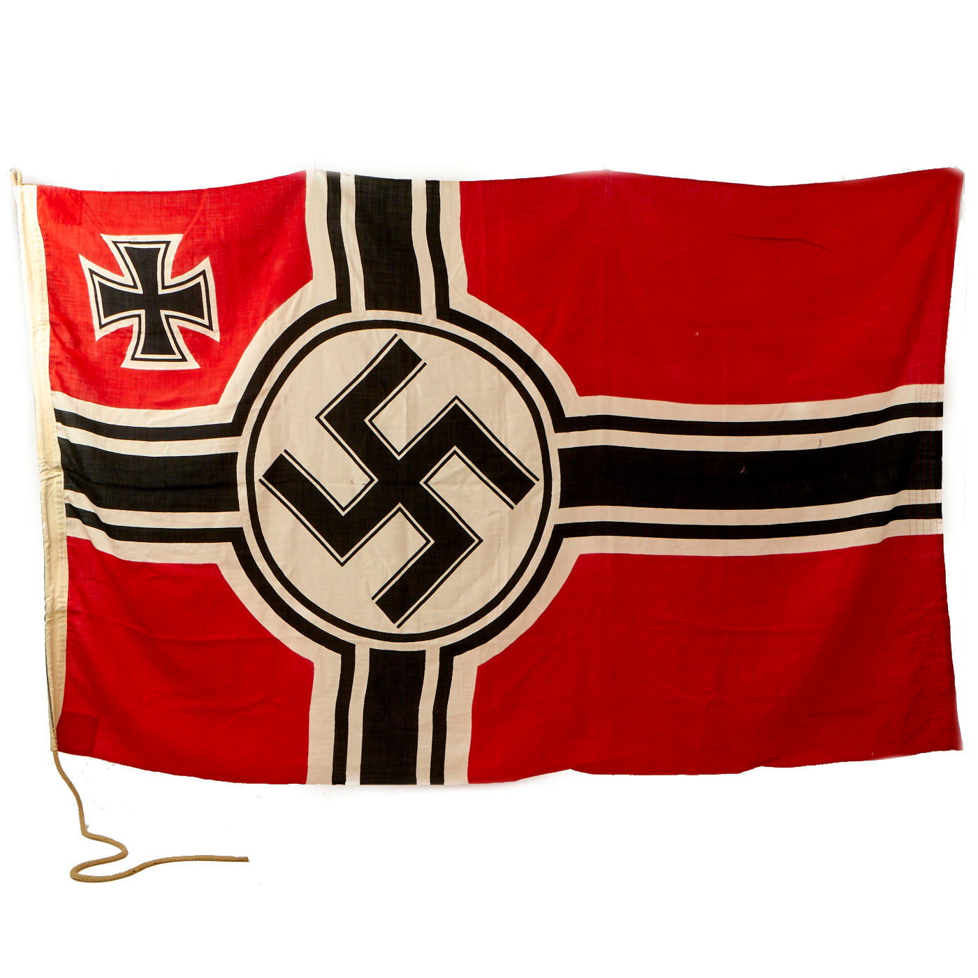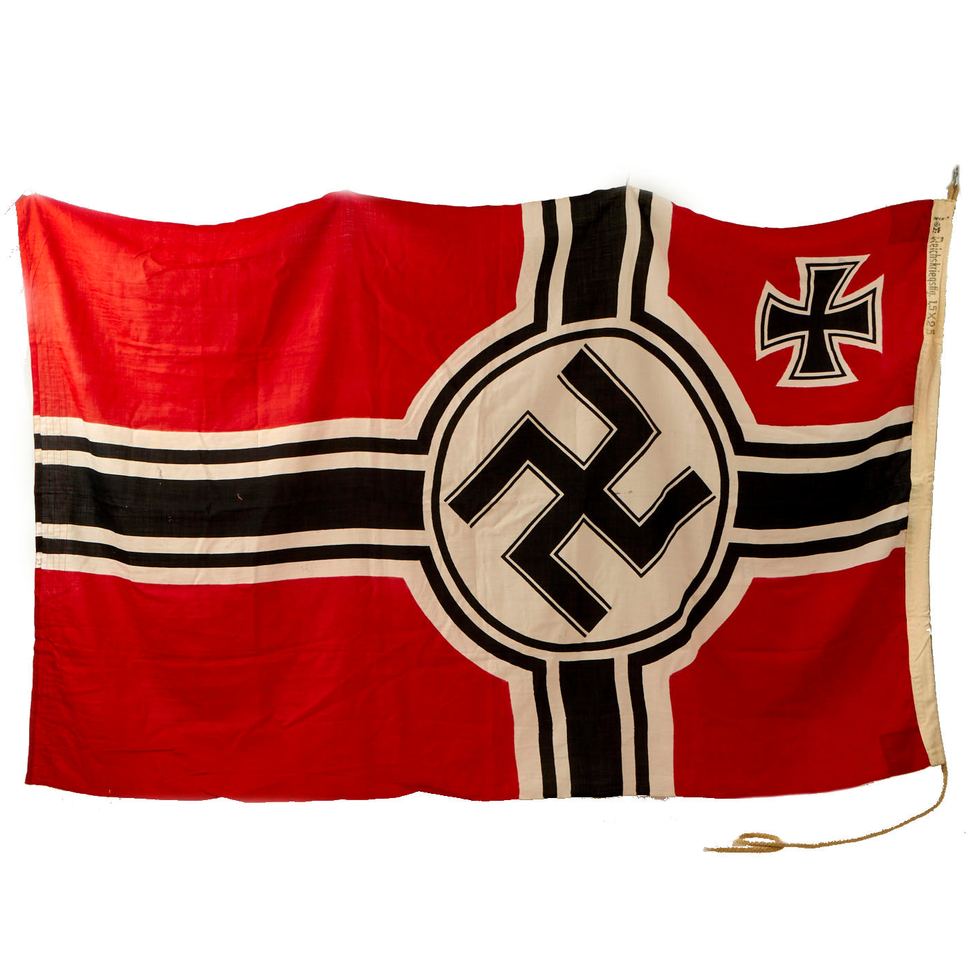 Original Item: Only One Available. The Reichskriegsflagge (Imperial War Flag) was the official name of the war flag and war ensign used by the German armed forces from 1933 to 1945. Recently acquired from a private collector, this is without a doubt the most impressive battle flag design of the German WWII era, in a nice large size. it measures 59.1" x 98.4", or 1.5m x 2.5m. This larger size indicates it would have been used on a sizable ship.