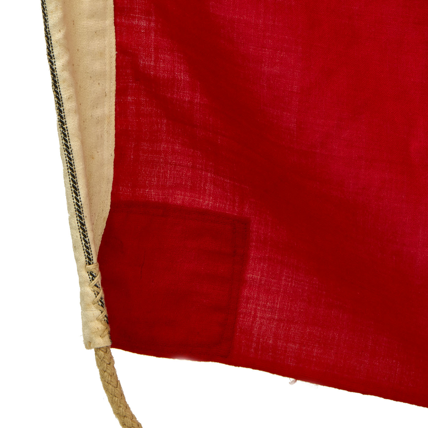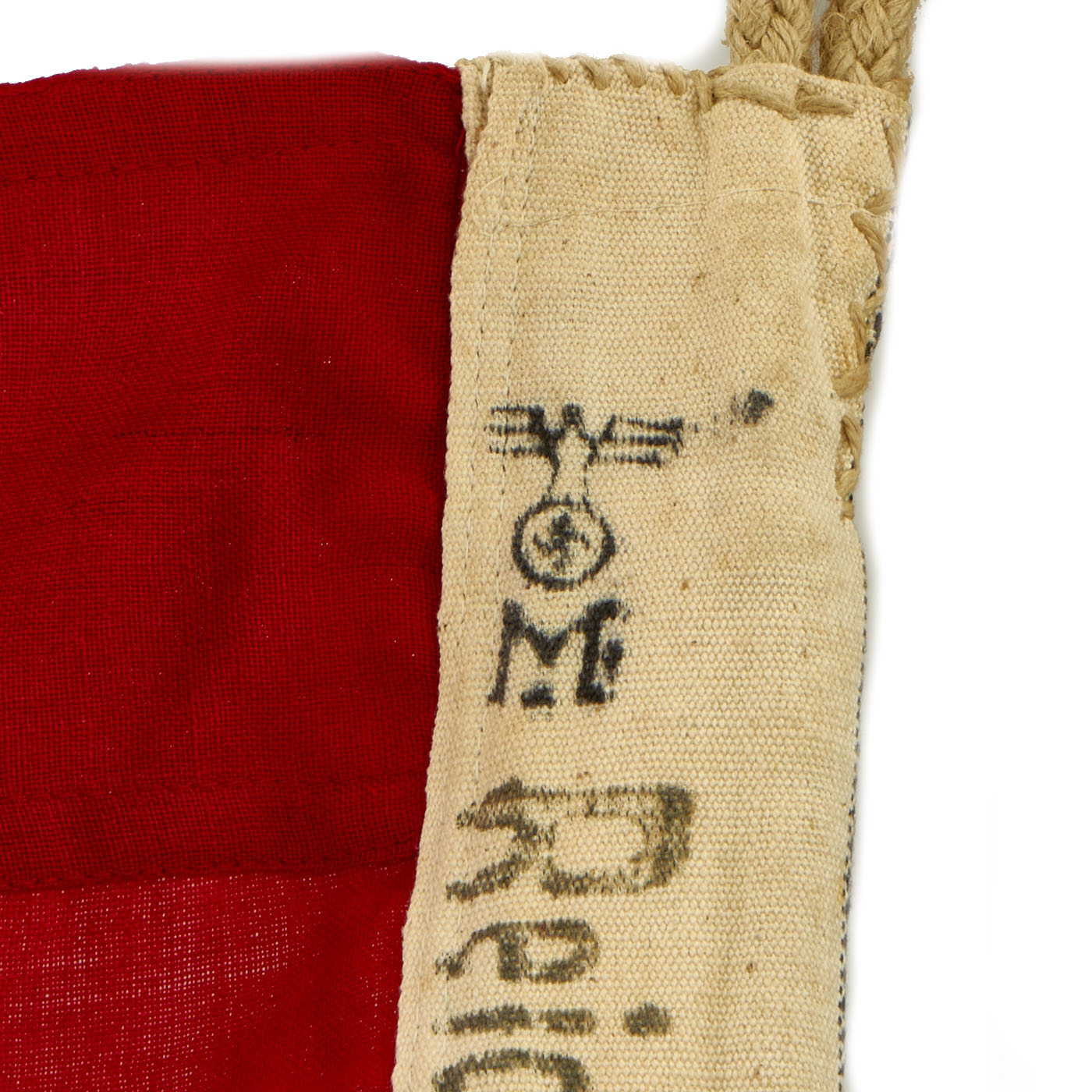This Naval battle flag is totally original and is in very good condition, with the expected wear and damage due to age. The wool construction is unfortunately prone to degradation and moth, which this flag does have to a small degree. There are scattered small holes and tears, but nothing major. The flag is marked on the header with the Eagle / M indicating German Kriegsmarine (Navy) acceptance. The header is also stamped on the left hand side with the flag type designation: