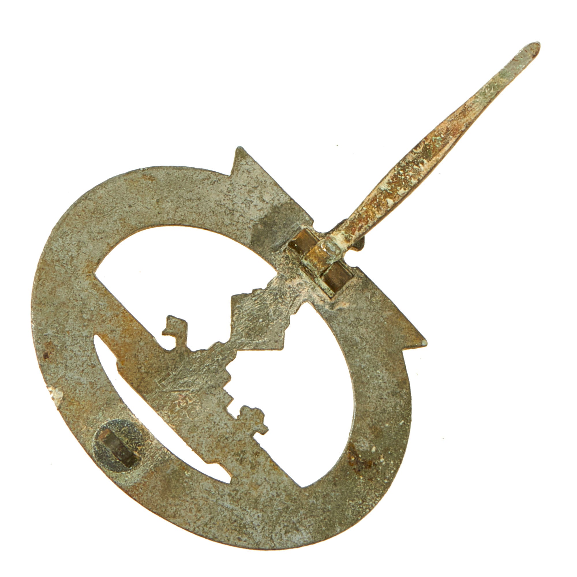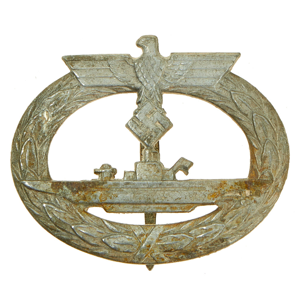 The U-boat War Badge was originally instituted during the First World War on February 1, 1918. It was awarded to recognize U-boat crews who had completed three war patrols. The badge was worn on the lower left side of the uniform and was oval shaped resembling a wreath of laurel leaves. A submarine lay across the center and the German State Crown (Reichskrone) was inlaid at the top center of the wreath.