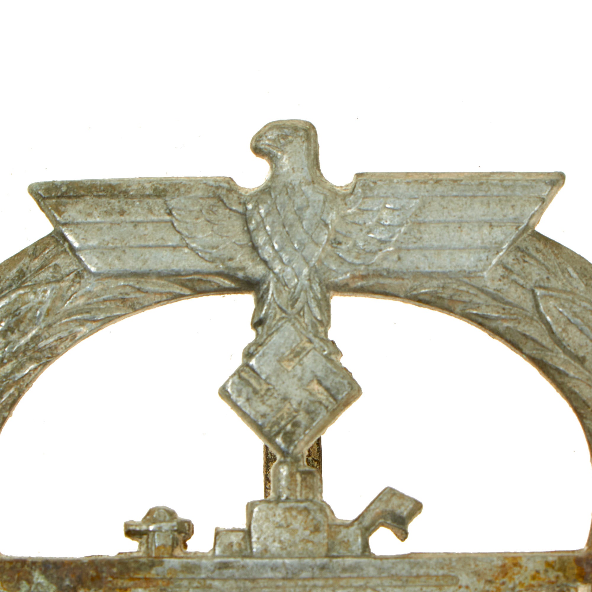 On October 13, 1939, the U-boat War Badge was reinstituted. It was very similar to the original badge with the exception of the imperial crown being replaced with a German Reichsadler (National Eagle) emblem, and a more modernized submarine now facing towards the left was used. The new version was first made of bronze metal, with later ones made of zinc with a "gold wash".