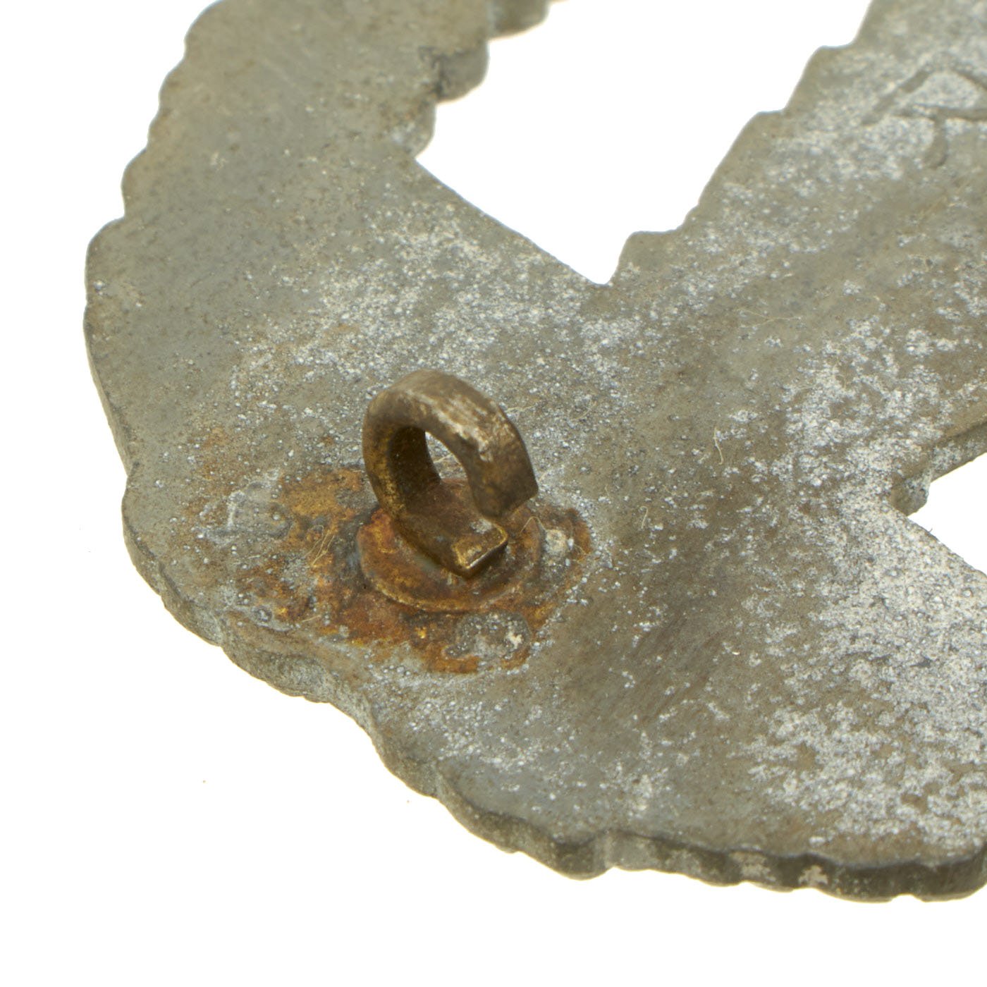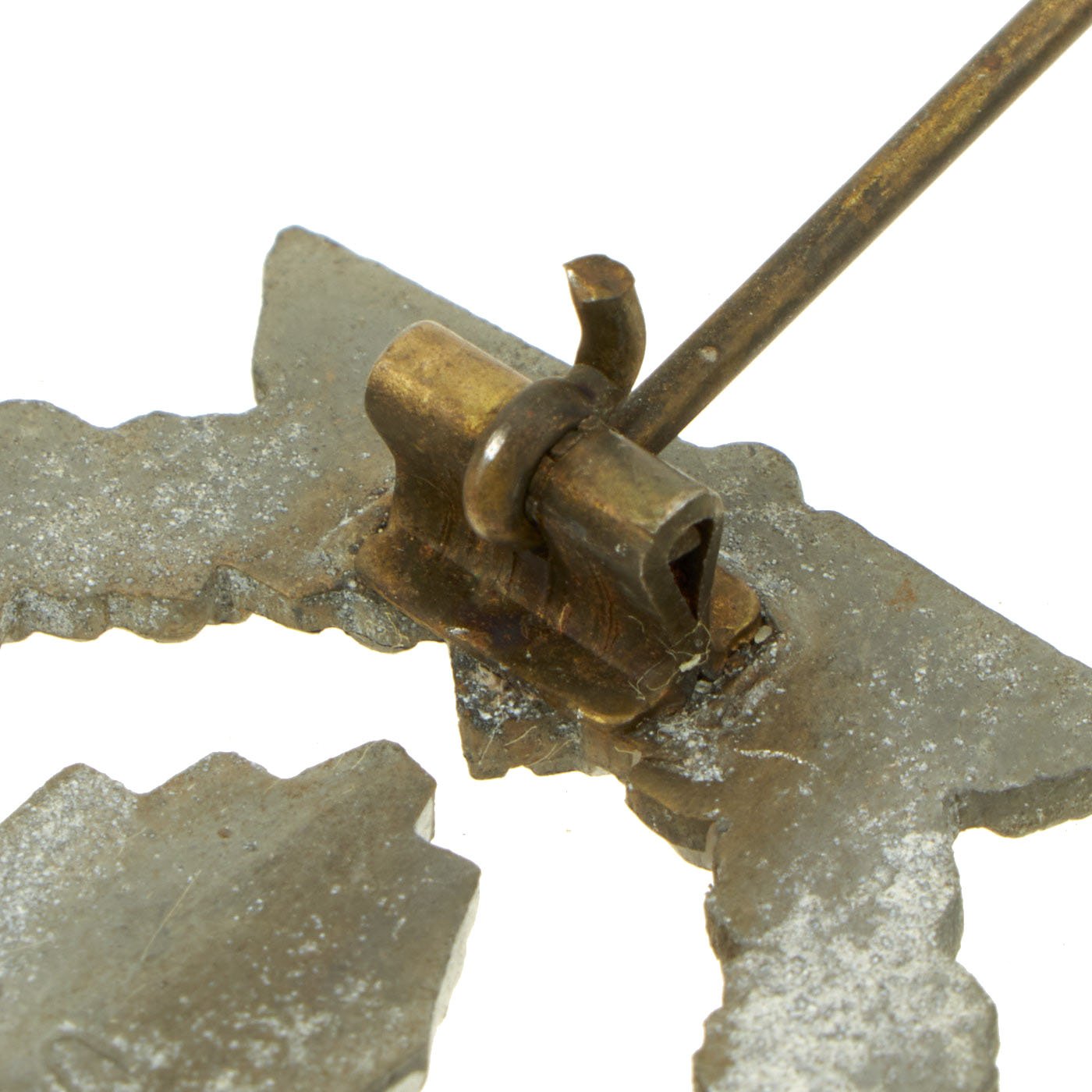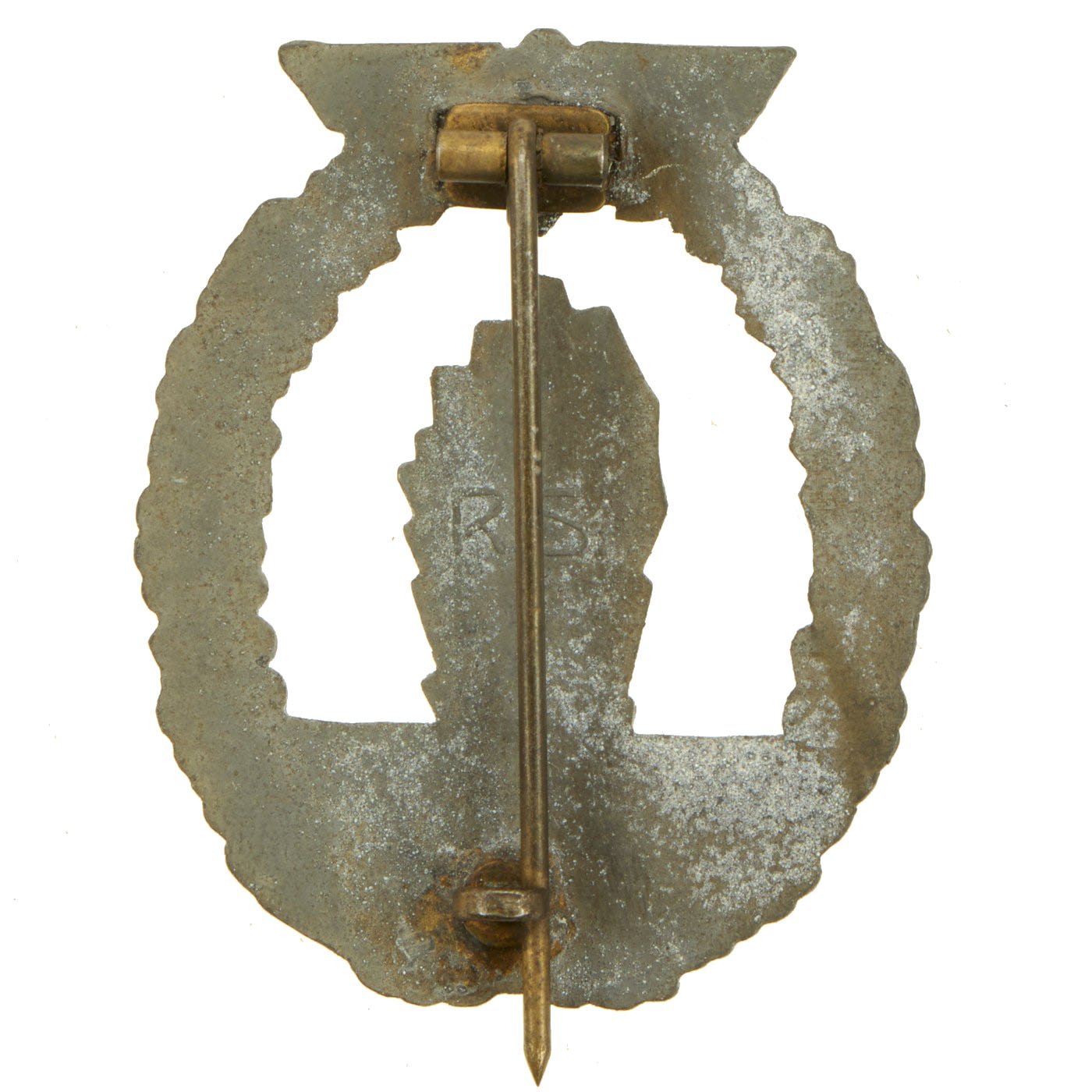 The badge is in very good condition, with a functioning pin back, and is a later war version made from die cast zinc. The silvering on the central portion still retained very well, however as with most later war badges, the gold wash is all but gone from the wreath. The front design consists of an oval oak leaf wreath, topped by a Wehrmacht eagle clutching a mobile swas (hook cross), with a central depiction of an exploding mine on top of detailed waves. The reverse is solid, with a standard pinback attachment.