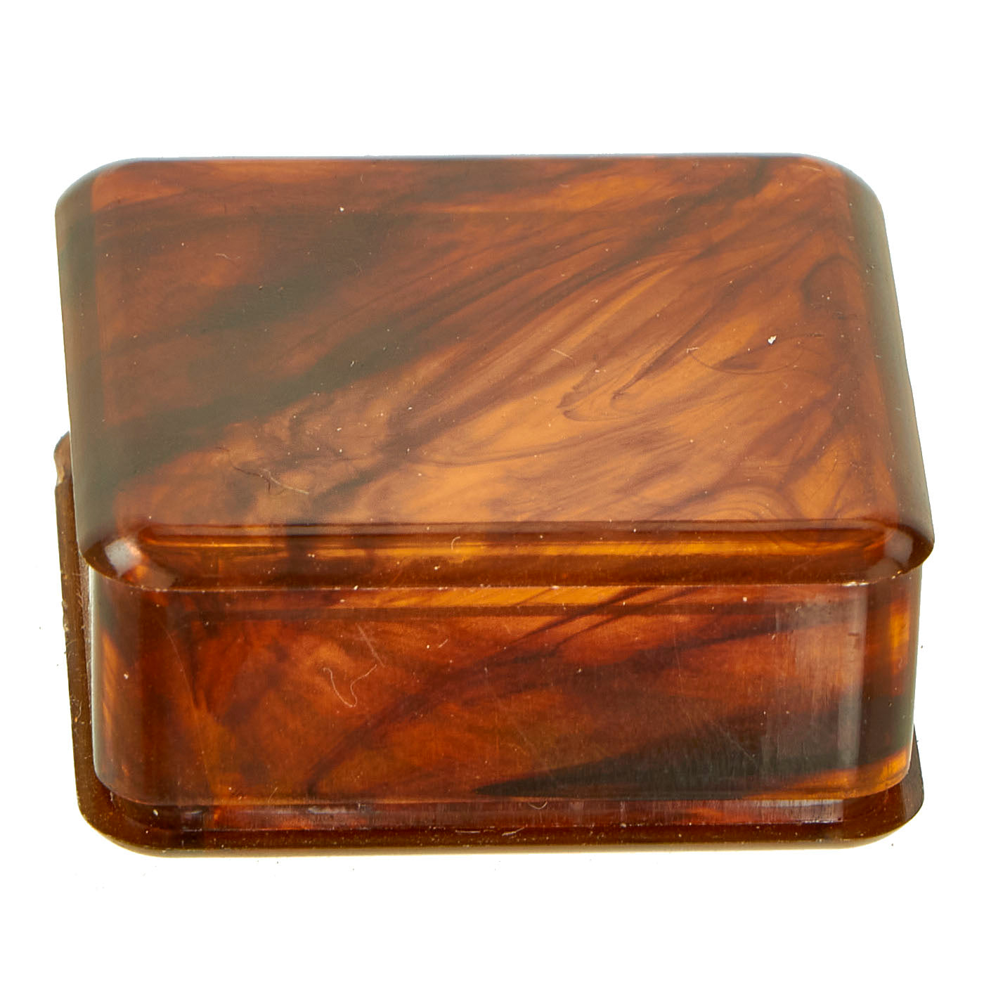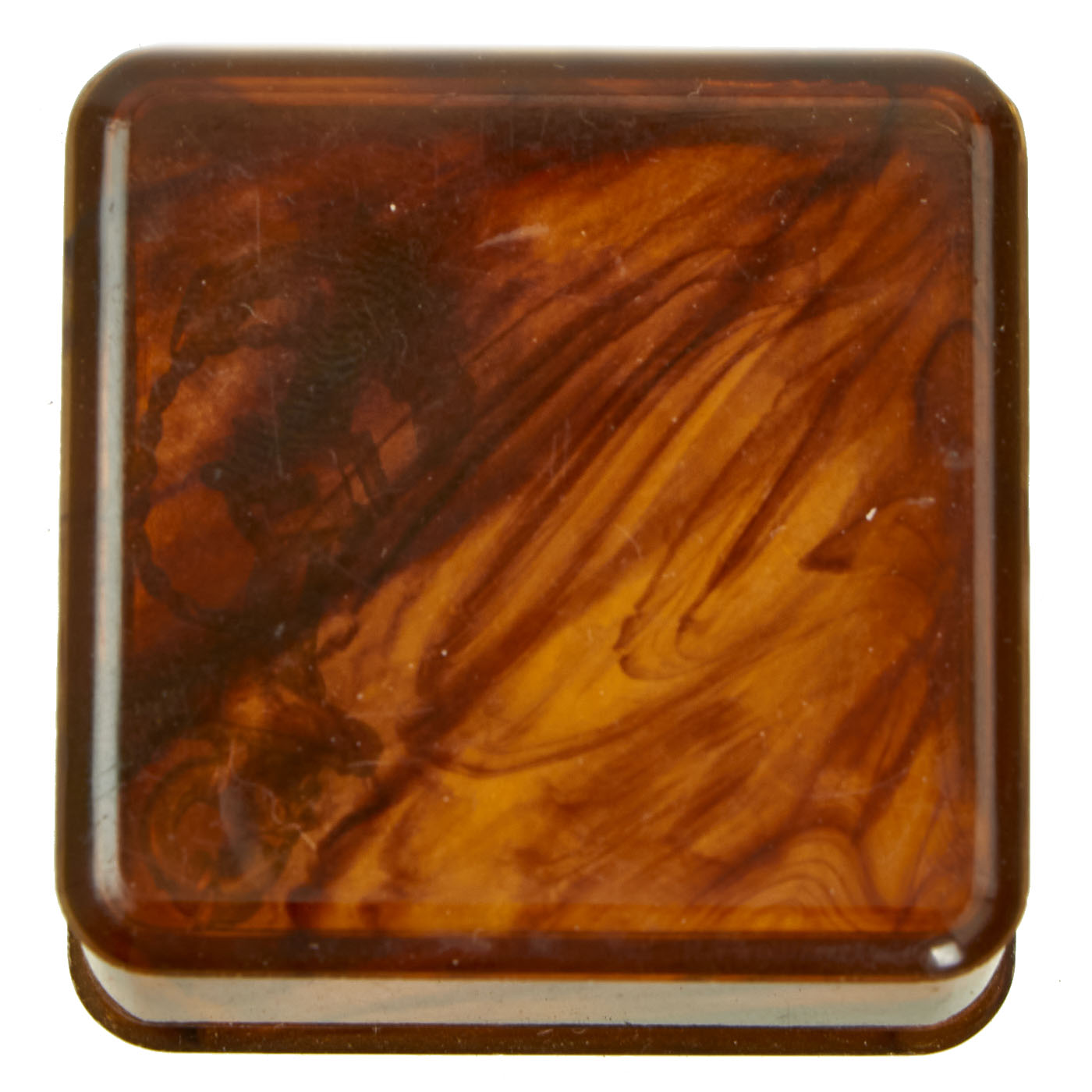 The brooch comes in a 1 1/2" x 1 1/2" x 9/16" "tortoise shell" acrylic box, which has padding inside to protect the brooch.