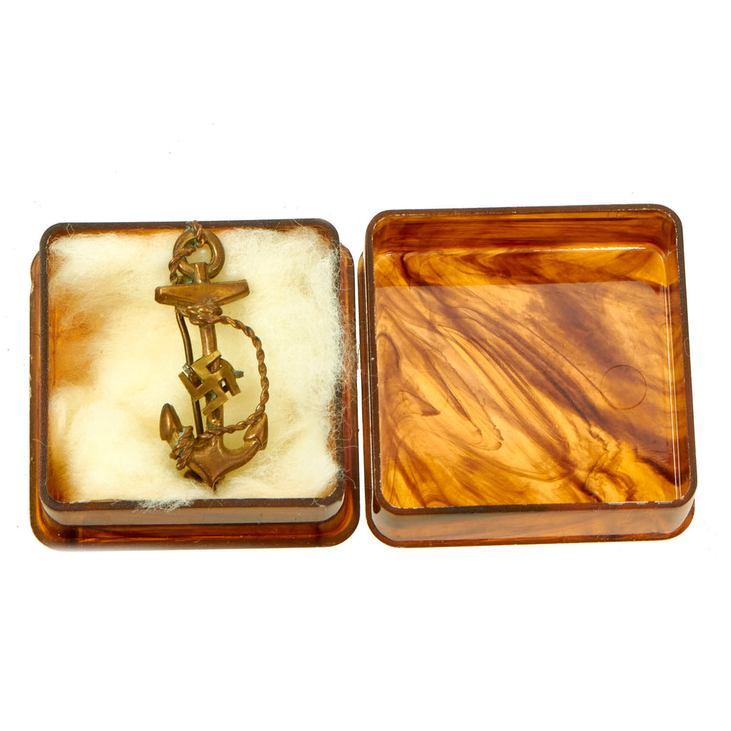 Original Item: One of a Kind. "Sweetheart" items to give to your steady girl, fiancé, or wife were used around the world as gifts when servicemen went off to war. Clearly the Germans in WWII used these items as well, though as with many things during the NSDAP period, the party icons were added so that the "sweetheart" could show their loyalty as well. This Kriegsmarine Navy sweetheart brooch measures about 1 1/4" long, and is in the form of a naval "Fouled Anchor" with the NSDAP Swas (hook cross) insignia attached. It looks to be made completely from brass, and has a vertical pinback, though it is slightly crushed and non functional.