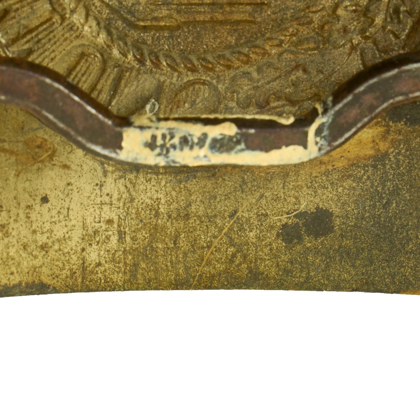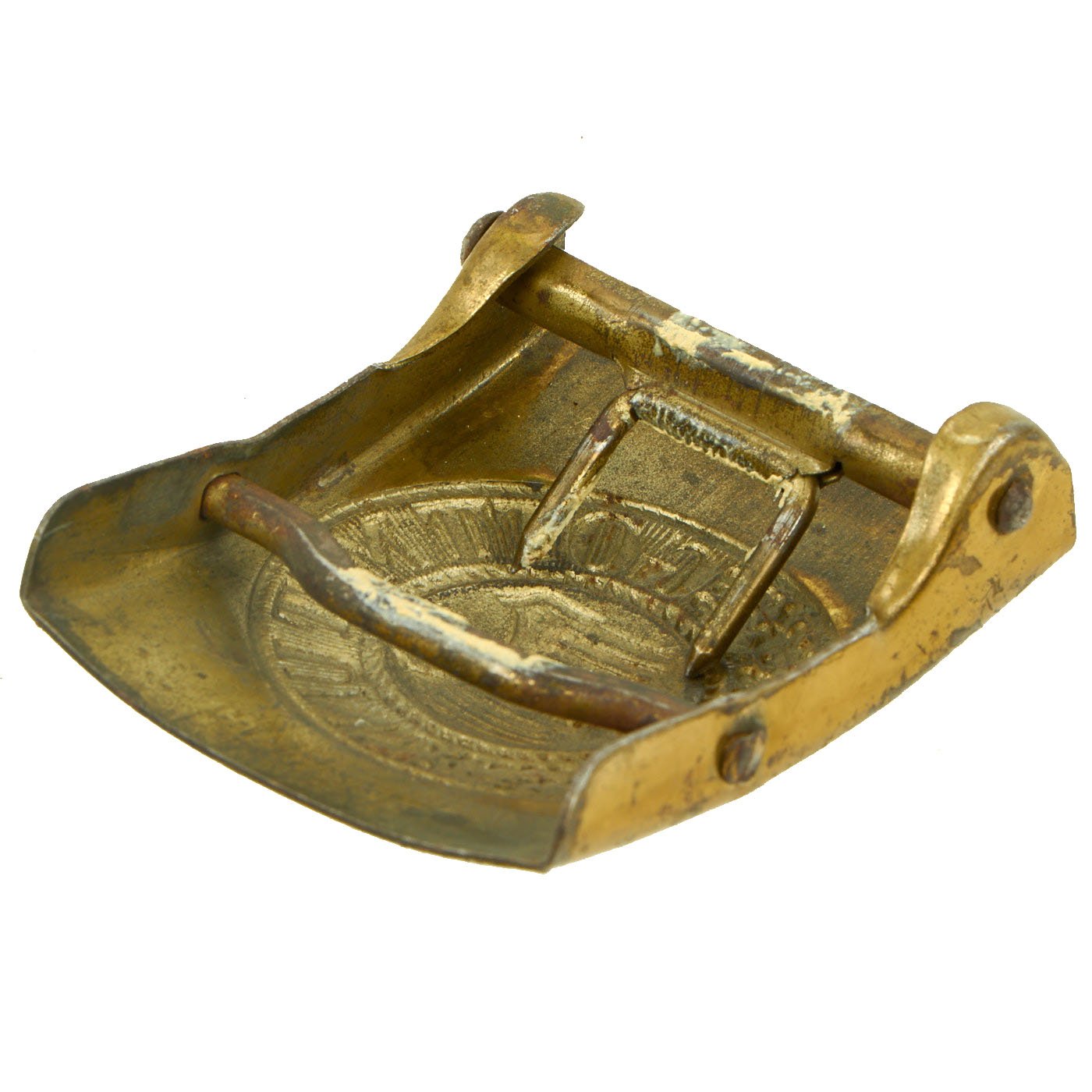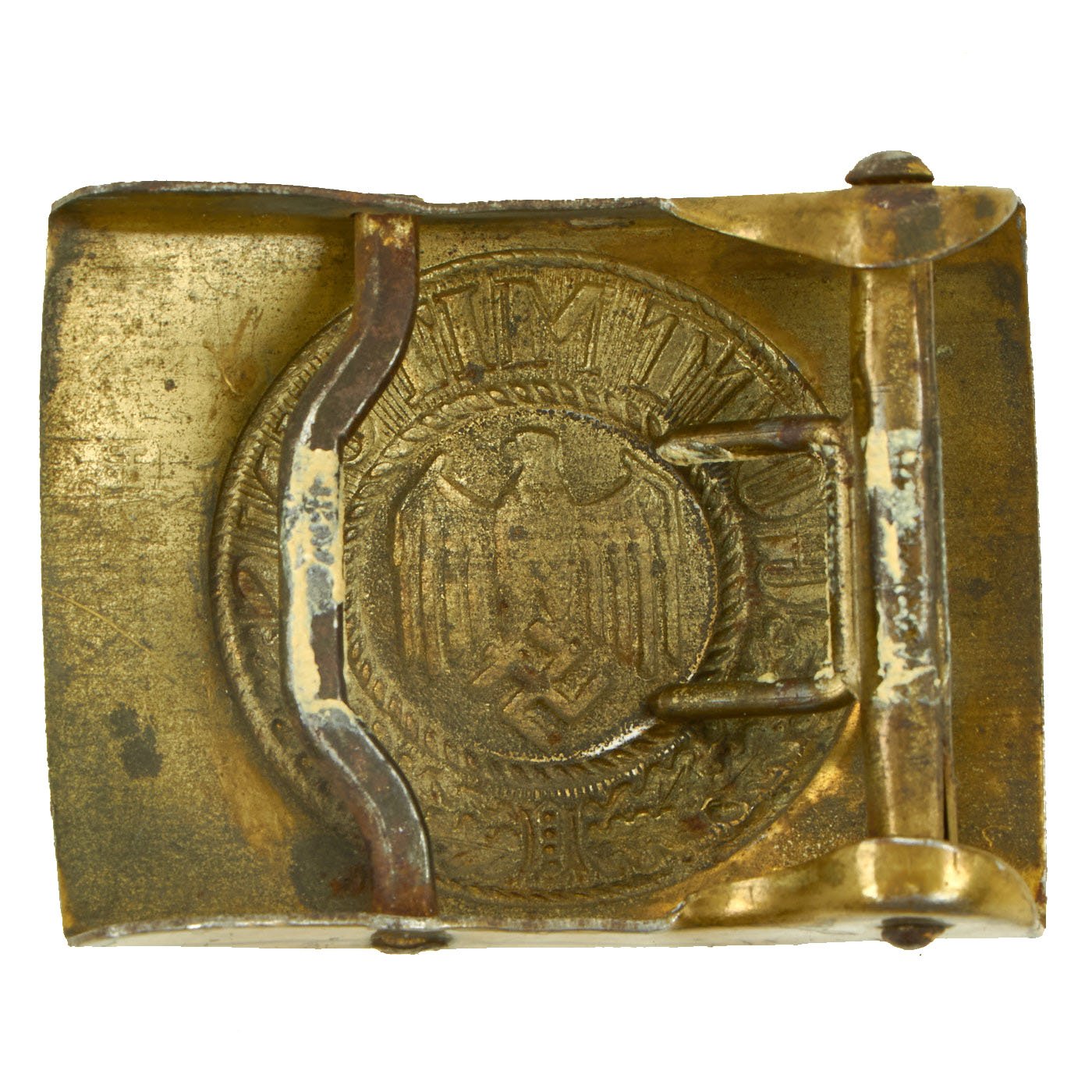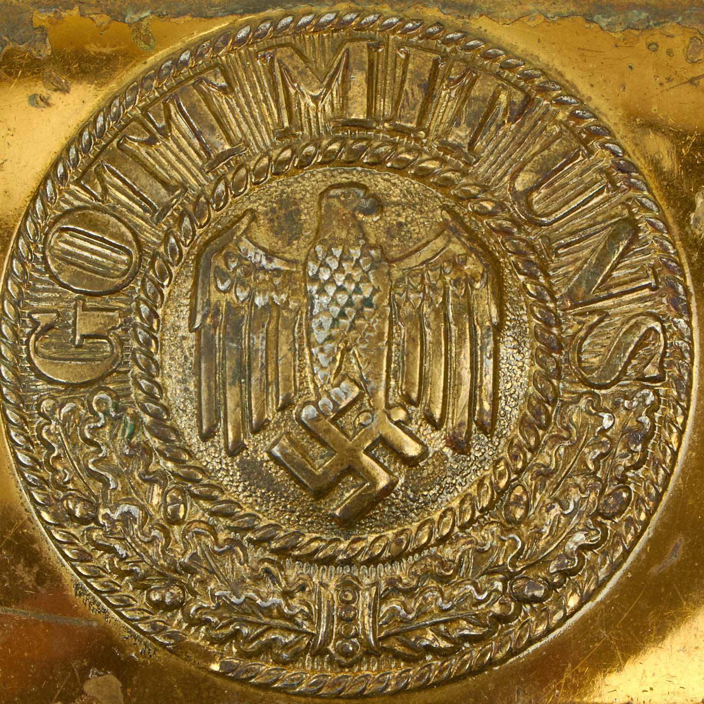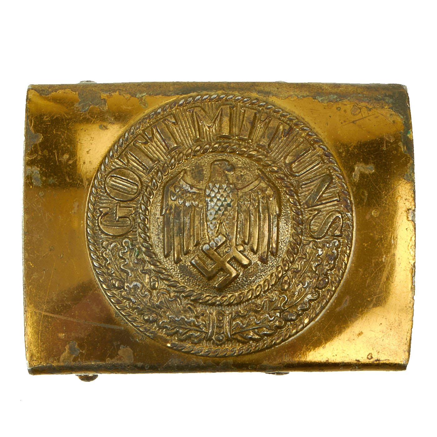 Original Item: Only One Available. This is a very good condition WWII German Wehrmacht Kriegsmarine (Navy) EM/NCO's gilt steel belt buckle (Koppelschloß). The buckle is embossed with the Wehrmacht motto GOTT MIT UNS ("God with us") surrounding a NSDAP Party Eagle. This is enclosed in a double rope border with oak leaves at the bottom. This is essentially the same design as the Heer steel construction box buckle, however instead of being painted field gray, it is gold washed, with a smooth background.