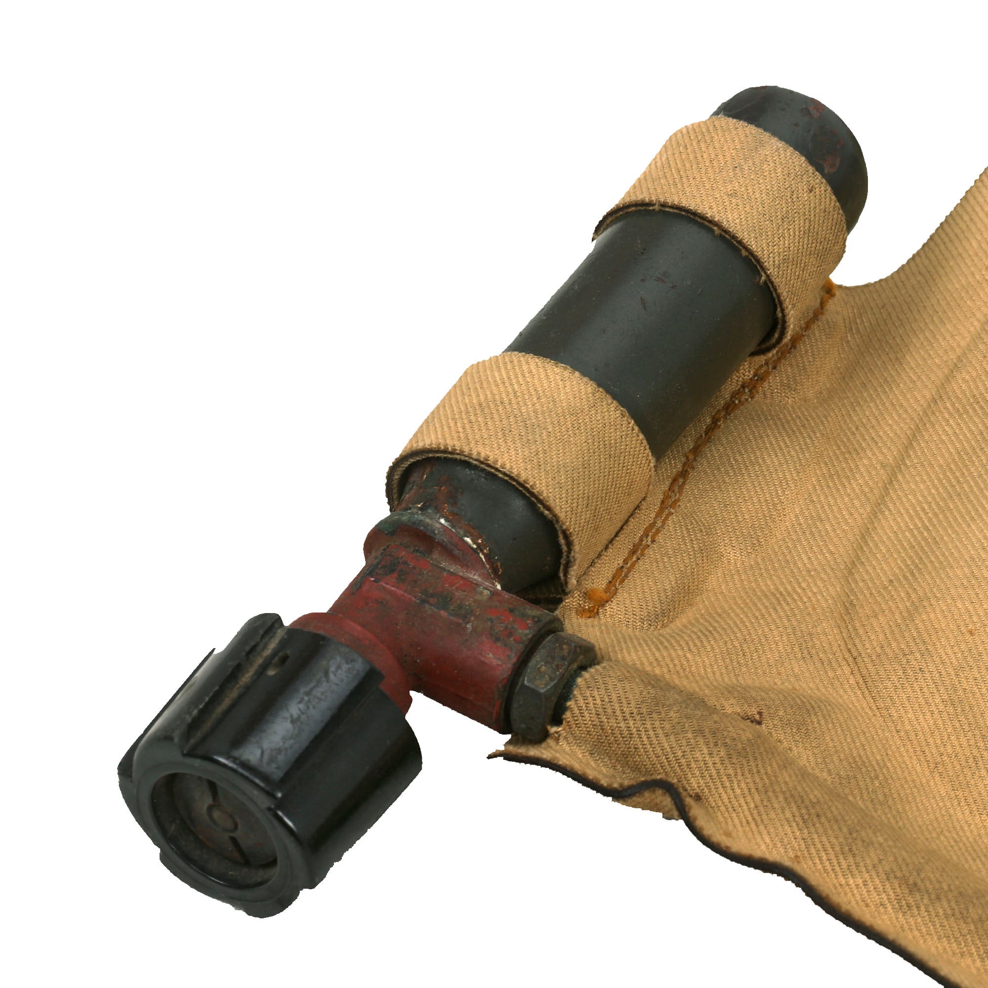 The pressurized canister is marked Preßluft 150 atü, (Compressed Air 150). The vest is in great shape overall without any serious flaws. Some of the metal fittings are oxidized as shown. The rubber tube in the middle has broken off as shown. Comes ready for further research and display!