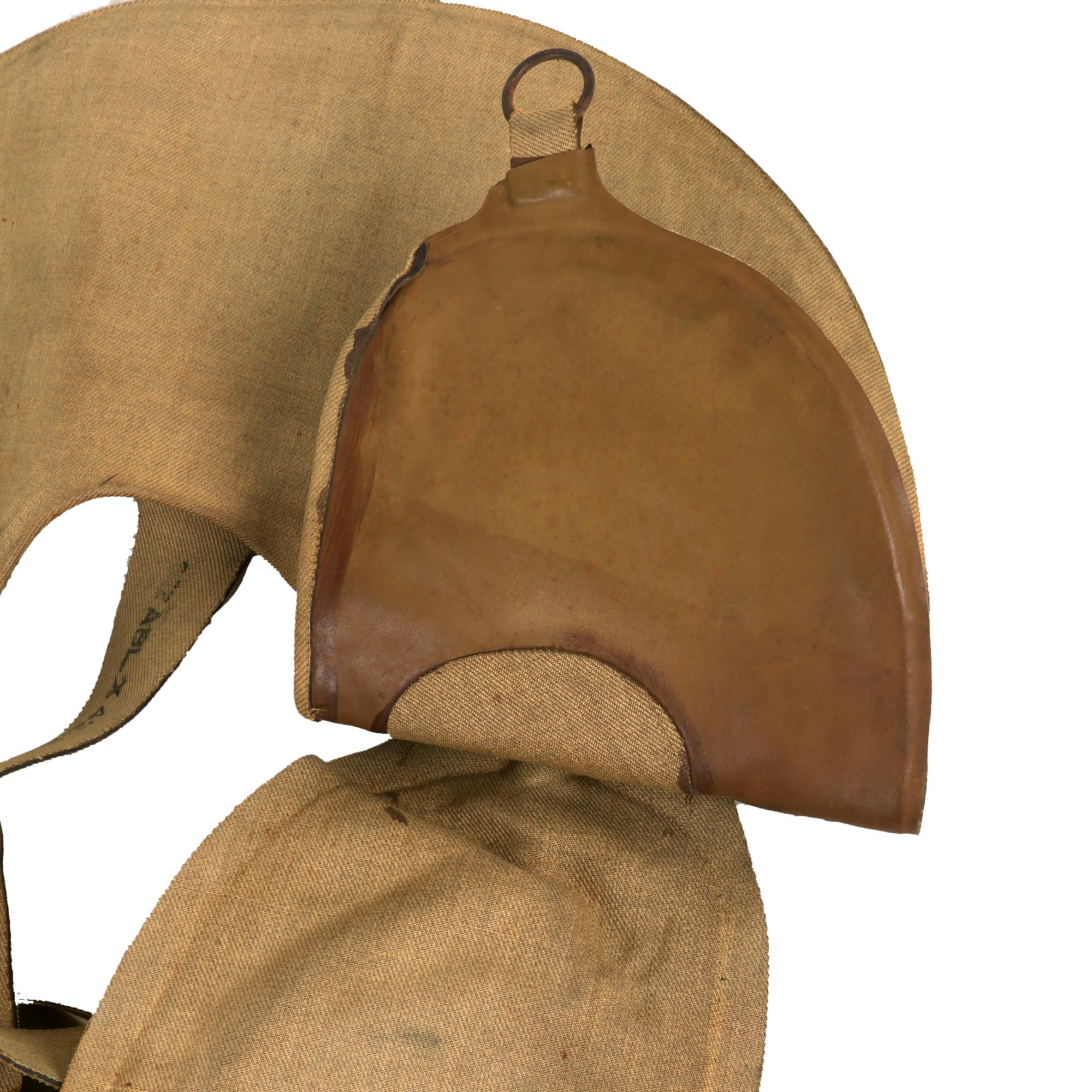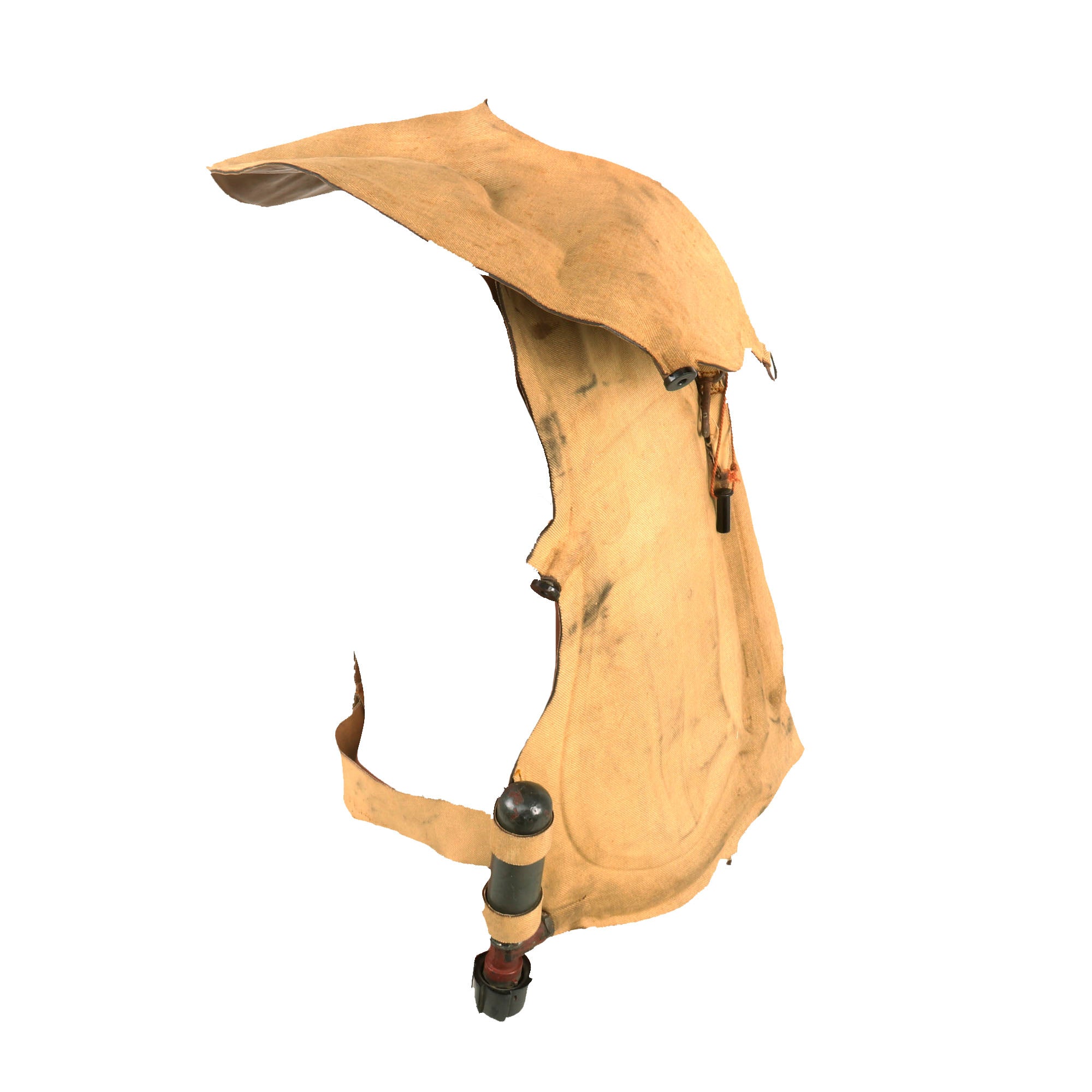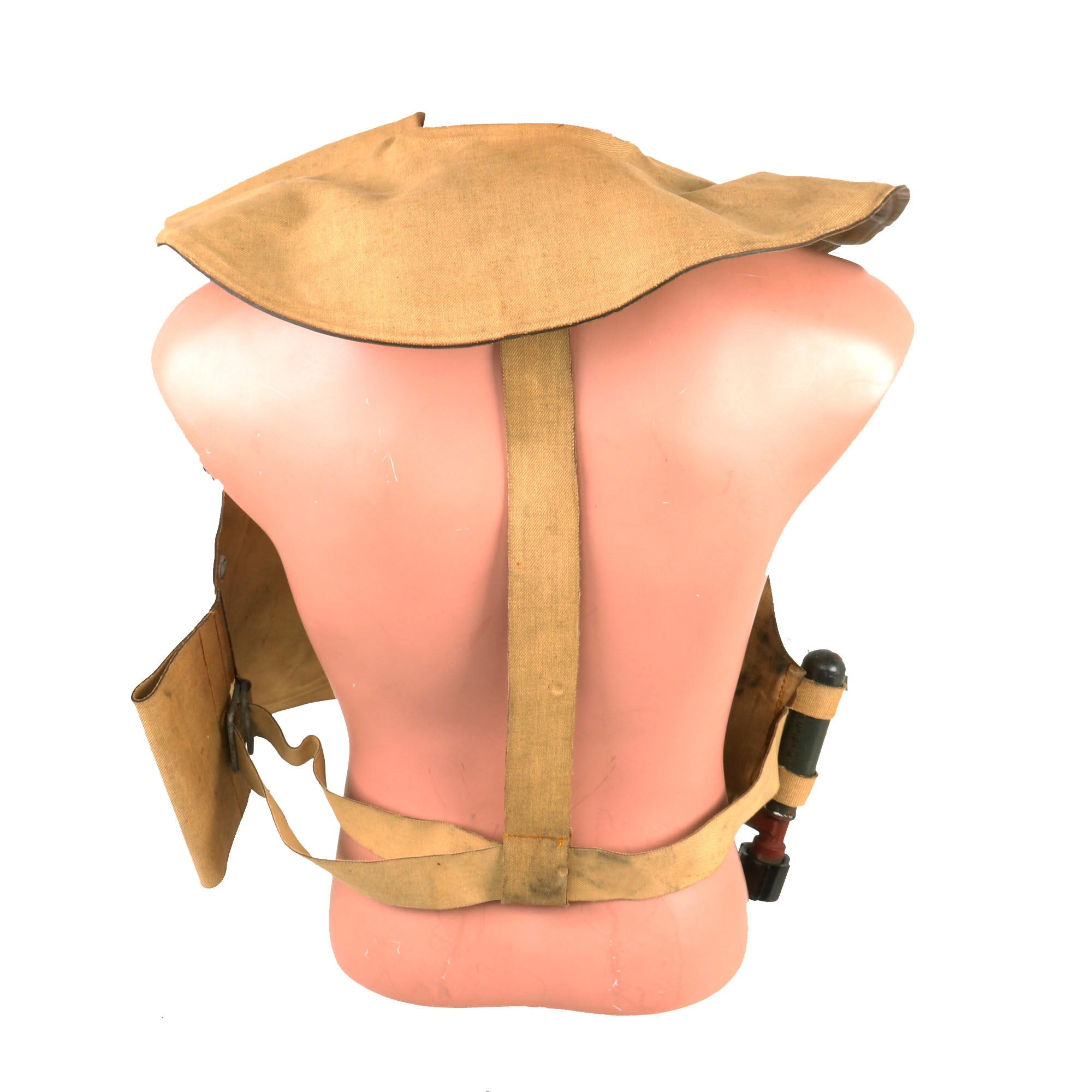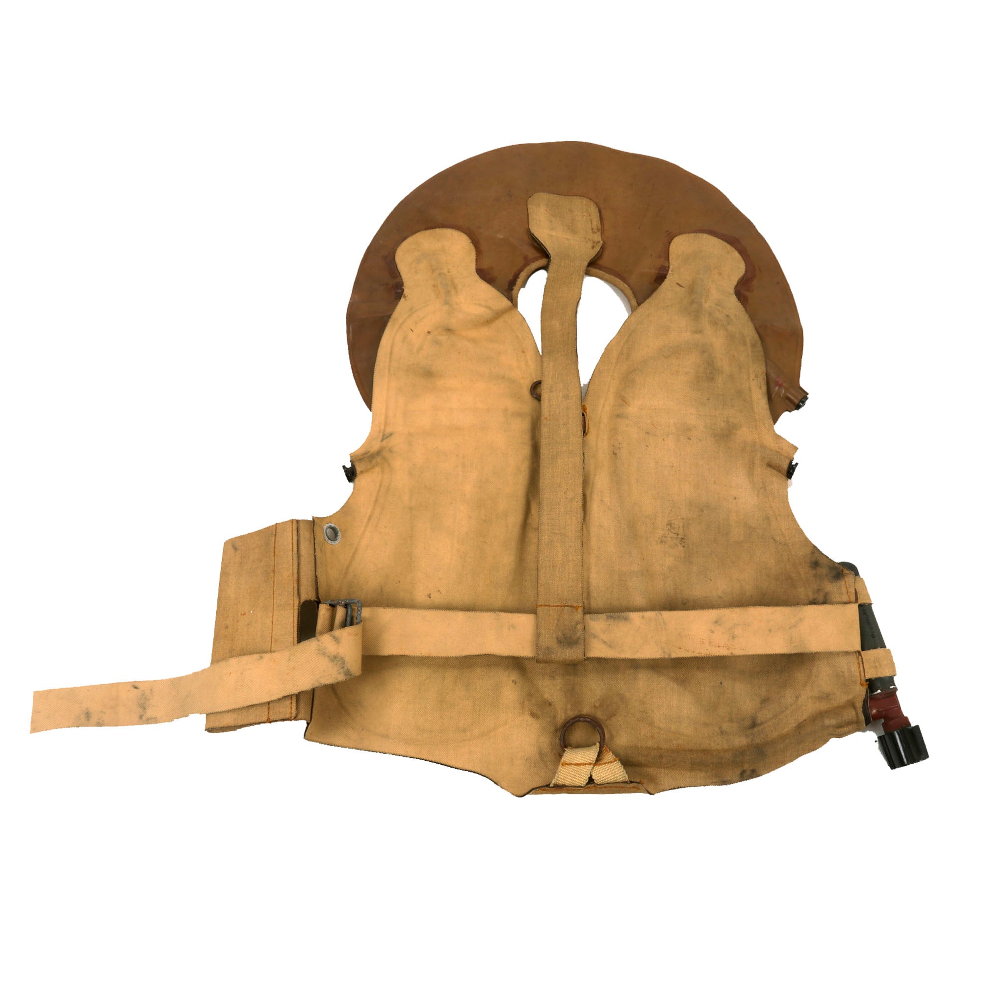 Original Item: Only One Available. This is a very good condition rubberized life vest with an original air cylinder. The vest is mostly complete, and still retains the securing strap, though some of the compartment plugs are missing, and the mouthpiece on the manual inflation tube has broken off. It is marked on the rear securing strap: