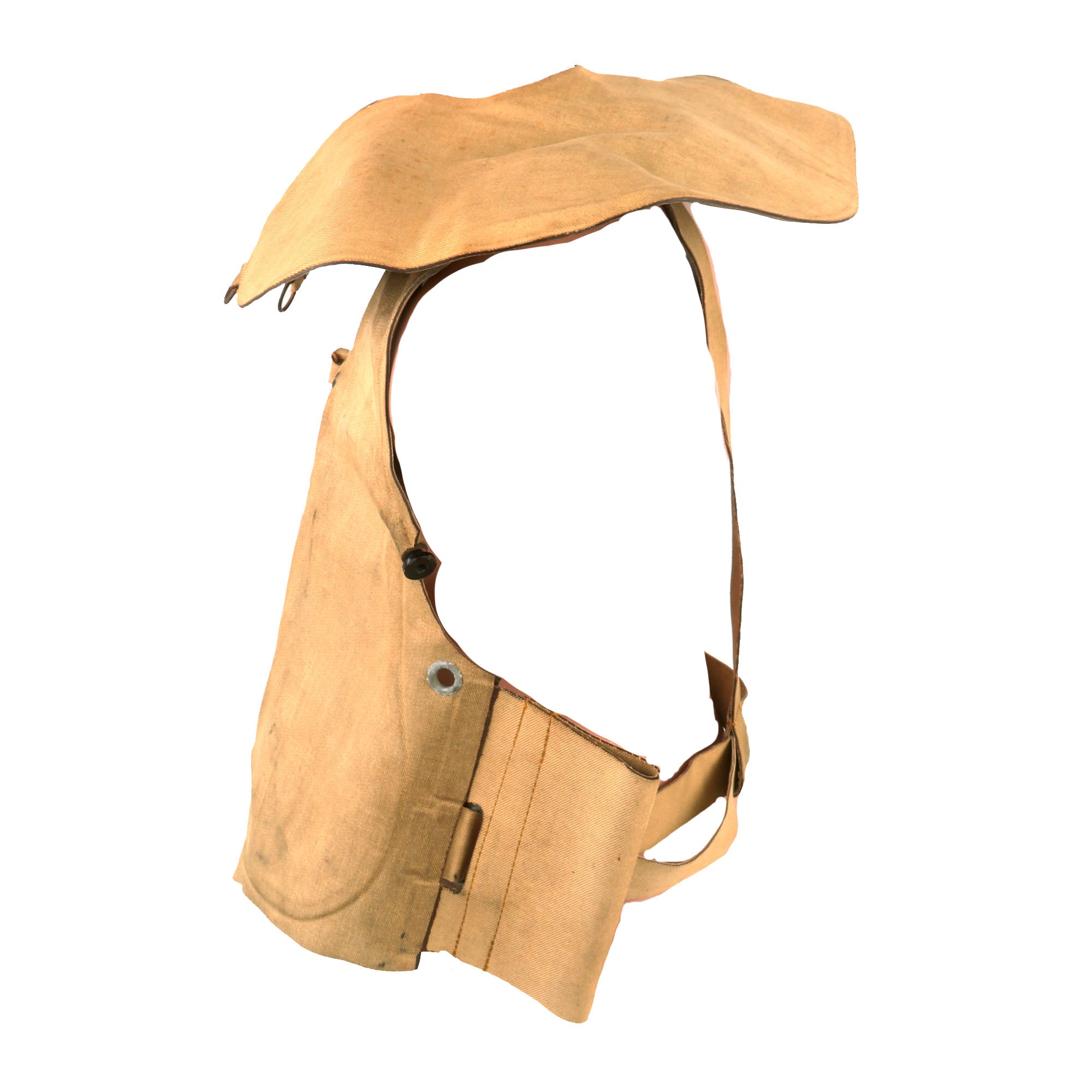 The vest features a semi-circular neck cut-out with a central, forward "V" slash, a full front panel, a large semi-circular neck and shoulder panel and an opened back and sides. The front panel features two, large, vertically oval, air bladders while the neck and shoulder panel has a single, large air bladder. All three of the air bladders have a small, opened port with an inserted, molded, black bakelite stopper.