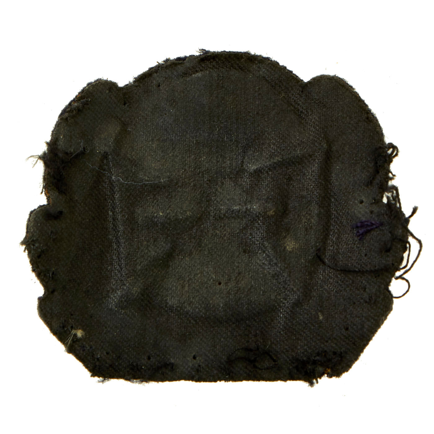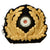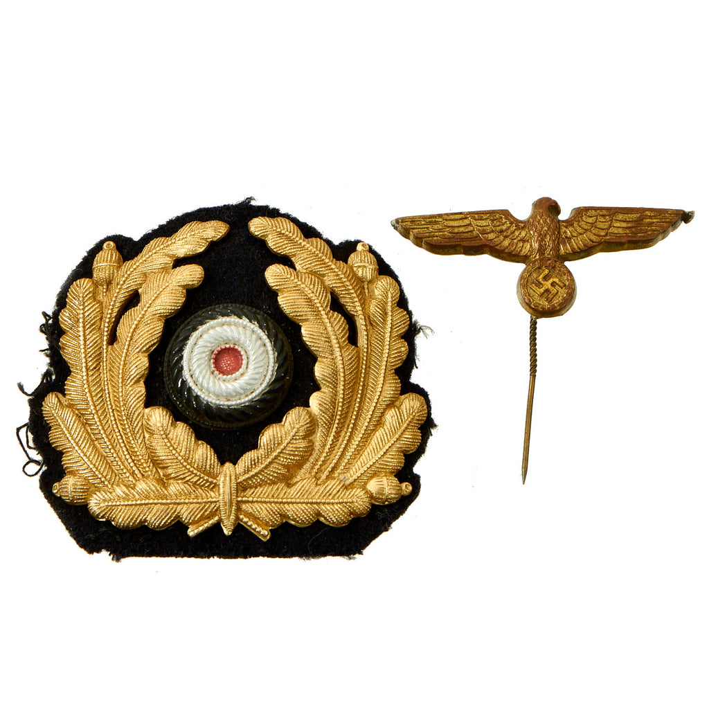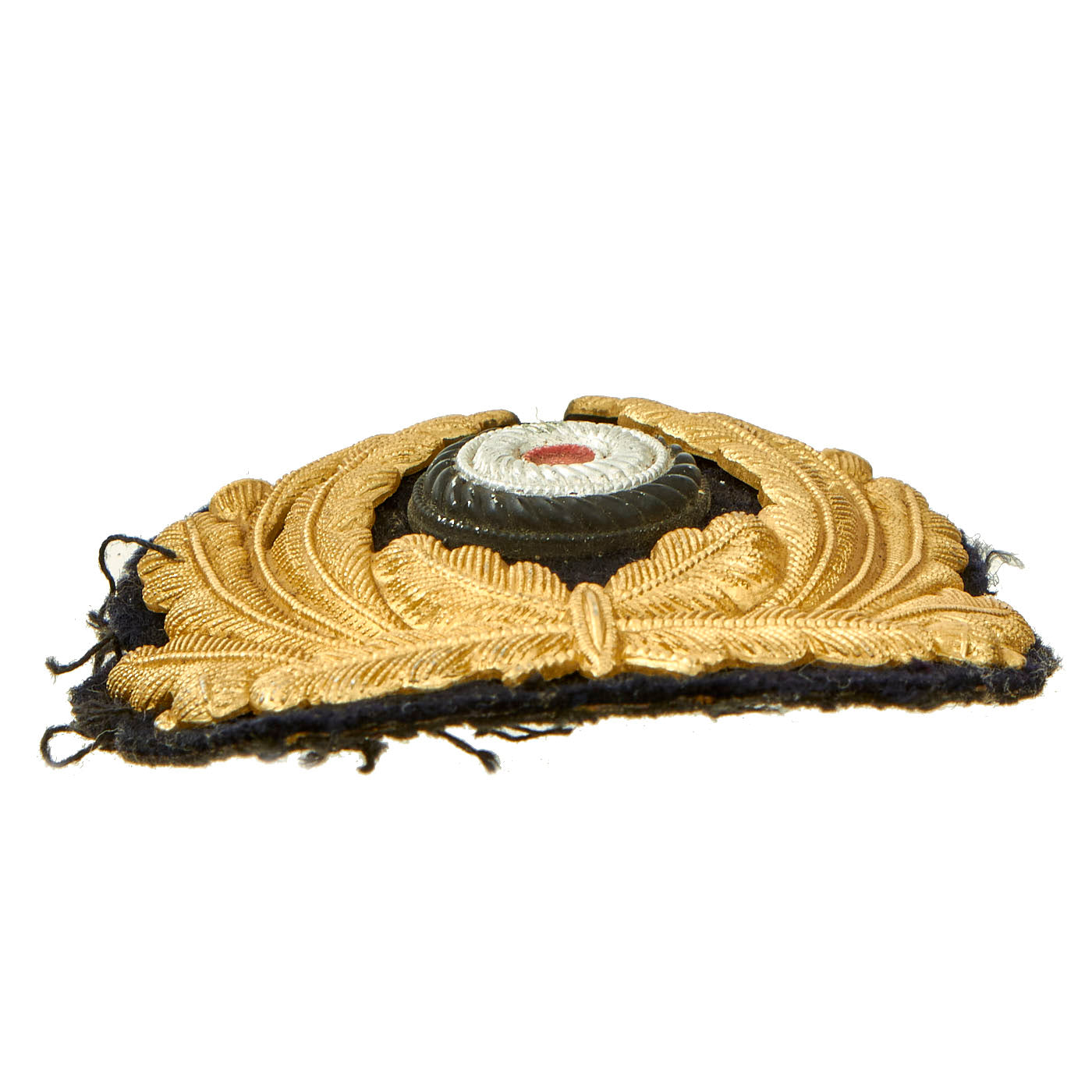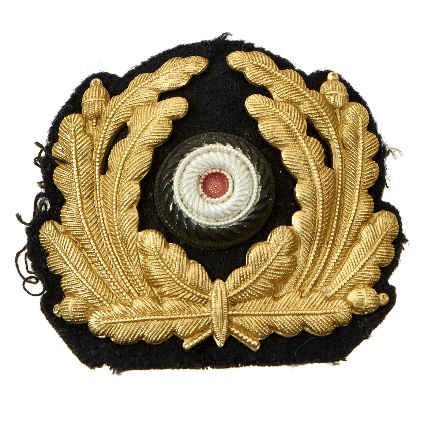 - NCO Visor Cap Wreath and Cockade: stamped and plated metal oak-leaf wreath on a cut-out, padded dark navy blue wool base. The wreath encompasses a stamped metal national tri-color cockade, with the paint still mostly intact. It still has the fabric backing, but there are signs that it was installed on a cap band at some point.