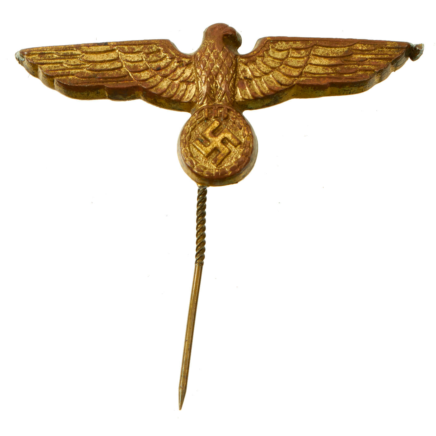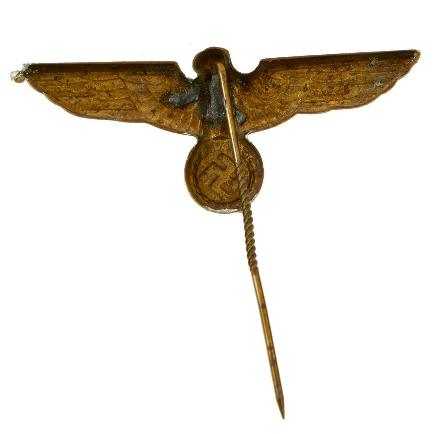 - NCO Visor Cap Eagle: Nice quality, stamped visor cap eagle with out-stretched wings, clutching a wreathed, canted swas in its talons, with a long attachment pin on the bottom. It looks to originally have had a gold wash over the brass, which has now partly oxidized and flaked away.