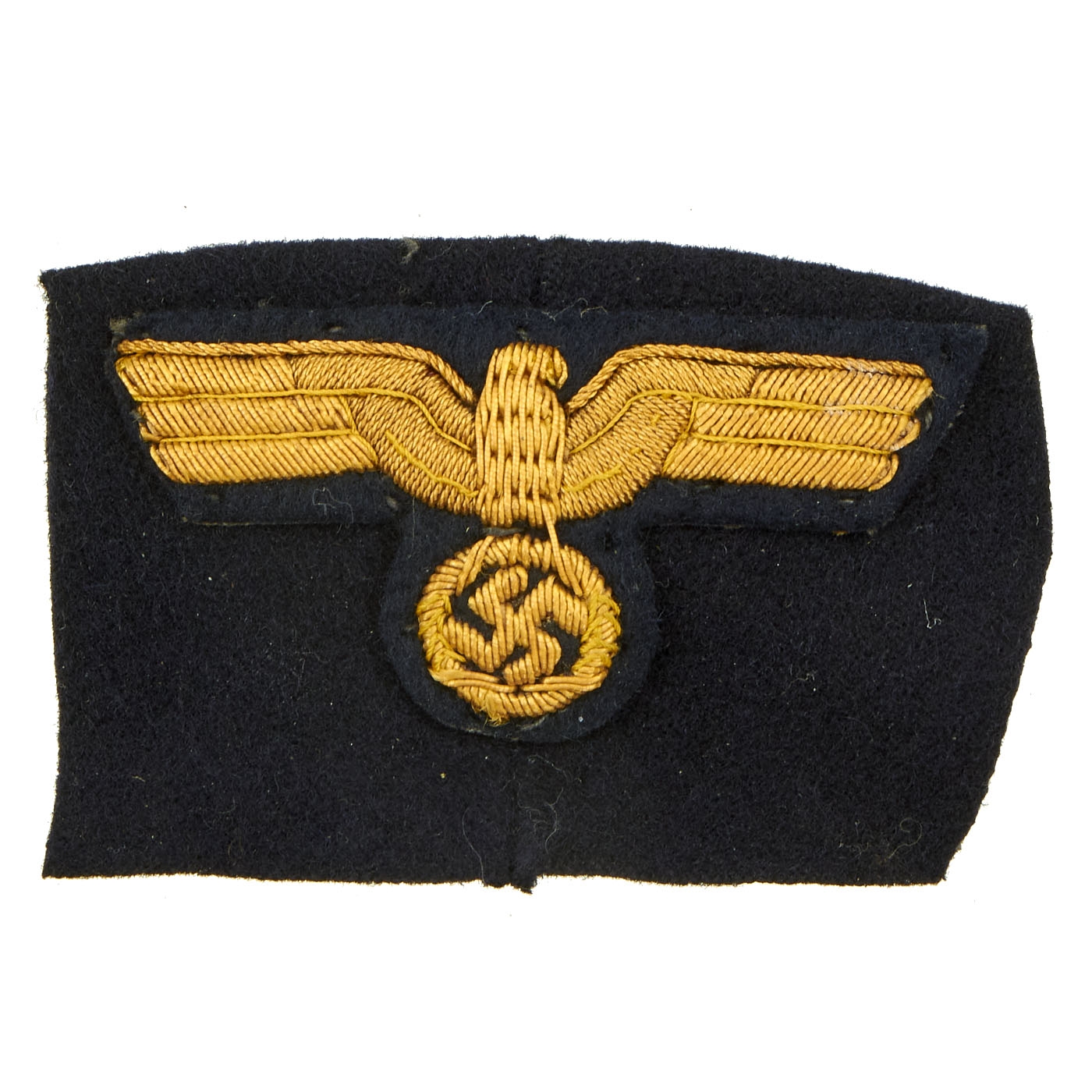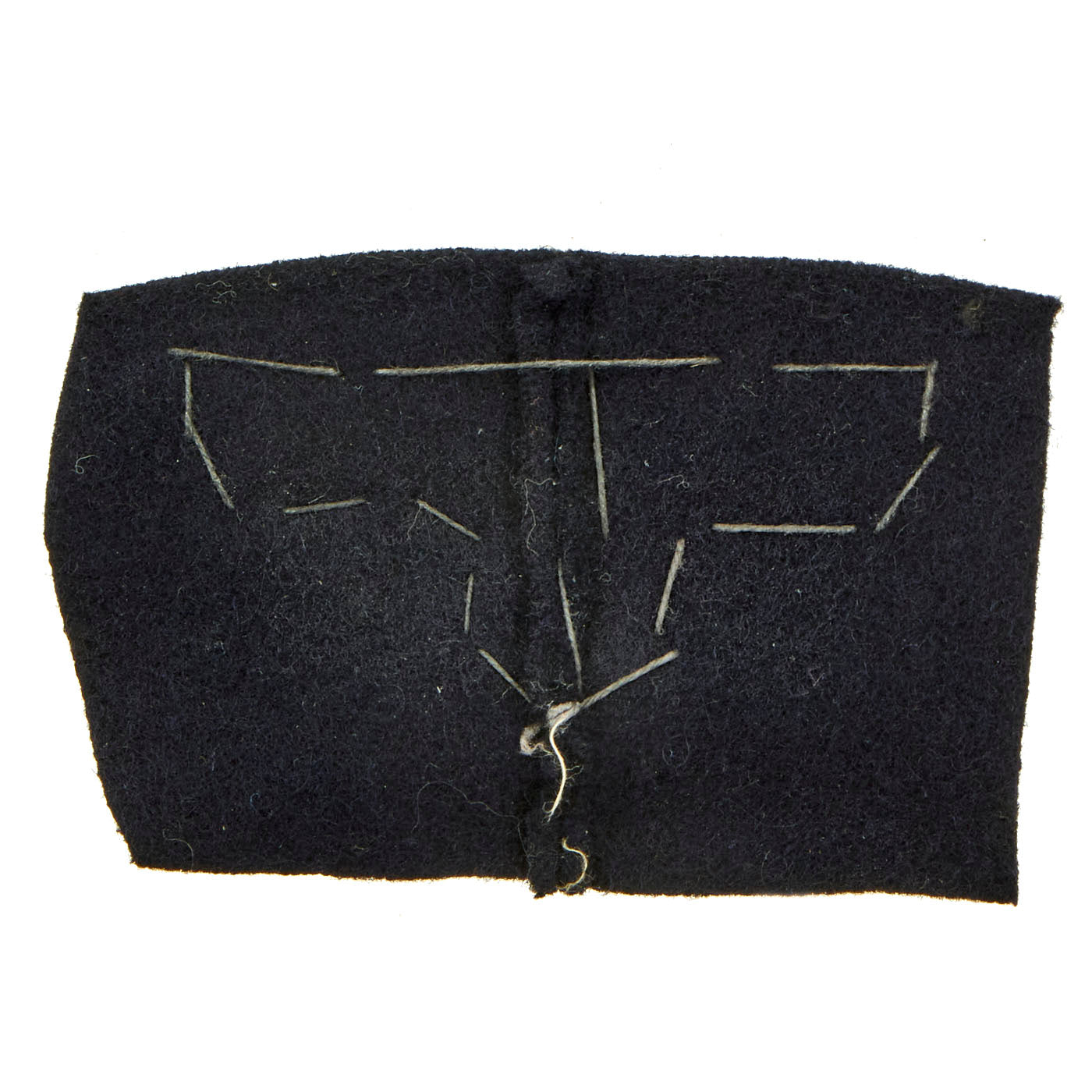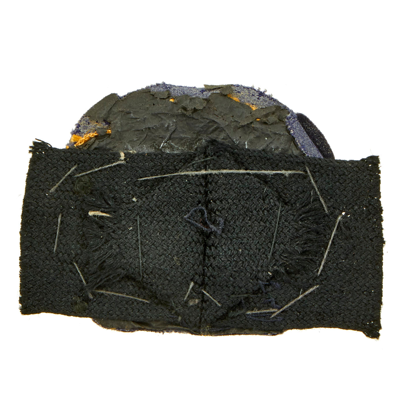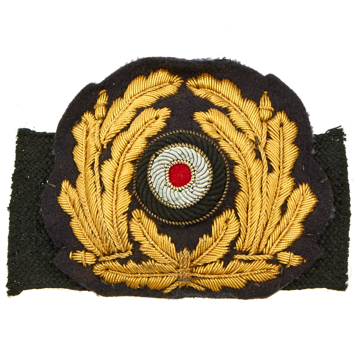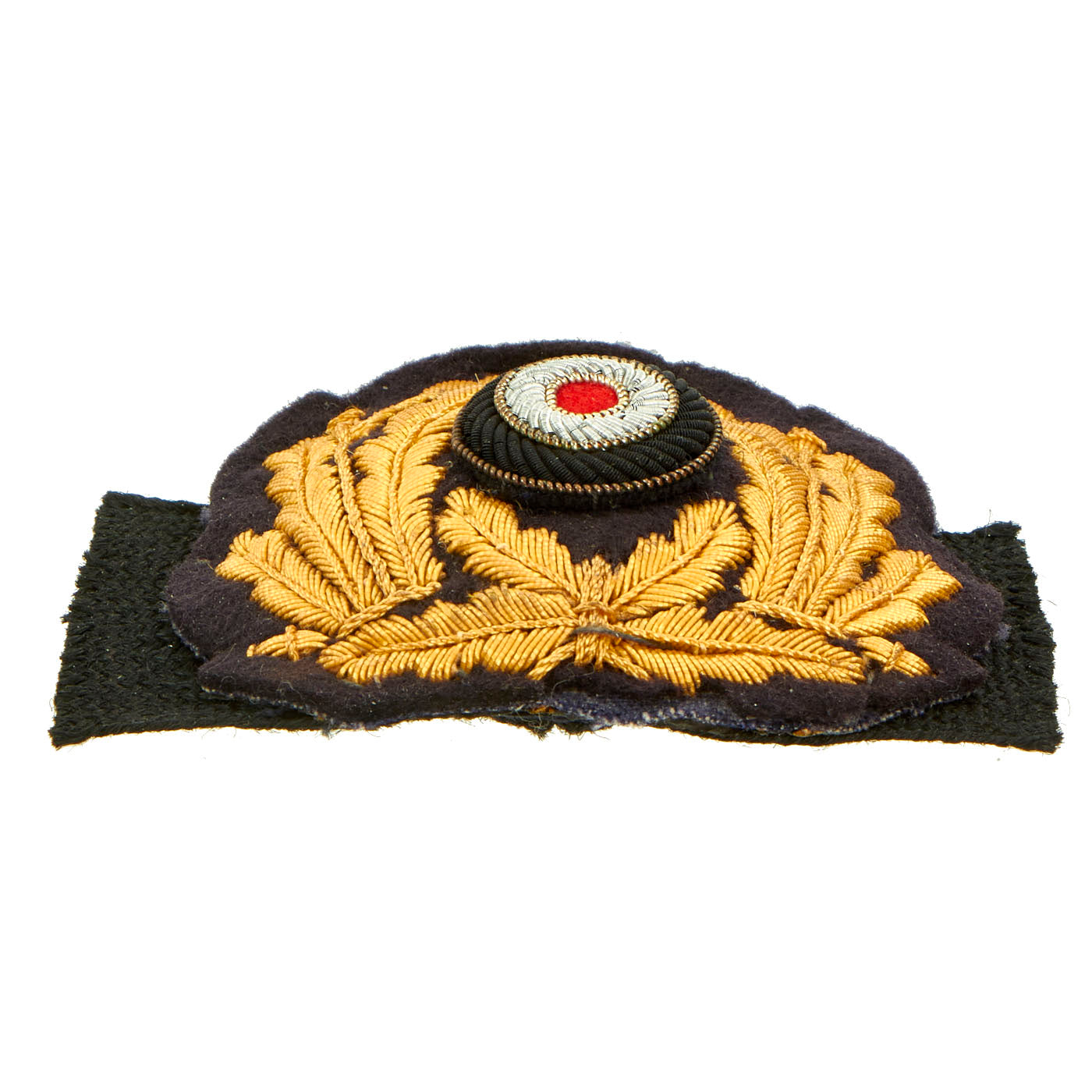 - Officer’s Visor Cap Wreath and Cockade: 1935 pattern, hand embroidered oak-leaf wreath in gold celleon threads with gilt accent threads on a cut-out, padded navy blue wool base. The wreath encompasses a hand embroidered national tri-color cockade with an inserted red felt centerpiece. Still attached to a piece of the original cap band.