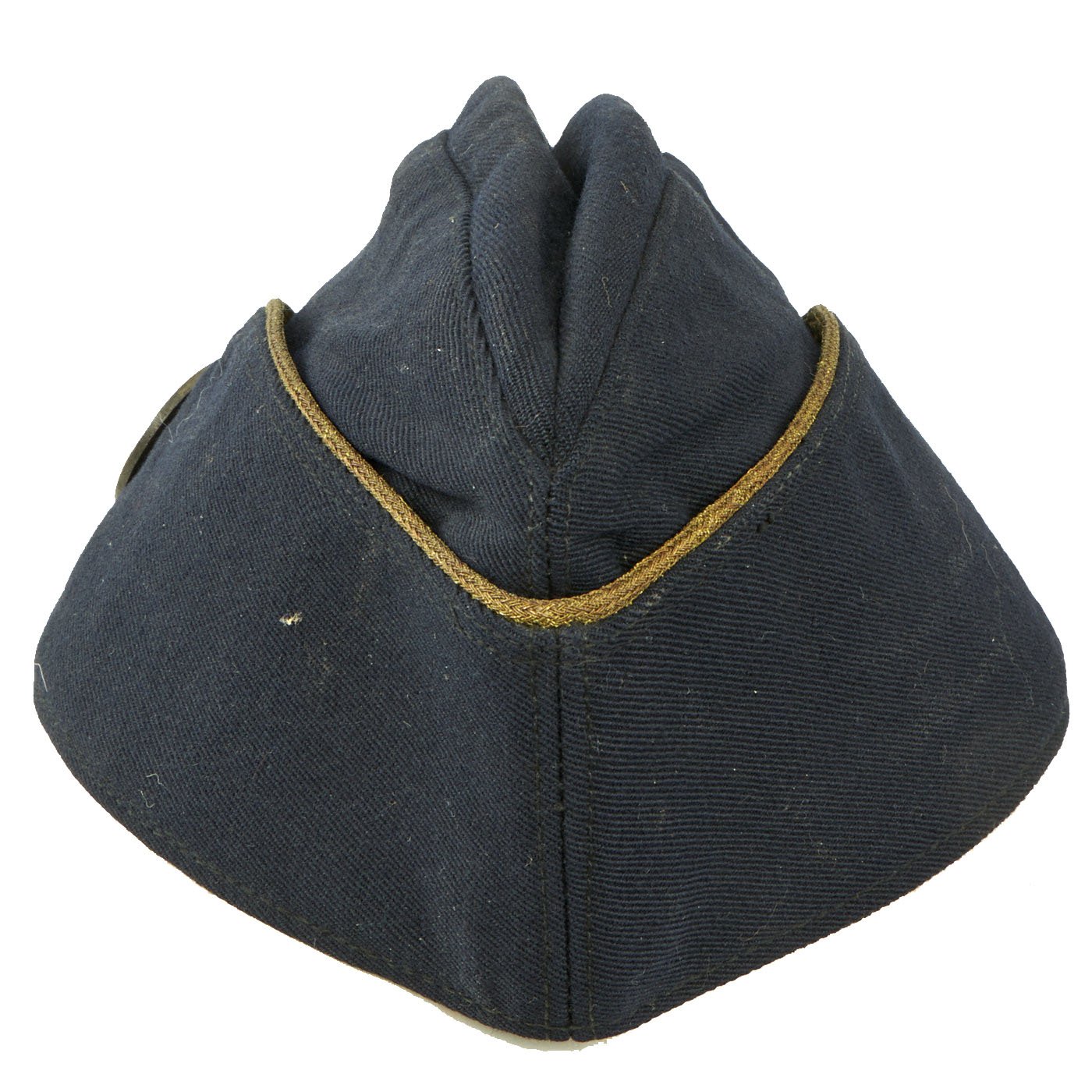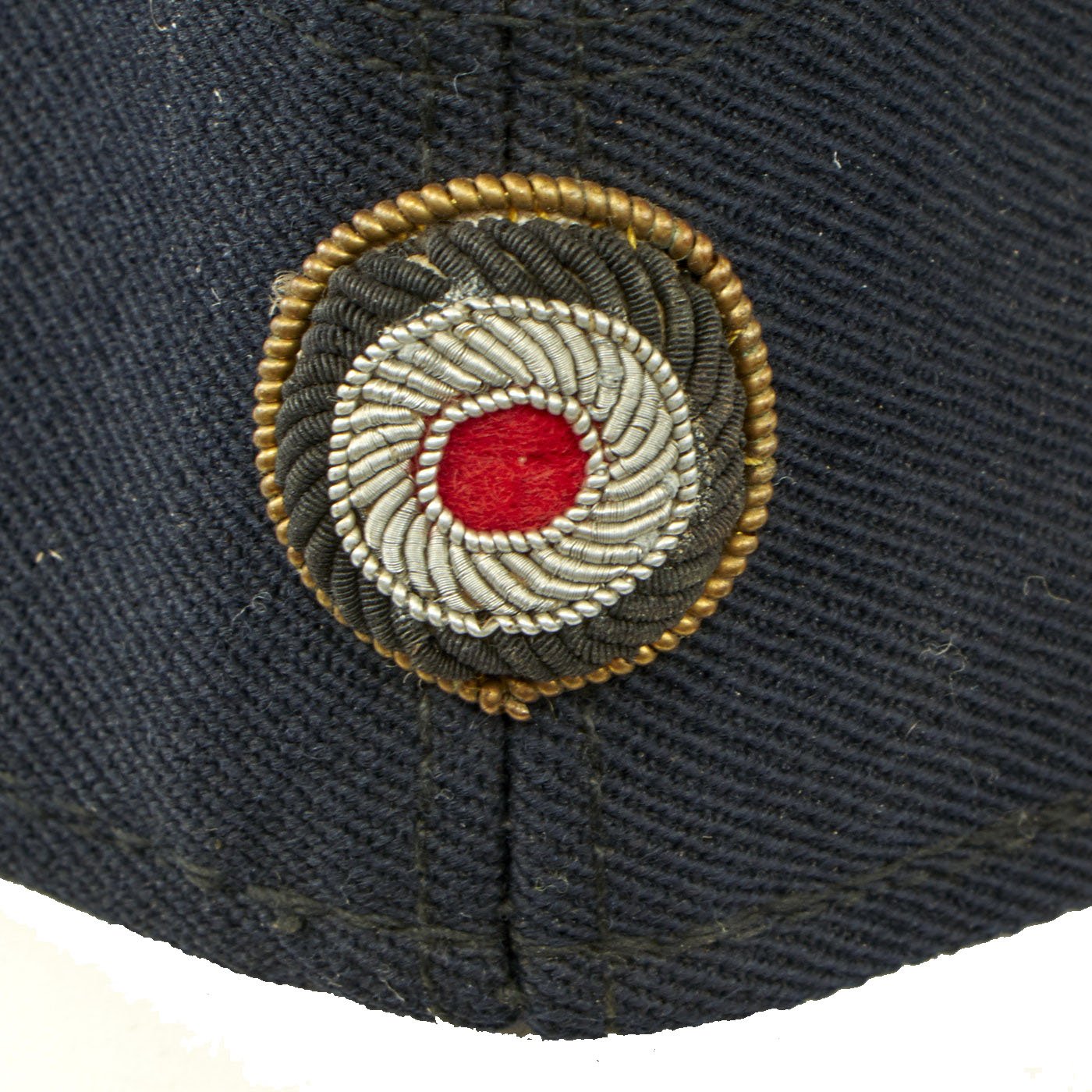 The cap is constructed of a navy blue light canvas exterior, and features fine hand embroidered bullion eagle and tri-color cockade emblems sewn to the front. It has gold bullion piping around the circumference, indicating officer issue. The interior is navy blue rayon, and is in excellent condition. There are no markings, so this was most likely a bespoke cap for the officer.